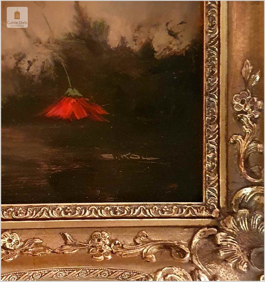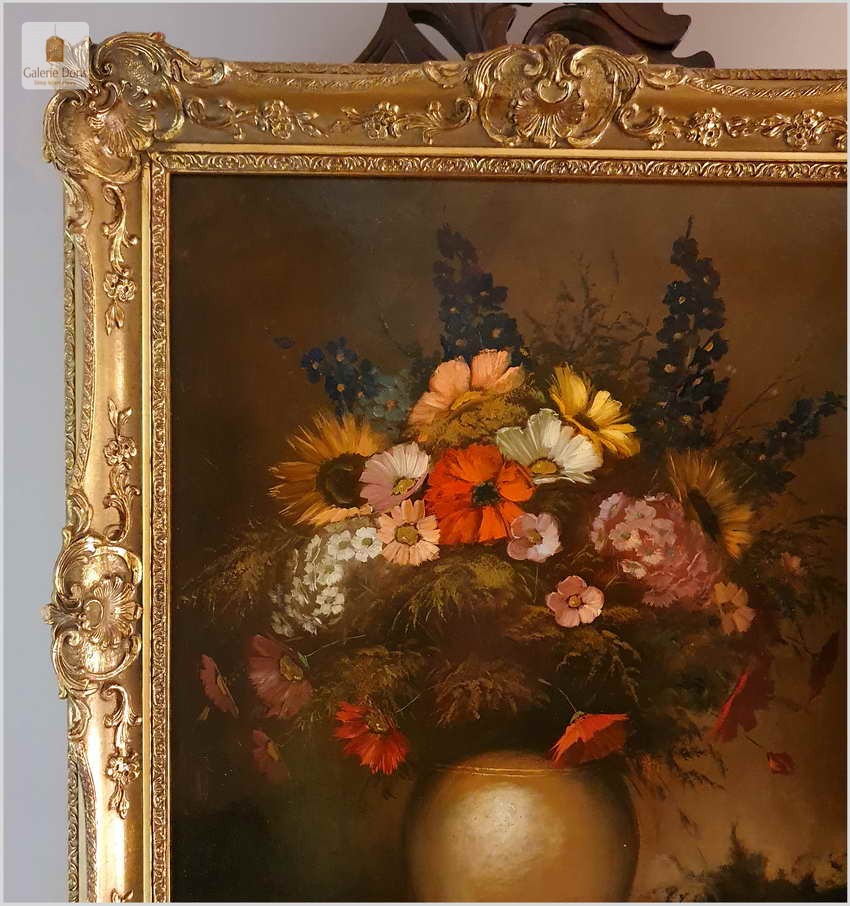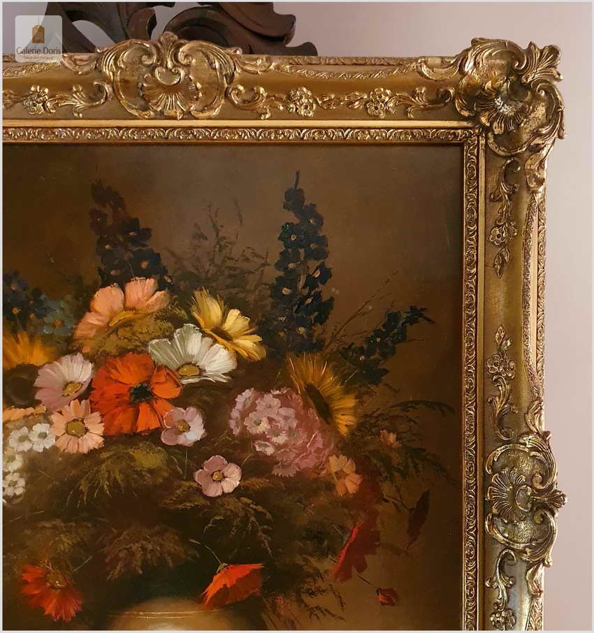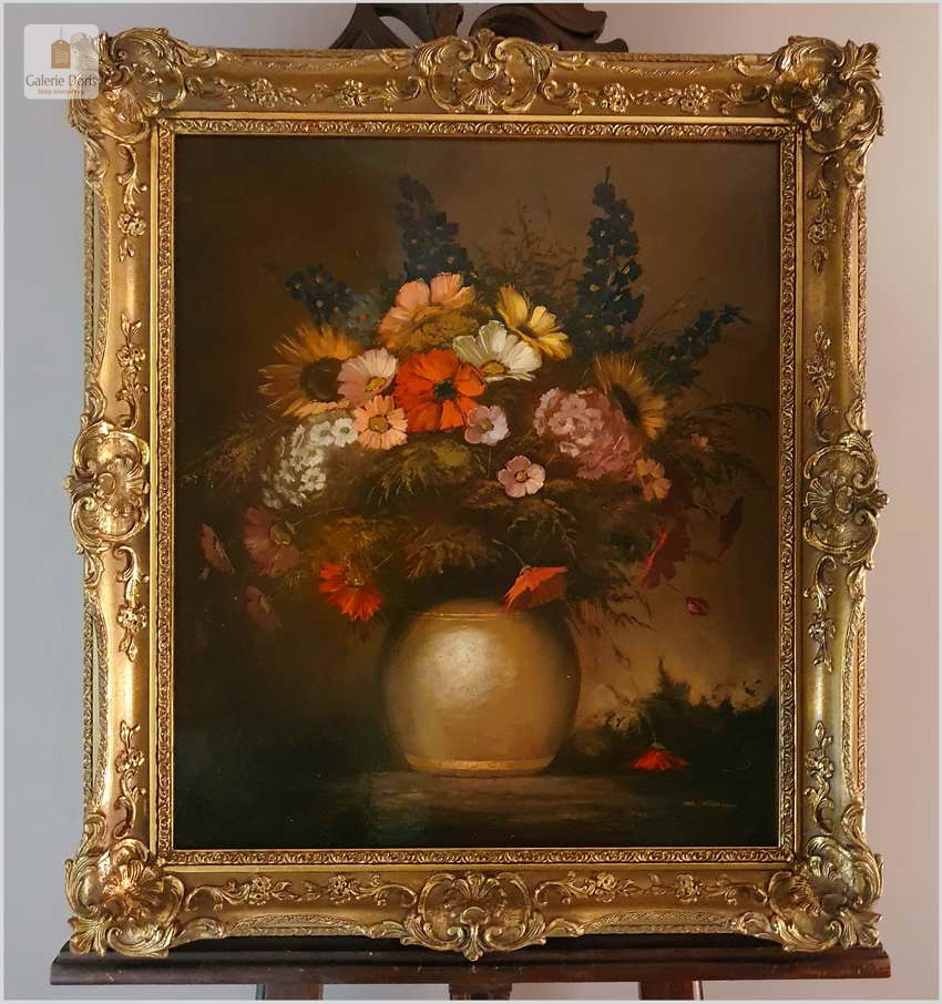 Oryginalny, niezwykle kunsztownie malowany obraz olejny na płycie, przedstawiający bukiet barwnych kwiatów w wazonie. Autorem tej pracy jest Niemiecka malarka Koll. Obraz malowany w technice pędzla, struktura nałożonej farby wyczuwalna pod palcami. Całość oprawiona w oryginalną, przestrzenną ramę.