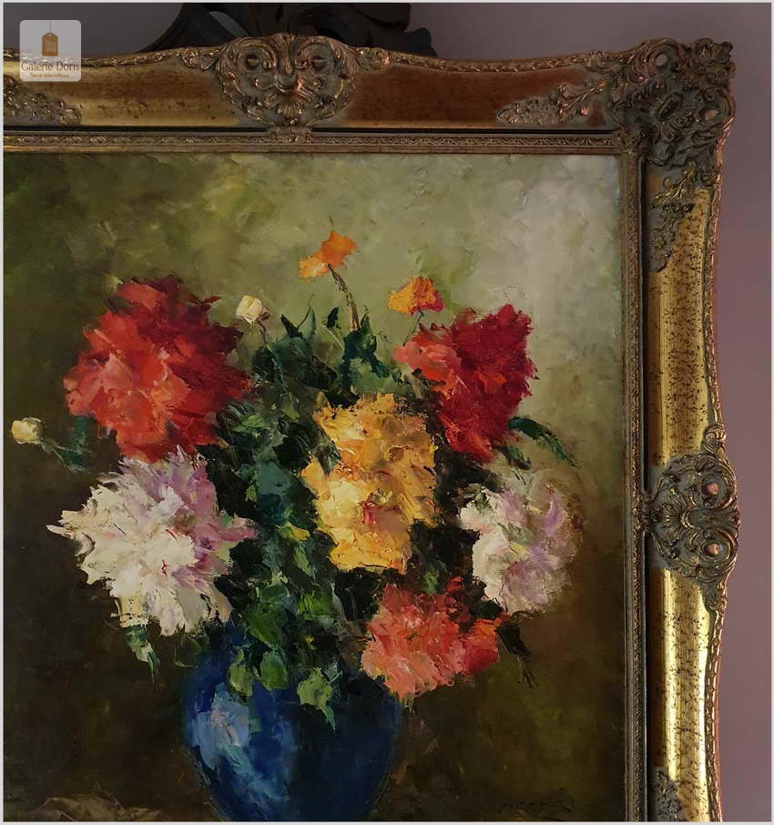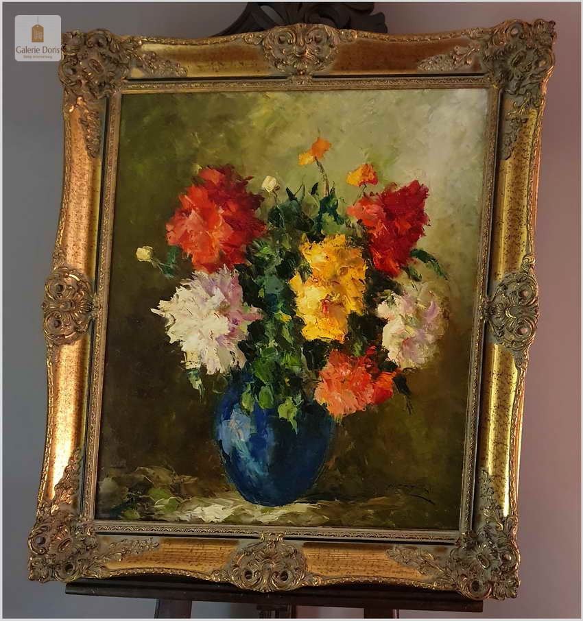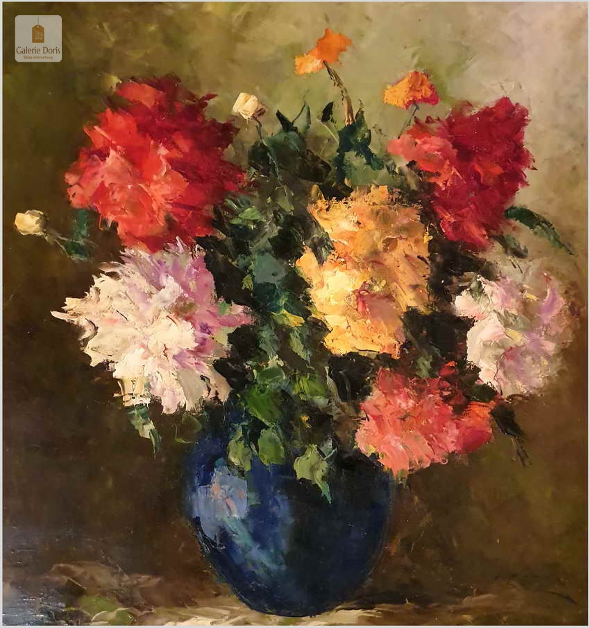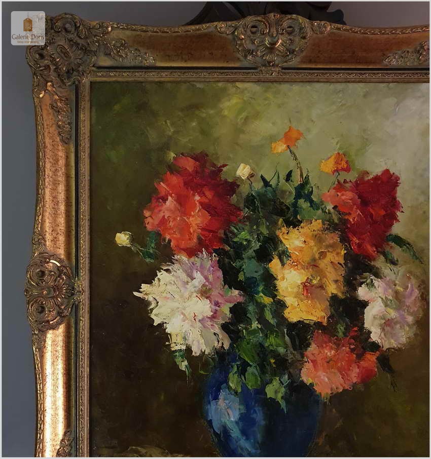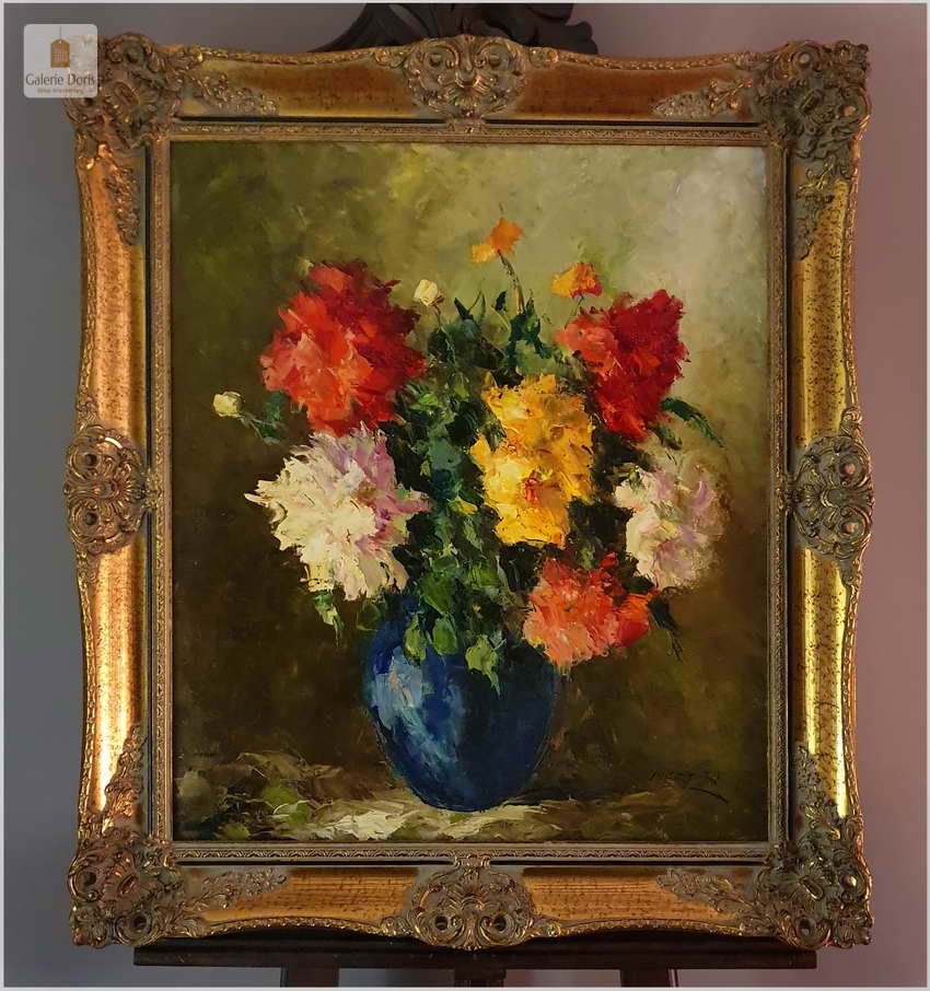 Przepiękny, duży stary obraz olejny namalowany na płótnie. Wspaniała martwa natura przedstawiająca śliczny bukiet kwiatów w niebieskim wazonie. Wyśmienita paleta kolorystyczna oraz subtelne efekty światłocieniowe doskonale oddają plastyczność kwiatów namalowanych w stylu zaliczanym do impresjonizmu.