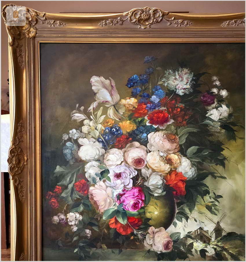 Polecamy wspaniały pałacowy w stylu baroku obraz olejny. Bogata kompozycja kwiatów, bardzo dekoracyjny ręcznie malowany obraz olejny "Bukiety kwiatów na kamiennym cokole", sygnowany "Garossa" w prawym dolnym rogu. Prawdopodobnie wykonany około 1950 roku lub wcześniej w stylu i wzorowany na dawnych mistrzach holenderskiego baroku. Wykonane w piękny, akademicki sposób dawnych mistrzów. Polecamy!