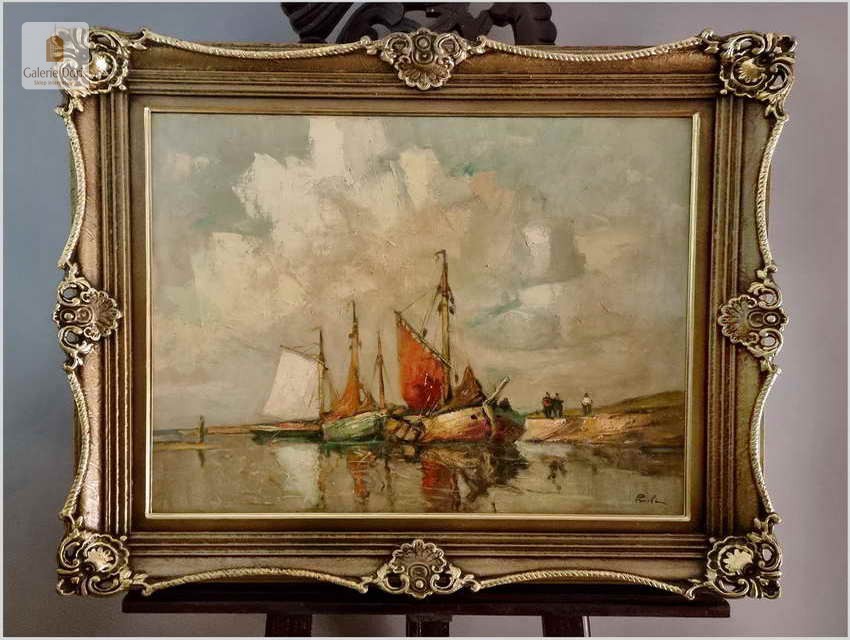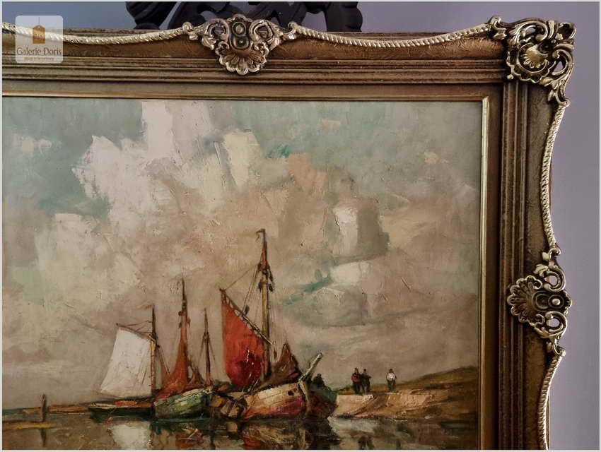 Typowy dla artysty motyw kutrów żaglowych ukazywanych przy brzegu, na redzie i w morzu. W tym przypadku przedstawiono powrót rybaków z połowów. Jest to bardzo barwne przedstawienie specyfiki rybołówstwa. W pracy pojawił się rzadko spotykany w twórczości tego malarza motyw postaci ludzkich. Obraz malowany mocnymi, odważnymi pociągnięciami pędzla bardzo dekoracyjny pejzaż morski.