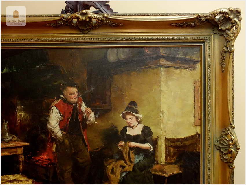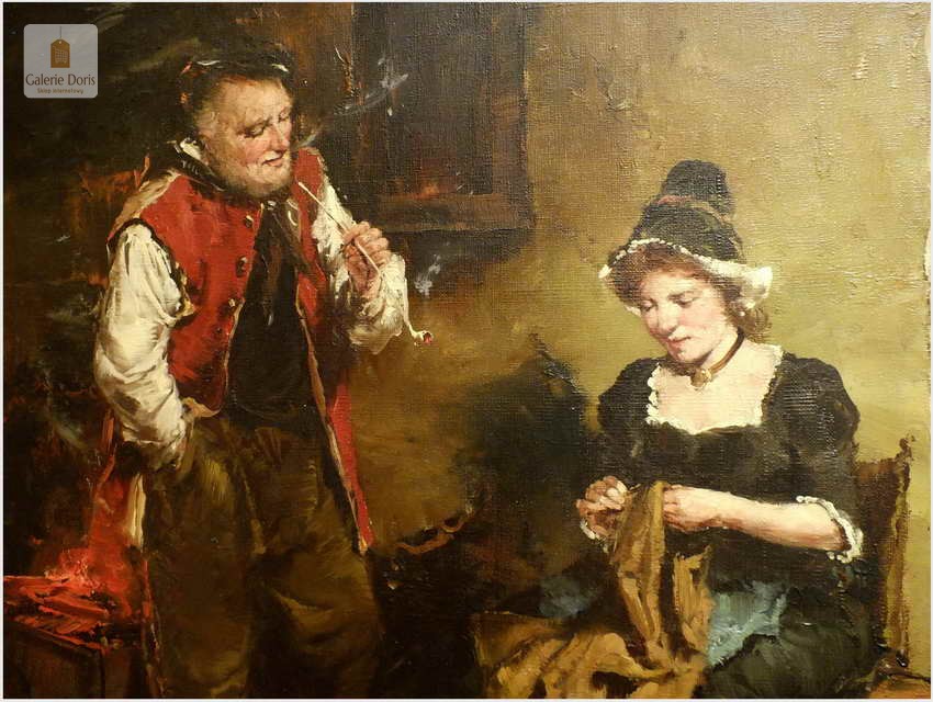 Gerhard Dickmeis (1918-1978): malarz niemiecki; studiował w Düsseldorfie. Malował pejzaże miejskie, portrety, martwe natury i przede wszystkim nie pozbawione humoru sceny rodzajowe o motywach i tematach chętnie podejmowanych przez wielu artystów niemieckich (Pijący wino, Gracze w karty, Cyganie i muzykanci, Próba wina itp). Obraz z połowy XX wieku, znanego artysty niemieckiego Gerharda Dickmeis, którego obrazy wystawiane są w liczących się galeriach malarstwa na całym świecie.