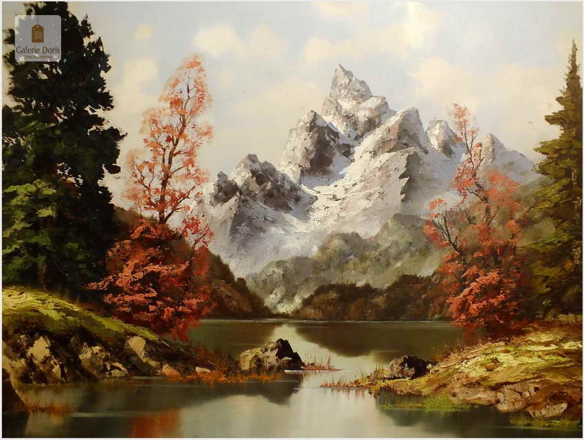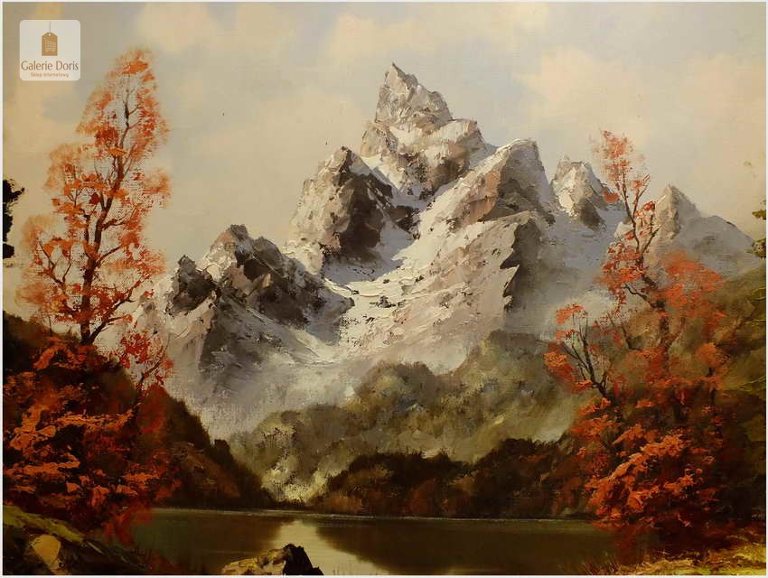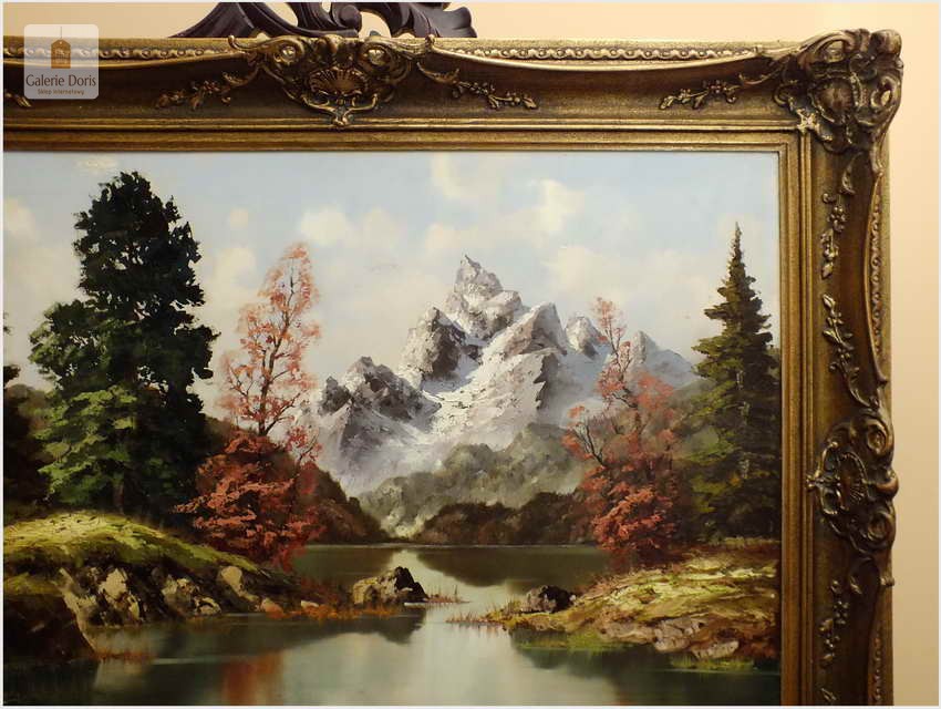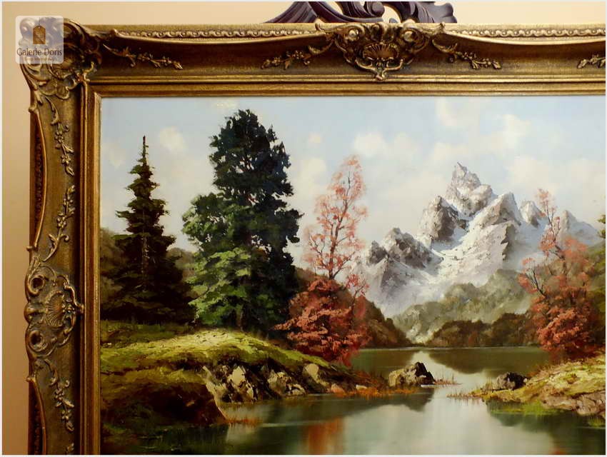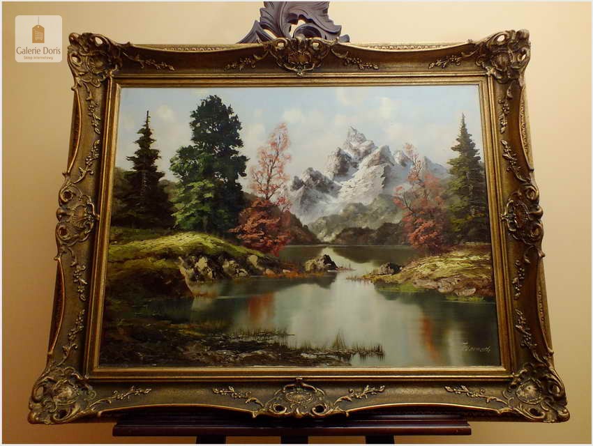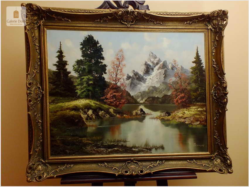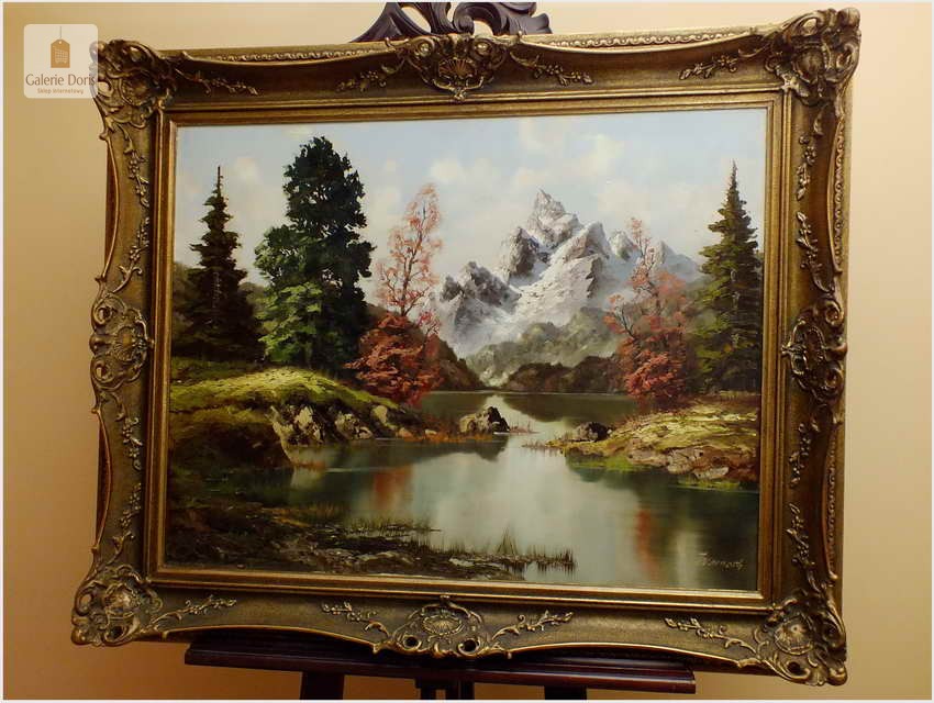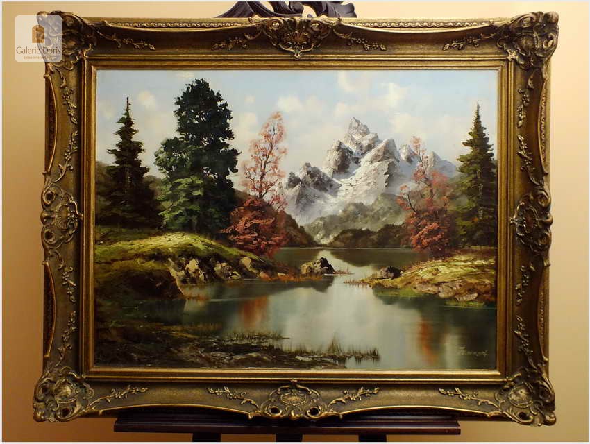 Obraz olejny na płótnie przedstawiający krajobraz alpejski. Obraz odznacza się dobrą perspektywą oraz wysmakowaną grą barw. Struktura farby wyraźnie wyczuwalna pod palcami. Obraz oprawiony jest w przestrzenną, ramę wykonaną z drewna zdobioną rokaliami. Obraz sygnowany dolnym rogu, będzie z pewnością pięknym eksponatem w Państwa kolekcji, domu. Polecamy!