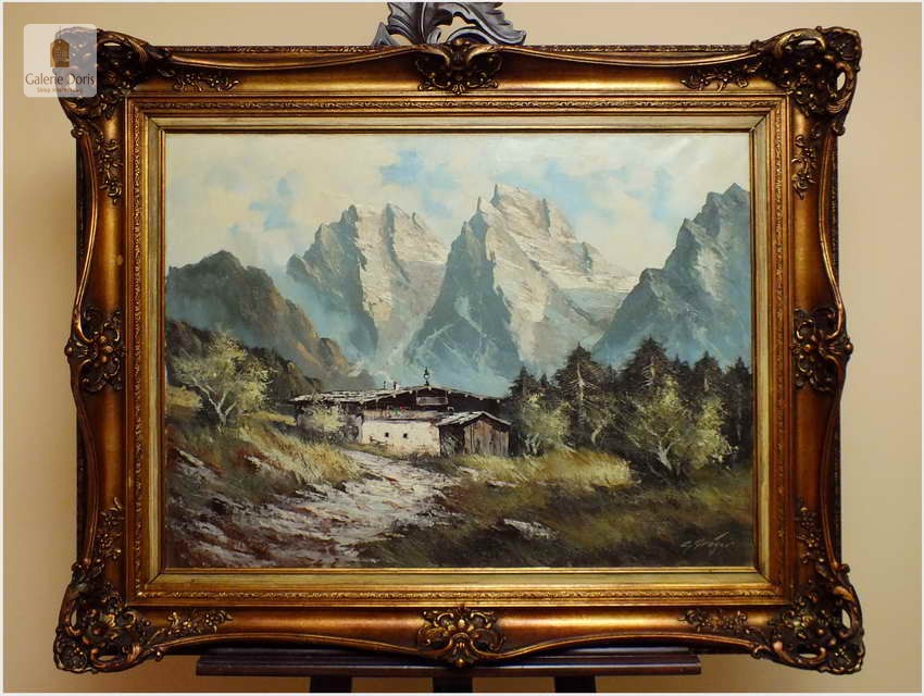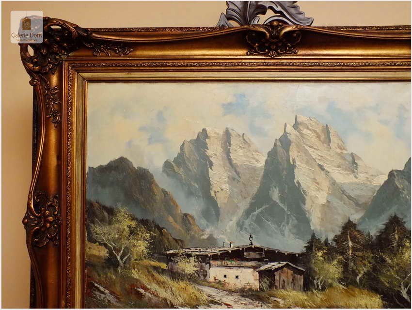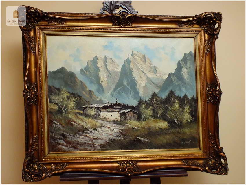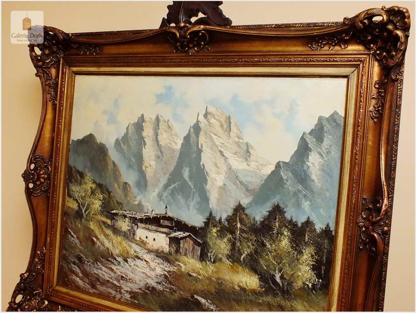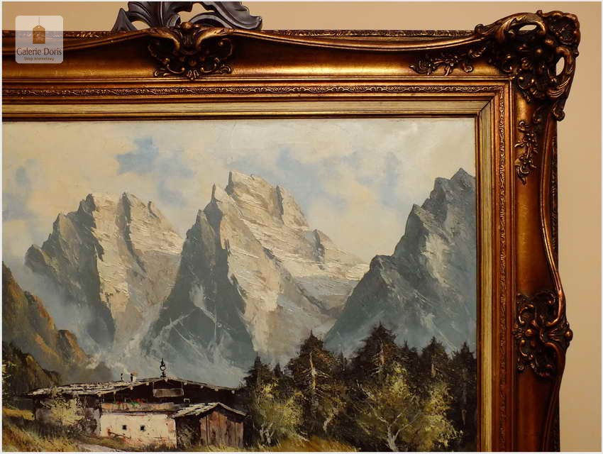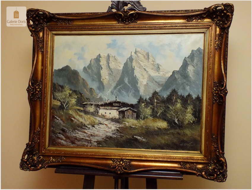 Obraz olejny na płótnie przedstawiający krajobraz alpejski. Obraz odznacza się dobrą perspektywą oraz wysmakowaną grą barw. Struktura farby wyraźnie wyczuwalna pod palcami. Obraz oprawiony jest w przestrzenną, ramę wykonaną z drewna zdobioną rokaliami. Obraz sygnowany w dolnym rogu, będzie z pewnością pięknym eksponatem w Państwa kolekcji, domu. Polecamy!