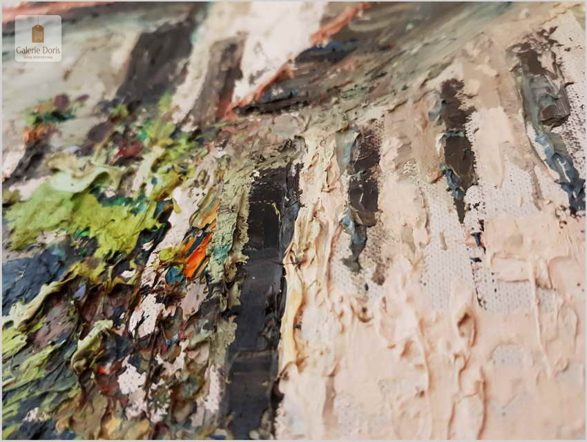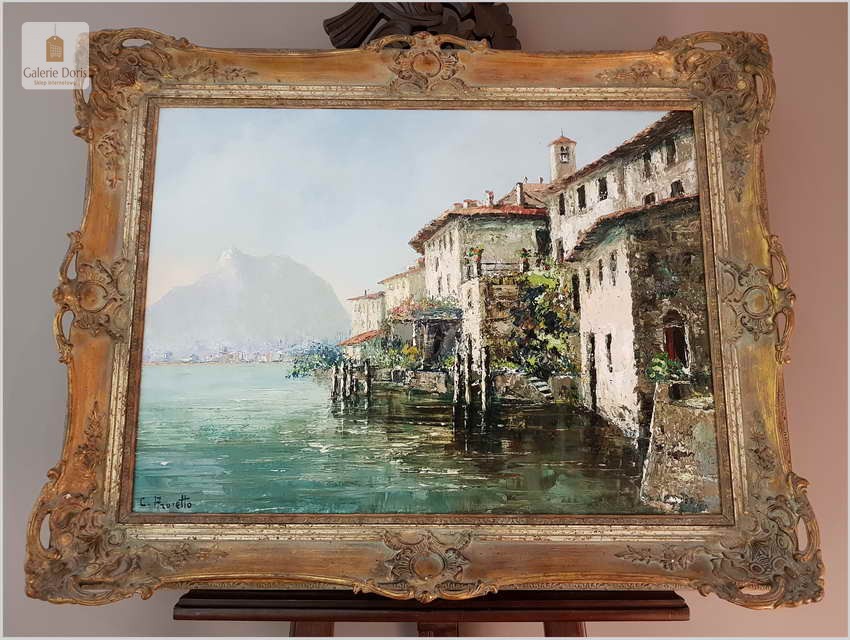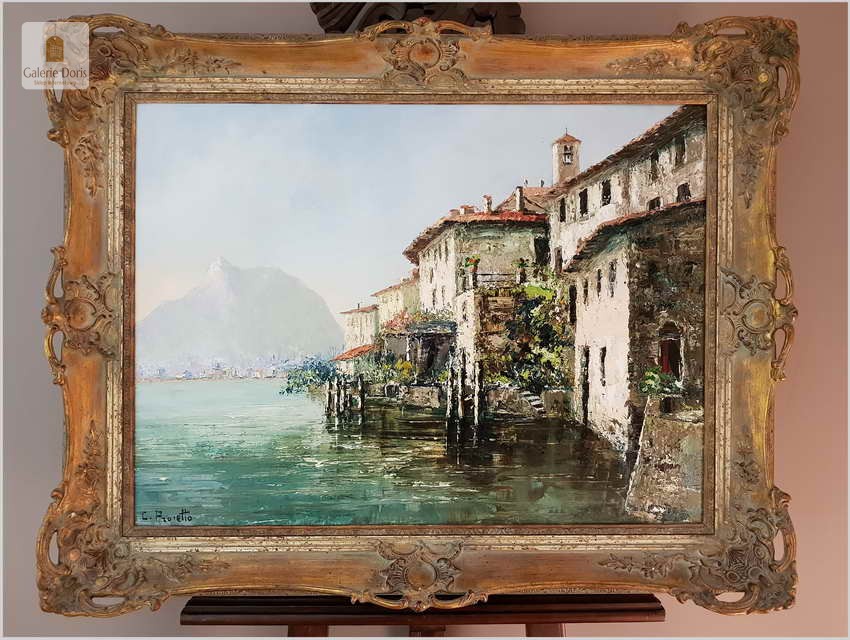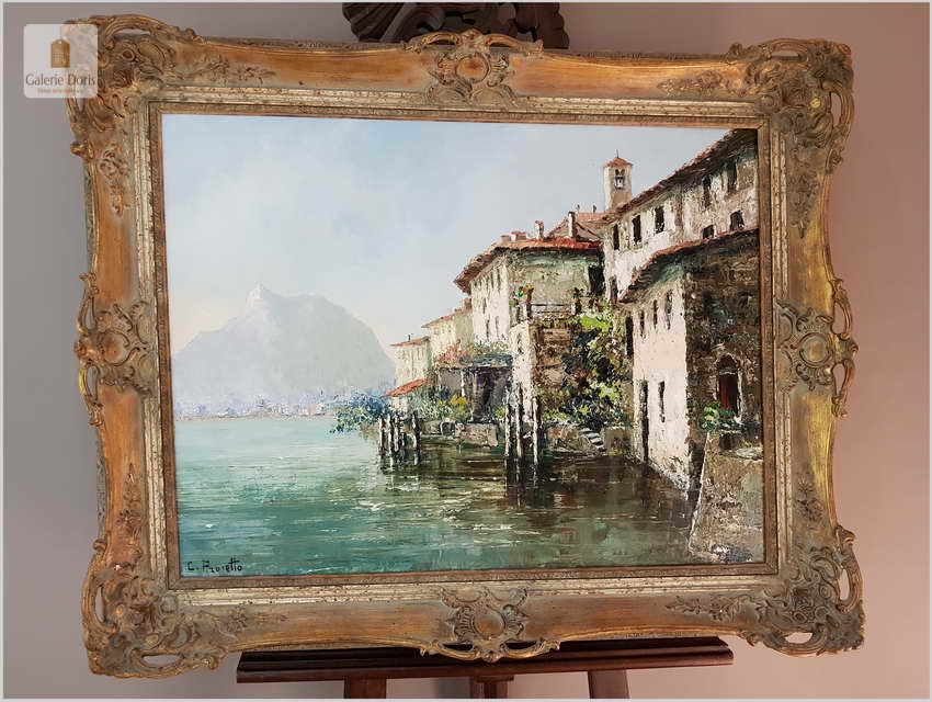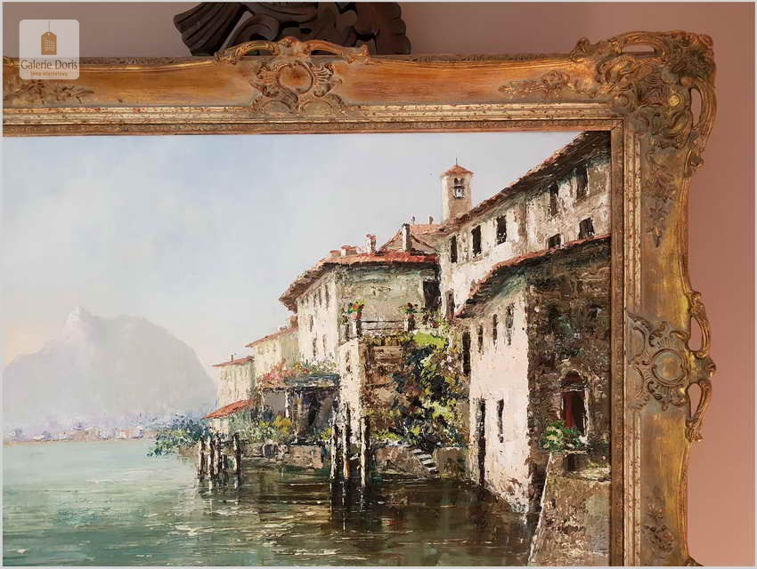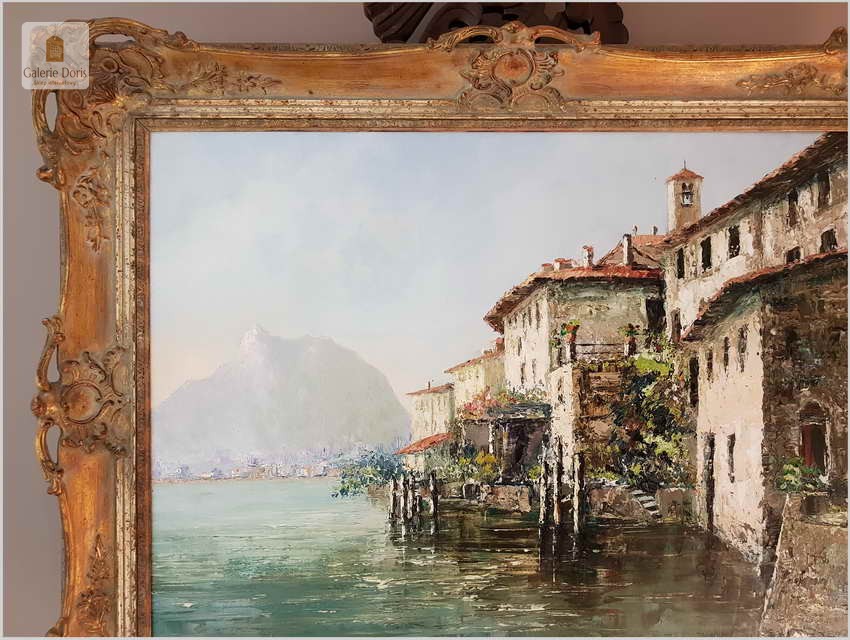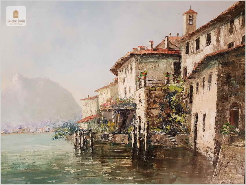 Obraz przedstawia Lago di Lugano - największe miasto we włoskojęzycznym kantonie Ticino, graniczącym z Włochami, w południowo-wschodniej Szwajcarii. Wracając do sprzedawanego obrazu wykonany w technice szpachlowej, farba bardzo grubo kładziona. Obraz w idealnym stanie zachowania.