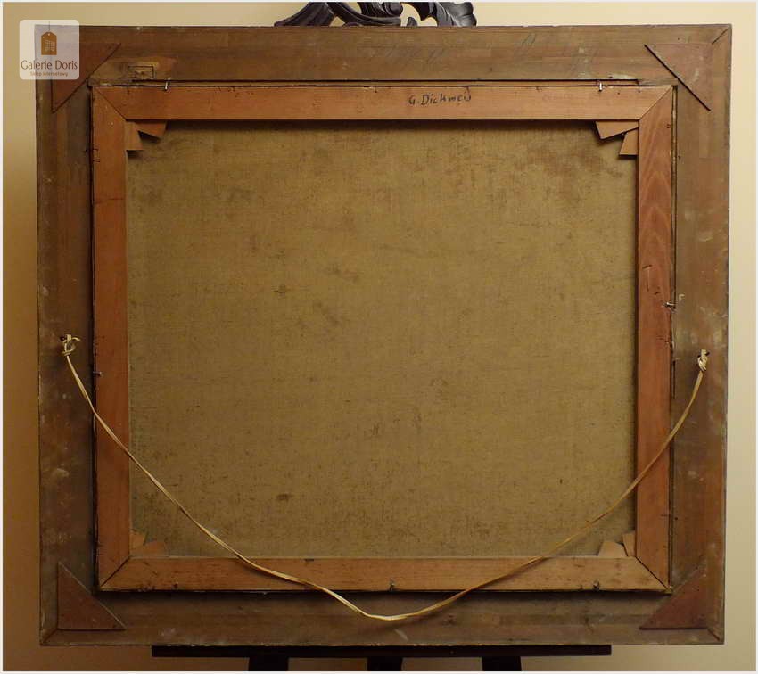Gerhard Dickmeis (1918-1978): malarz niemiecki; studiował w Düsseldorfie. Malował pejzaże miejskie, portrety, martwe natury i przede wszystkim nie pozbawione humoru sceny rodzajowe o motywach i tematach chętnie podejmowanych przez wielu artystów niemieckich (Pijący wino, Gracze w karty, Cyganie i muzykanci, Próba wina itp). Obraz z połowy XX wieku, znanego artysty niemieckiego Gerharda Dickmeis, którego obrazy wystawiane są w liczących się galeriach malarstwa na całym świecie.