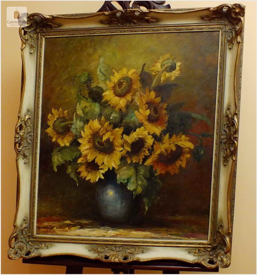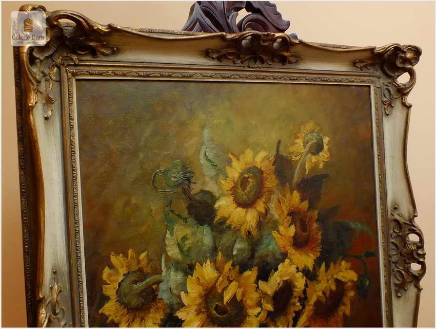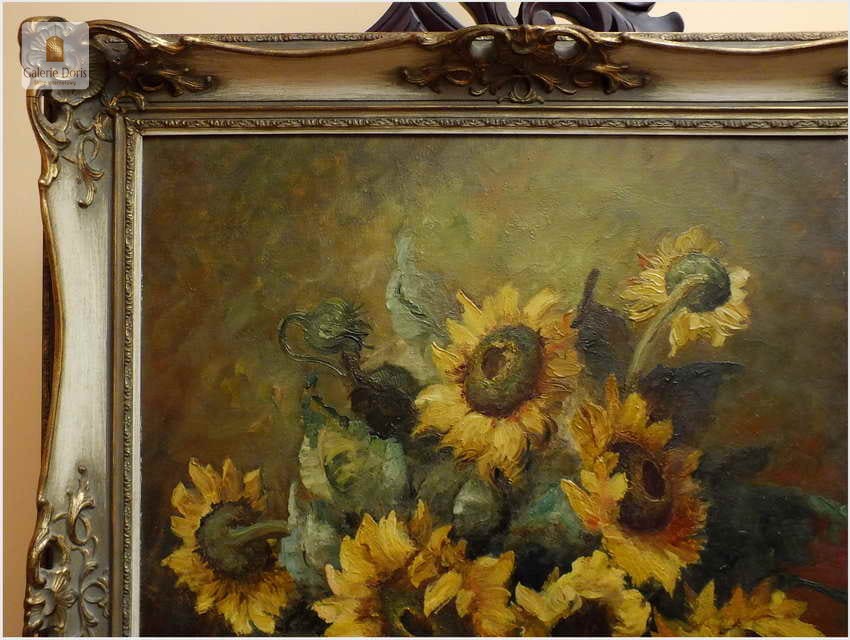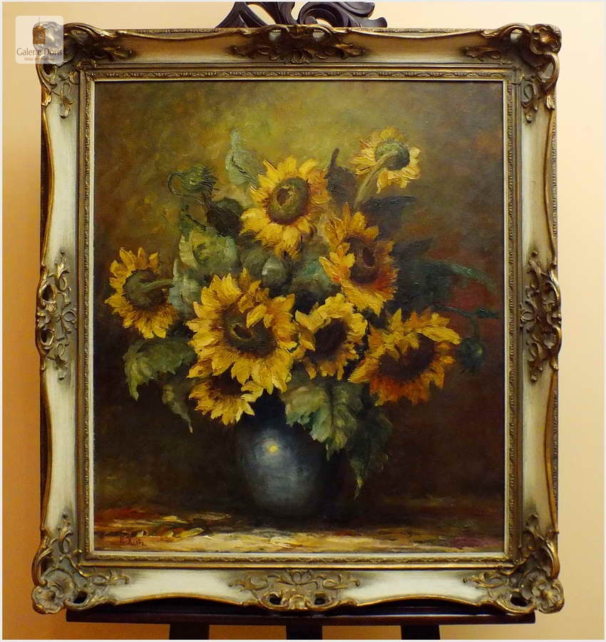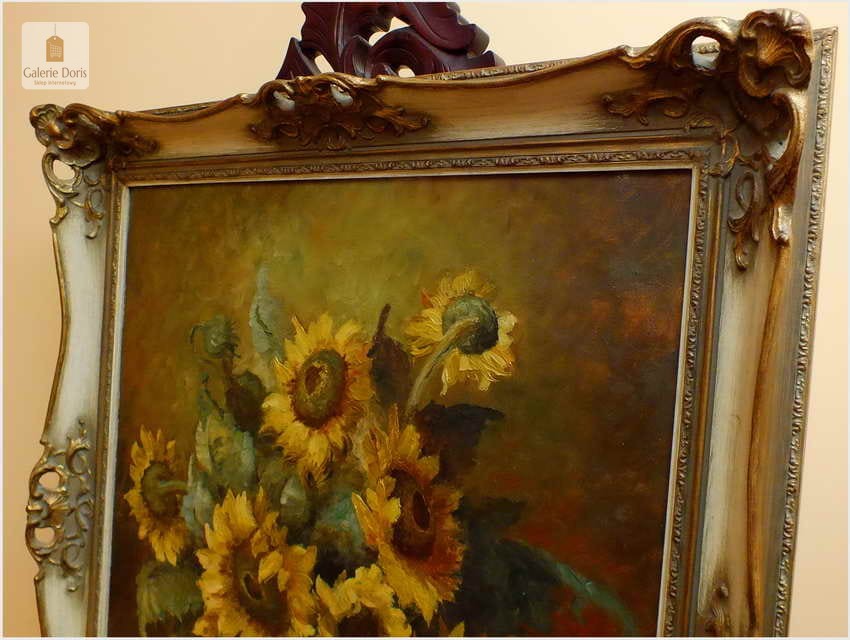Polecamy niezwykle piękny stary obraz olejny przedstawiający Słoneczniki w wazonie. Struktura farby wyraźnie wyczuwalna pod palcami. Obraz oprawiony jest w przestrzenną, grubą ramę wykonaną z drewna. Całość jest sygnowana w lewym dolnym rogu ramy. Obraz malowany na grubym płótnie malarskim. Płótno bez uszkodzeń w bardzo dobrym stanie. Do obrazu dokładamy widniejąca ramę gratis, którą wysyłamy wraz z obrazem. Gwarantujemy profesjonalnie zabezpieczoną przesyłkę kurierem. Polecamy!