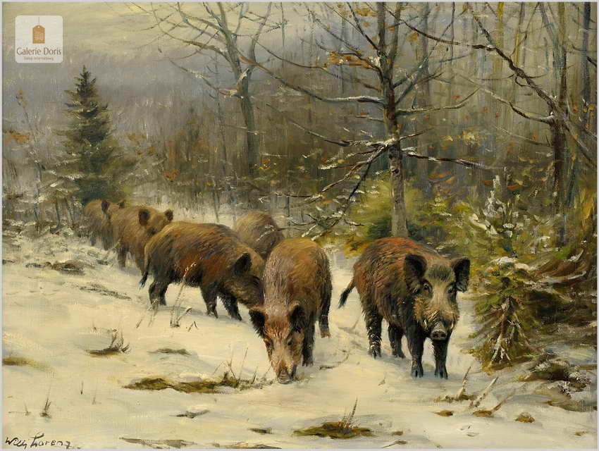 MEGA RARYTAS! ZIMA, DZIKI NA SKRAJU LASU - WILLI LORENZ *1901r.