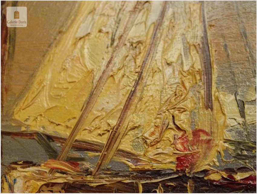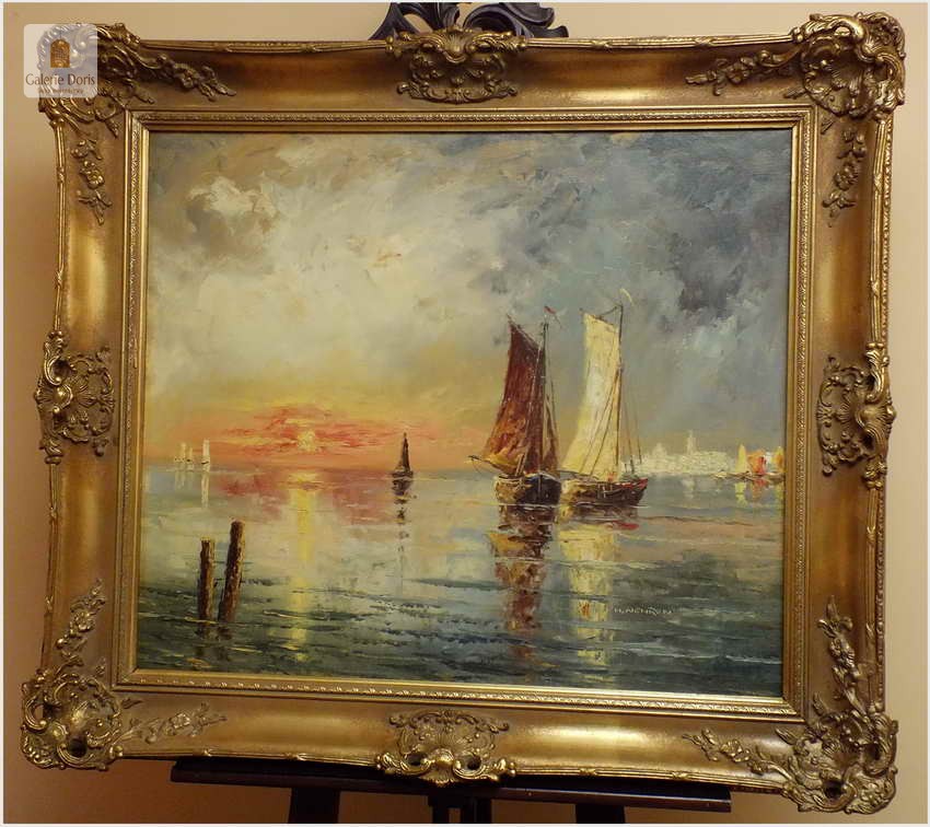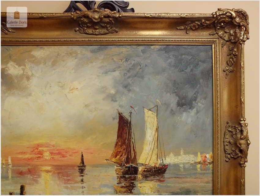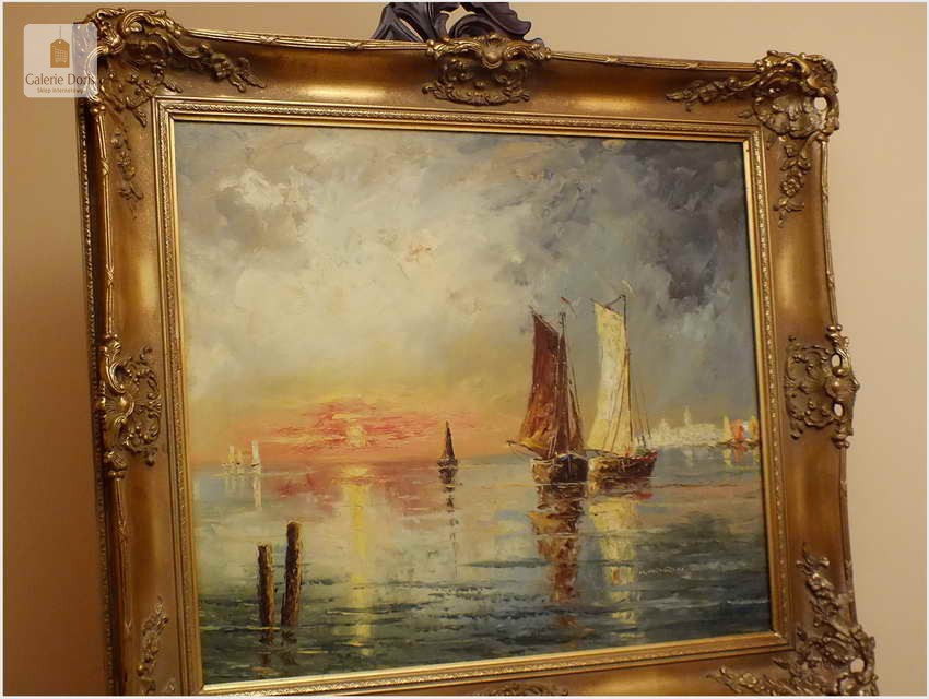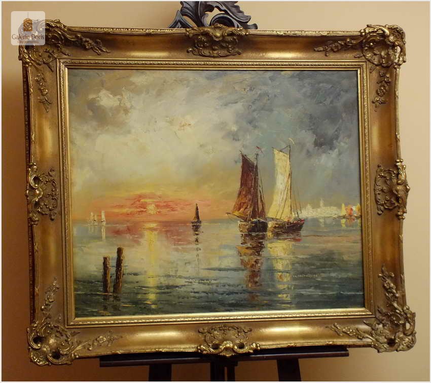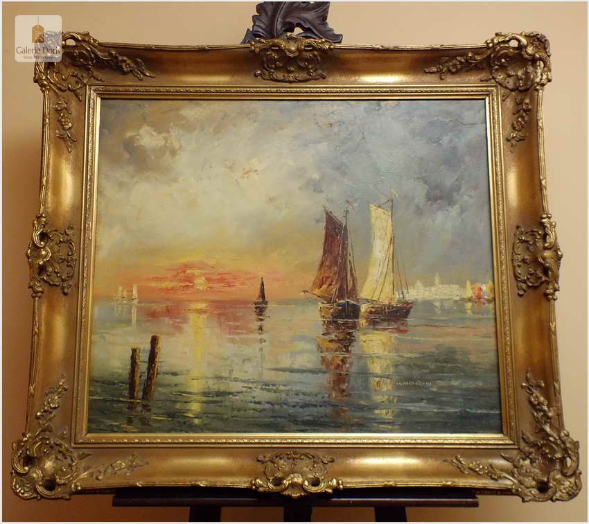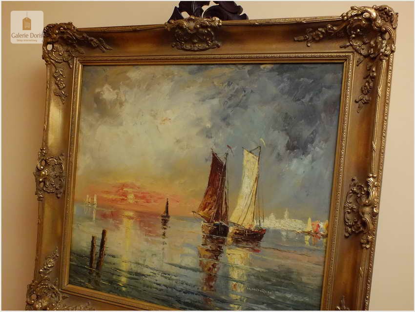 Technika malarstwa olejnego daje twórcom najszersze możliwości, dlatego jest najczęściej spotykana. To właśnie swoboda w mieszaniu barw, uzyskiwaniu rozmaitych faktur i efektów przenikania sprawia, że artyści tak chętnie sięgają po ten sposób tworzenia. Każdy pasjonat sztuki dobrze wie jak niesamowite i cenne potrafią być obrazy olejne. Właśnie pragniemy przyciągnąć Waszą uwagę na absolutną wirtuozerię malarstwa olejnego. Przed Państwem stawiamy wspaniały obraz olejny o tematyce marynistycznej. Malarz ukazuje nam morze śródziemne z żaglówkami jako punk centralny obrazu. Dodatkowym kontrapunktem malarz zmusza do obserwacji nabrzeża, a tam ukazuje się sprawnemu widzowi kopuła Bazyliki z pałacem Dożów w Wenecji. Nie należy zapminać o czasie jakim autor nam chciał upamiętnić wspomniane dzieło, pękne zachodzące słońce w blasku morza śródziemnomorskiego. Obraz z wyśmienitą paletą kolorystyczną oraz w sposób mistrzowski malarz uzyskał separację kolorów zachodzącego słońca. Płótno bez uszkodzeń oprawione w ramę widoczną na zdjęciach. Polecamy!
