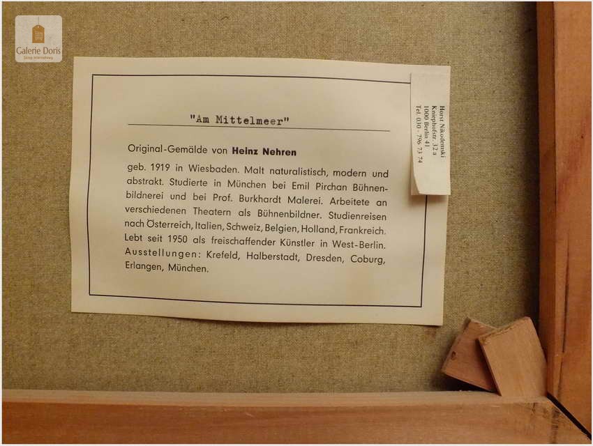 Heinz Nehren – urodzony 1919 rok w Wesbaden w Niemczech. Malarz naturalistyczny o wszechstronnym zamiłowaniu modernistycznym/umowny okres w dziejach sztuki, którego ramy czasowe wyznacza się od lat 60. XIX wieku (w związku z impresjonizmem) do lat 70. XX wieku (konceptualizm). Nehren wspaniale ukazuje siłę związaną  ze światłem i kolorem. Ukończył akademię Sztuk Pięknych w Monachium pod kierunkiem nauczyciela malarstwa Emil Pirchan oraz Prof. Burdhardt. Wiele podróży studyjnych do Austrii, Włoszech, Belgii, Holandii a na Francji kończąc. Pod koniec 1950 roku na stałe osiadł w West-Berlin. Wiele wystaw zagranicznych oraz w Niemczech: Krefeld, Halberstad, Dresden, Coburg, Erlangen, Munchen.