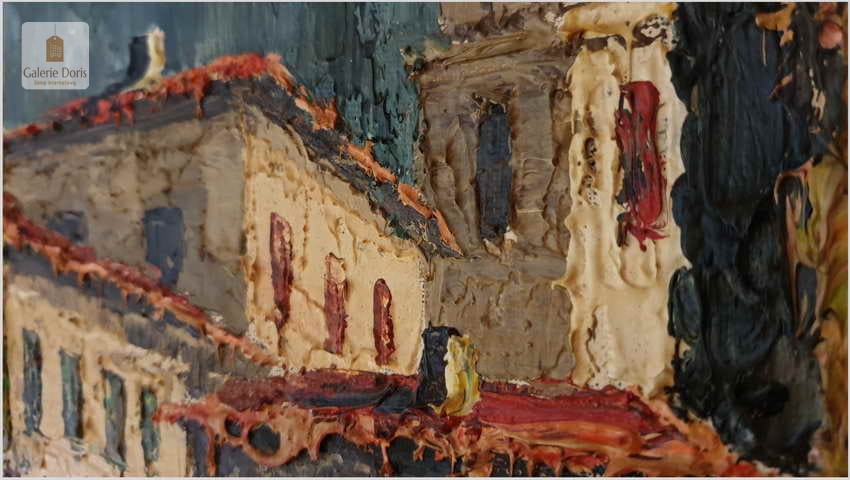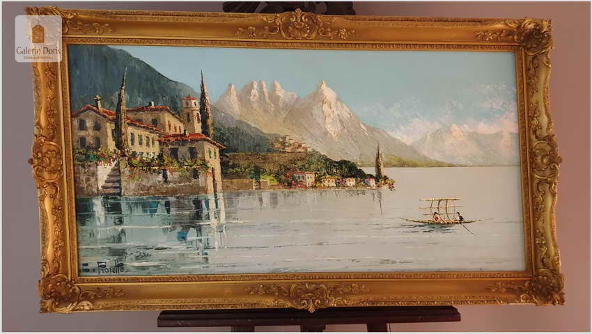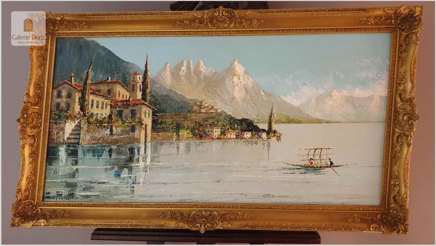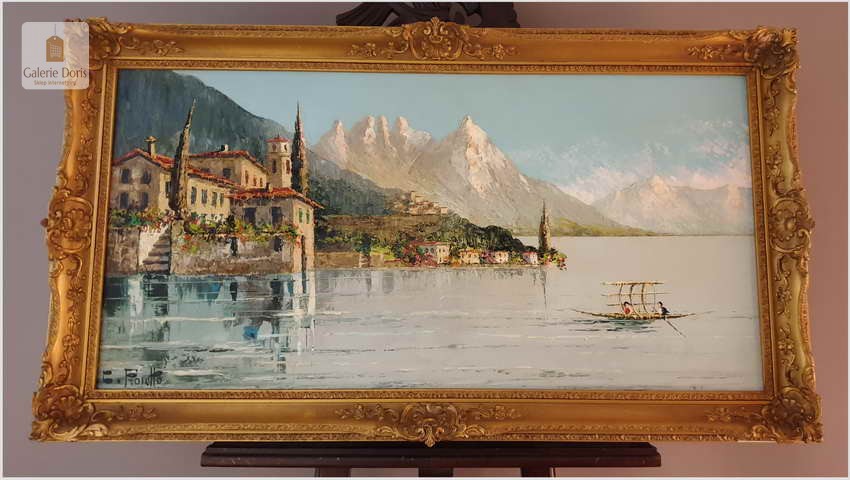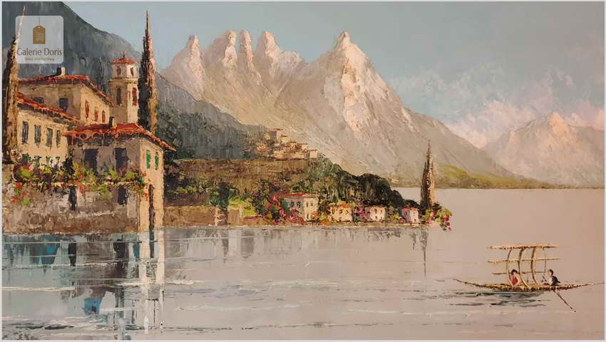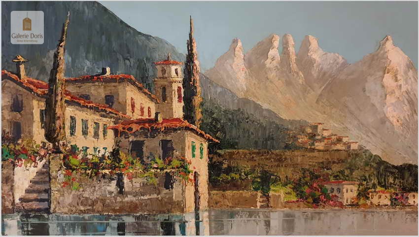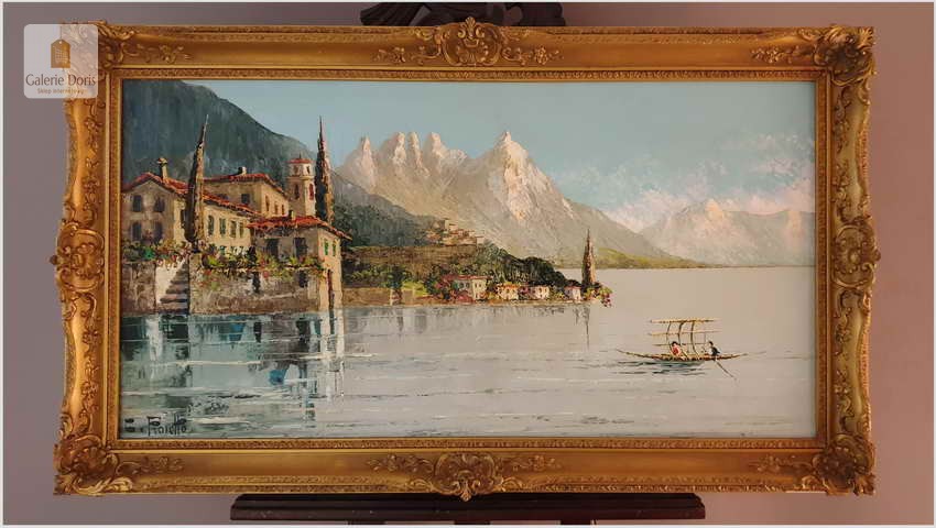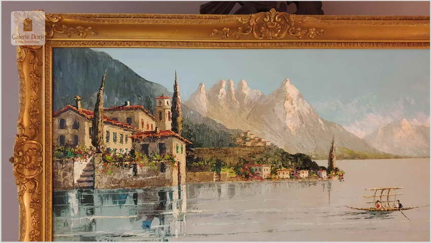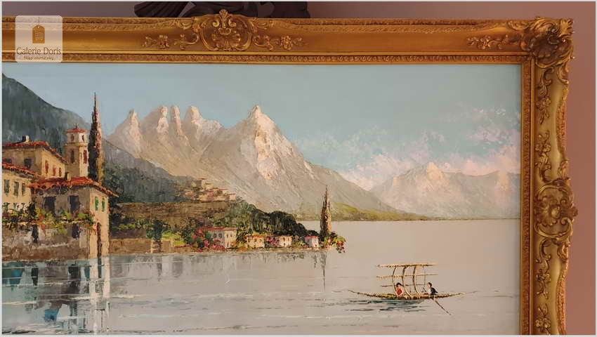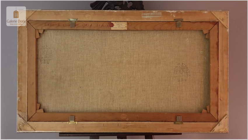 Obraz przedstawia Lago di Lugano - największe miasto we włoskojęzycznym kantonie Ticino, graniczącym z Włochami, w południowo-wschodniej Szwajcarii. Wracając do sprzedawanego obrazu wykonany w technice szpachlowej, farba bardzo grubo kładziona. Obraz w idealnym stanie zachowania. Na odwrocie (rewers) plakietka oryginalna malarza z pieczęcią z laki.