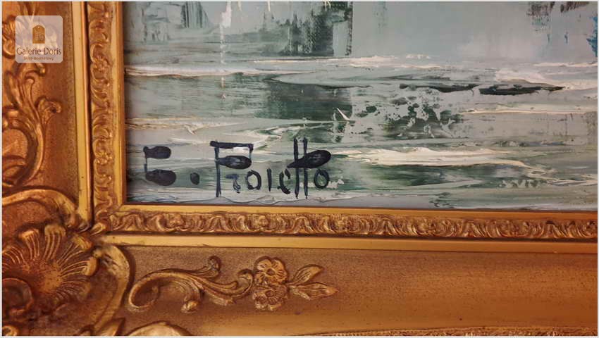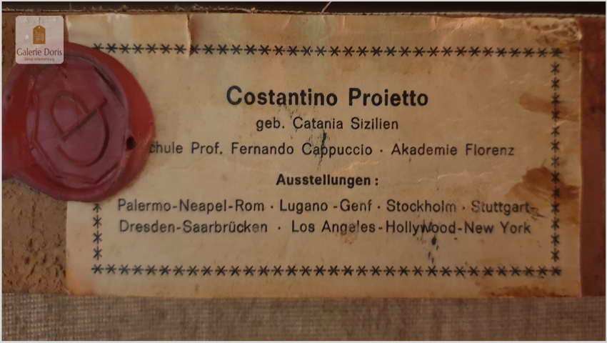 Constantino Proietto (1900 Catania/Sizilien bis 1979) Znany włoski malarz pejzaży, marynista. Studium artystyczne Florencja u prof. Fernando Cappuccia, wiele wystaw krajowych i międzynarodowych w Europie i USA, przez wiele lat mieszkał w Stuttgarcie, podróże studyjne w Europie, jego obrazy malowane w formie impresjonizmu, głównie w technice szpachlowej. Wymieniony w odpowiednich katalogach artystów 16 x w artprice. Więcej informacji można znaleźć na stronie internetowej: www.cproietto.com Osiedlił się w Stuttgarcie pod koniec II wojny światowej. Na początku lat 50 otworzył studio, malował w swoim atelier / studio, mieszczącym się pod modnym adresem Stuttgart-S. Danneckerstraße 34.