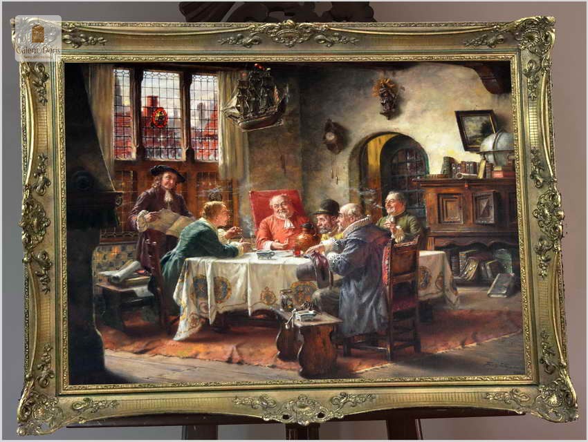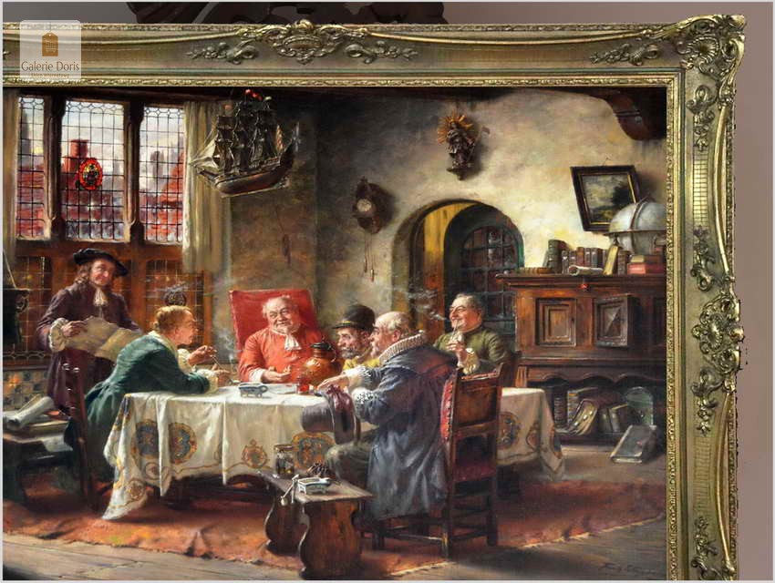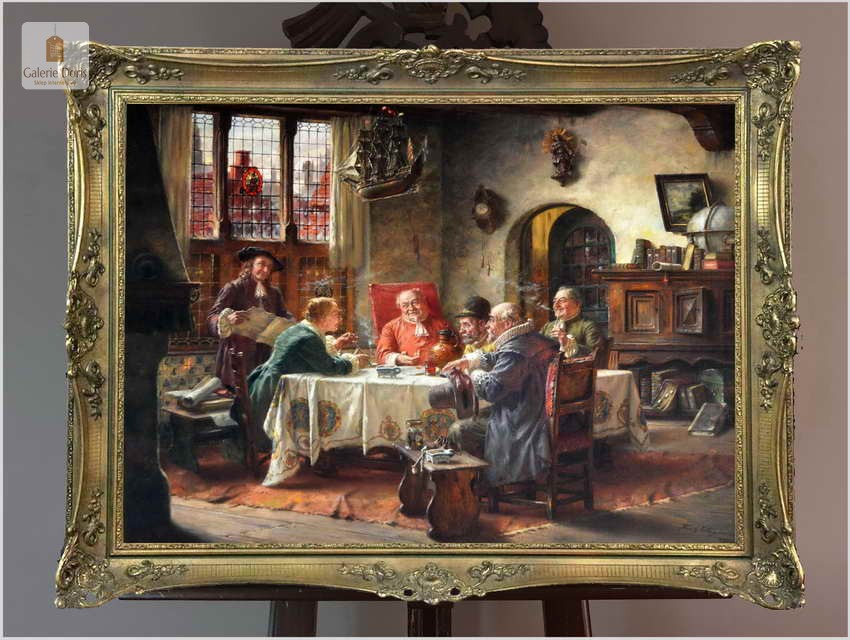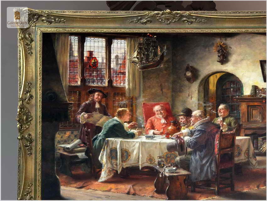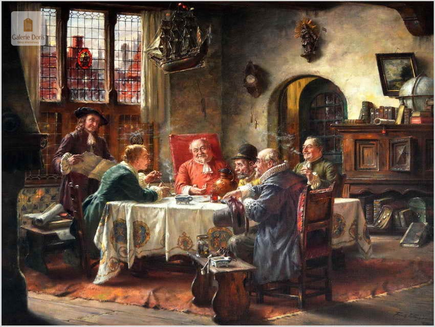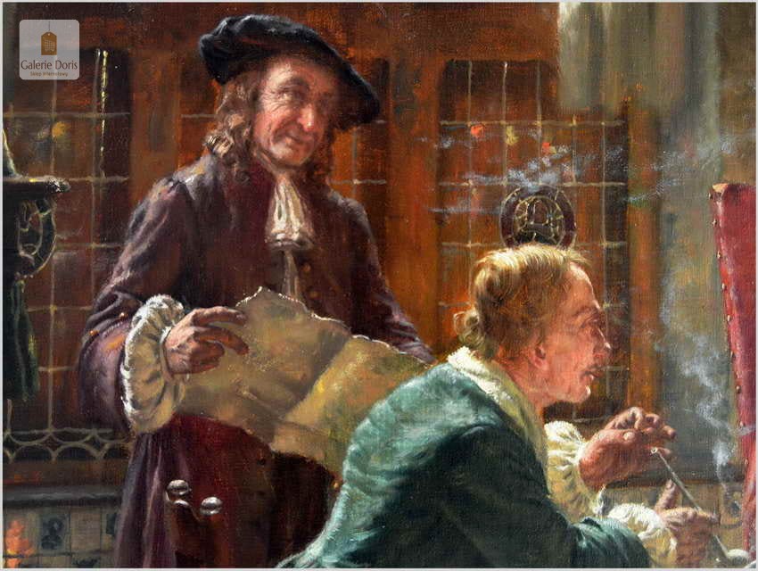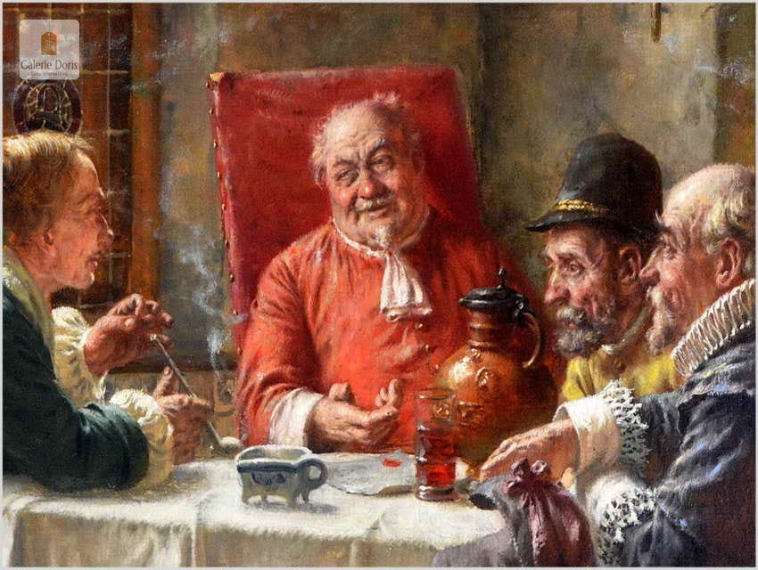 Polecamy piękny duży obraz olejny namalowany na płótnie autorstwa Fritza Wagnera. Bardzo pięknie i szczegółowo namalowana scena rodzajowa. Praca jest charakterystycznym dla Wagnera dziełem. Artysta przy pomocy subtelnego światła z precyzyjnymi refleksami oraz przez przedstawianie delikatnych smużek dymu podkreślił nastrój obrazu. Z pewnością można go uznać za obiekt muzealny, będący perełką niejednej kolekcji malarstwa. Praca namalowana technika olejna na płótnie, sygnowana w dolnym rogu: Fritz Wagner Mch. Zasłynął wielopostaciowymi często niepozbawionymi humoru scenami rodzajowymi. Zafascynowany flamandzkim malarstwem XVII wiecznym często sięgał po tematykę nawiązującą do tego okresu.