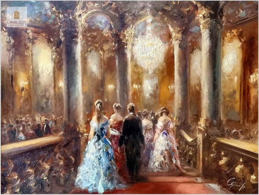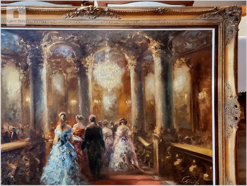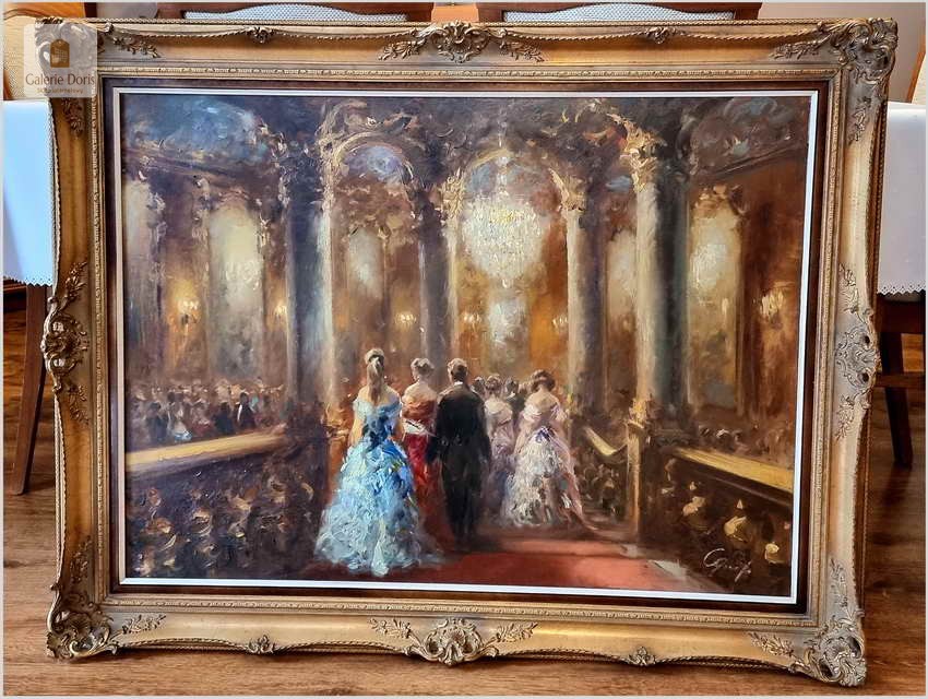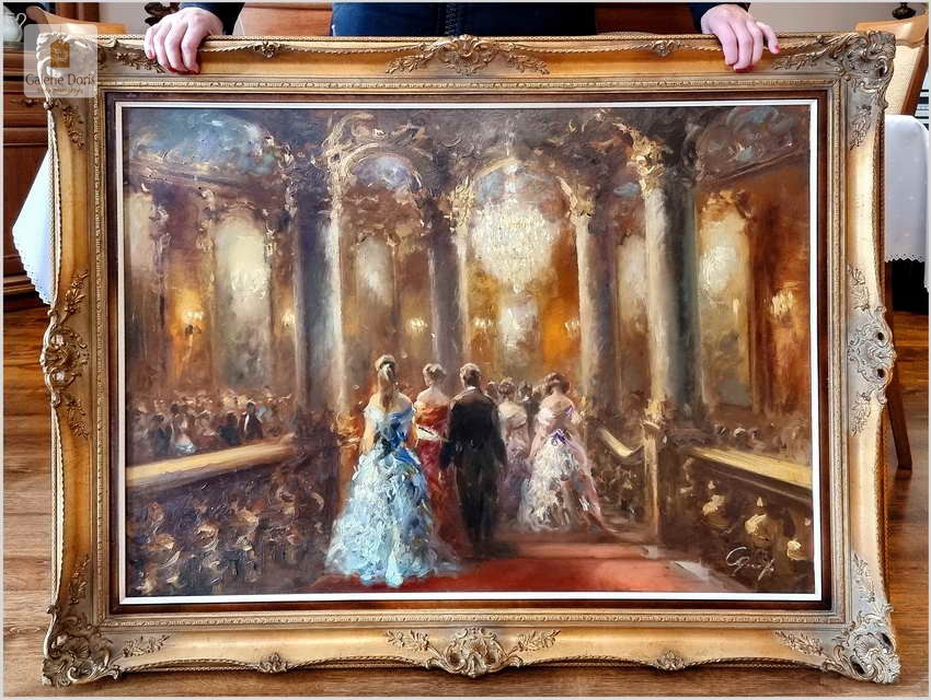 Płótno przedstawia scenę balu w zabytkowym wnętrzu. Obraz jest oprawiony w ozdobną, złotą ramę. Na obrazie widoczne są osoby ubrane w formalne stroje, kobiety w sukniach, a mężczyźni w garniturach lub smokingach. Scena odbywa się w okazałym wnętrzu, z wysokimi kolumnami, misternymi wzorami na ścianach i żyrandolami zapewniającymi oświetlenie. Obraz uchwycił momenty tańca, postacie w drodze na bal i rozmowy między uczestnikami. Bogate kolory i pociągnięcia pędzla tworzą wrażenie ruchu i atmosfery w scenie.