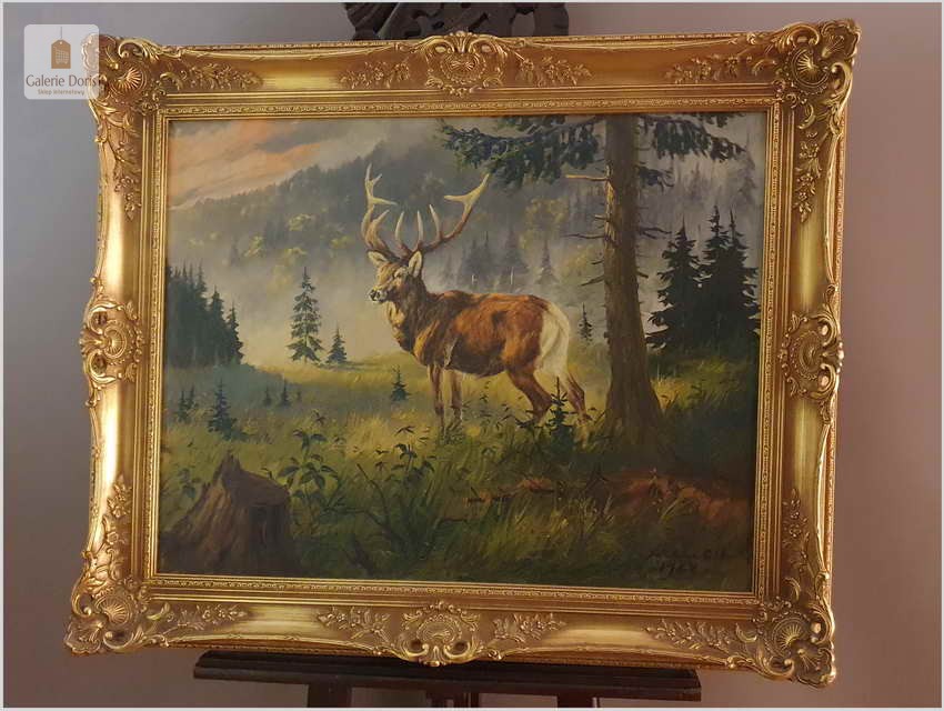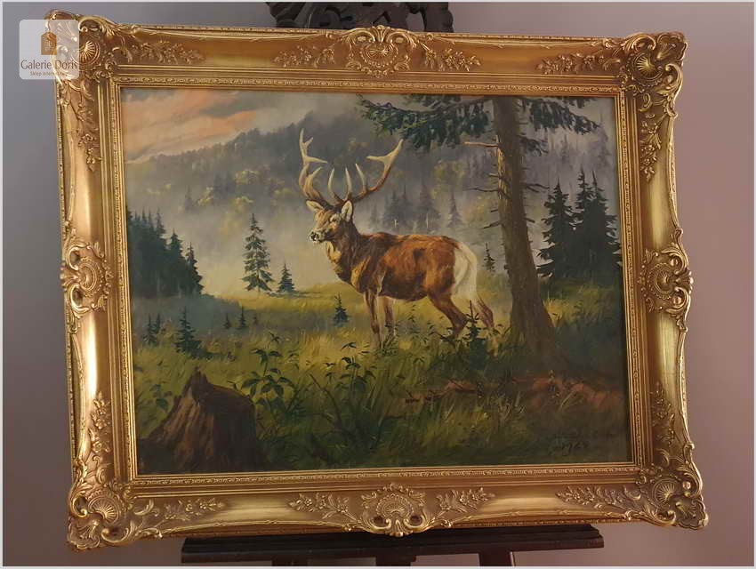 Malarstwo myśliwskie! Jeleń na leśnej polanie - Fred ARENDT (*1928) (id: 1058)