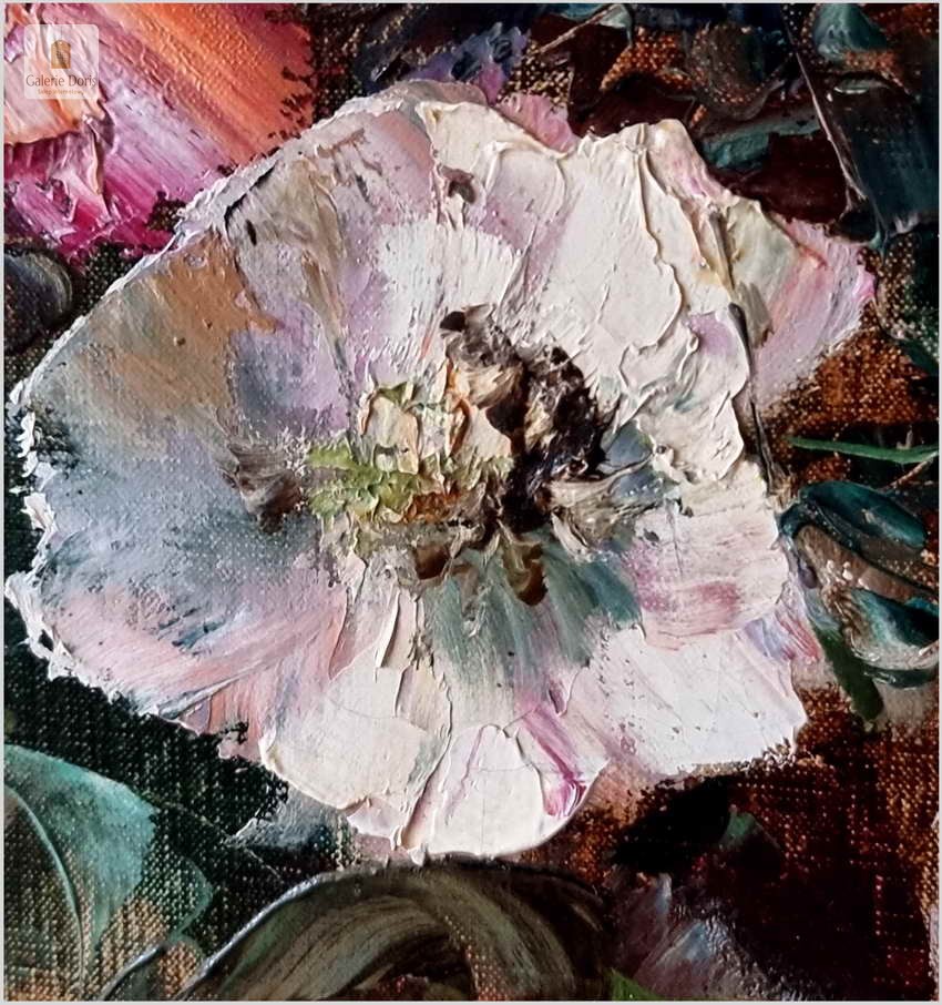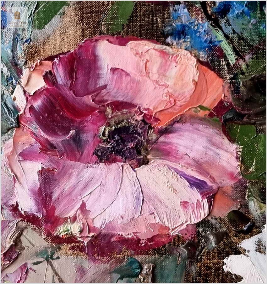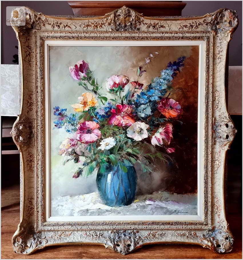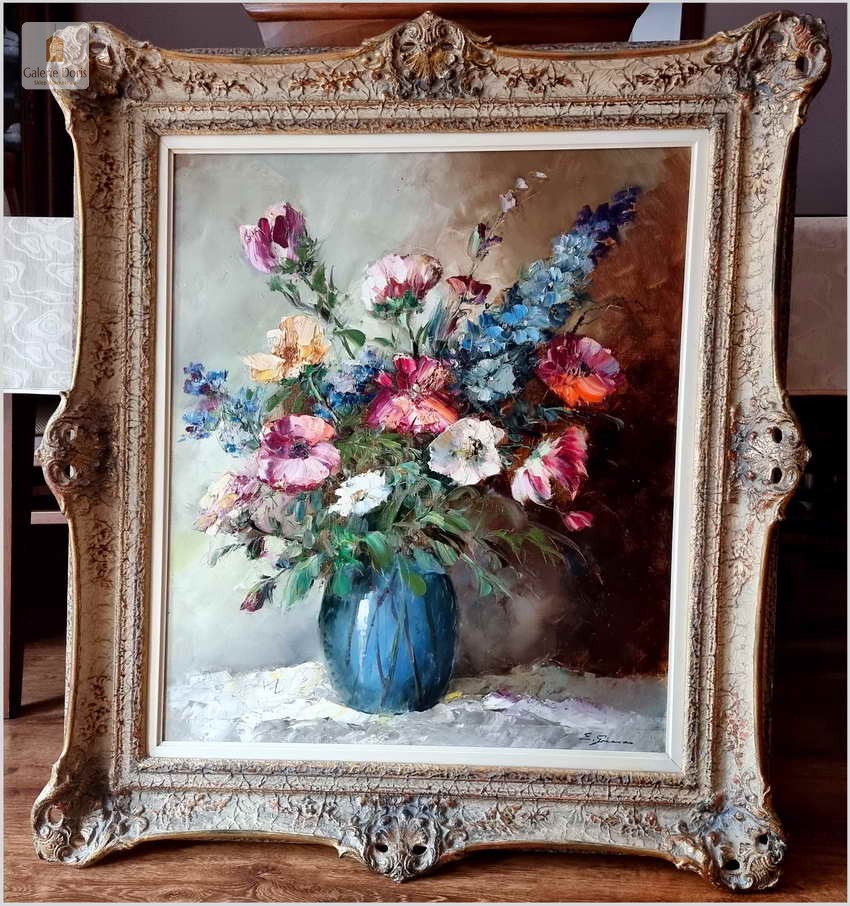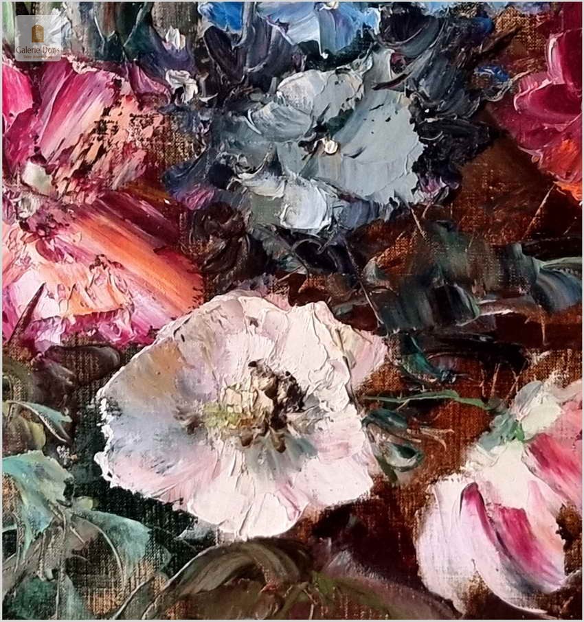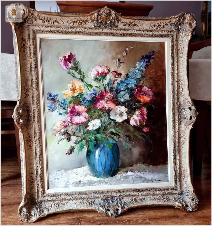 Obraz olejny na płótnie, osadzony w  stylowej złoconej ramie. Malarz przedstawił nam martwą naturę - Bukiet kwiatów w wazonie. Zastosowana technika malarska to pędzel i szpachla. Niezwykle dekoracyjny nastrojowy obraz idealna dekoracja salonu.