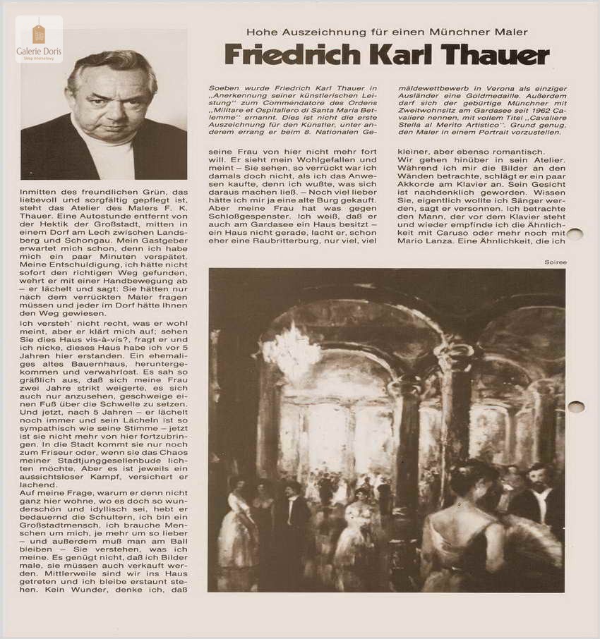 Biografia, (skrót) F K Thauer studiował w Monachium u Franza Hagge Millera ,następnie u Oskara Kokoschka w Salzburgu w Austrii . Wielki sukces odniósł na galerii w Zurichu w Szwajcarii . Jego prace można znaleźć w wielu galeriach i aukcjach