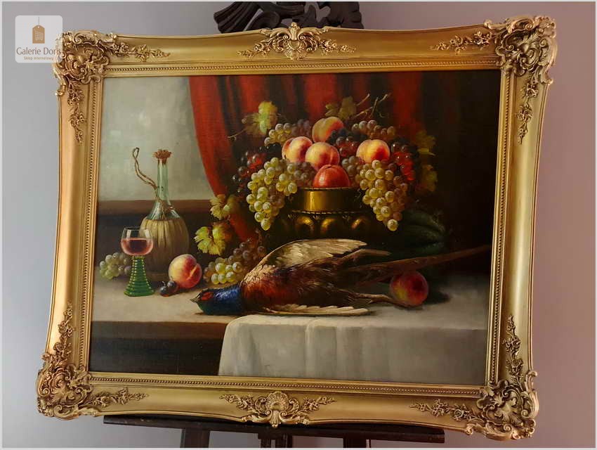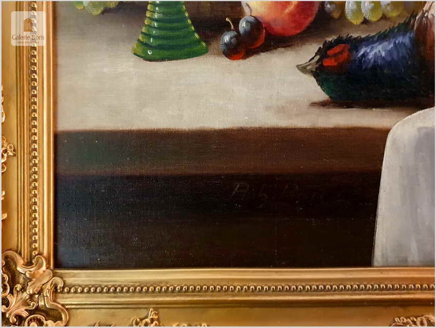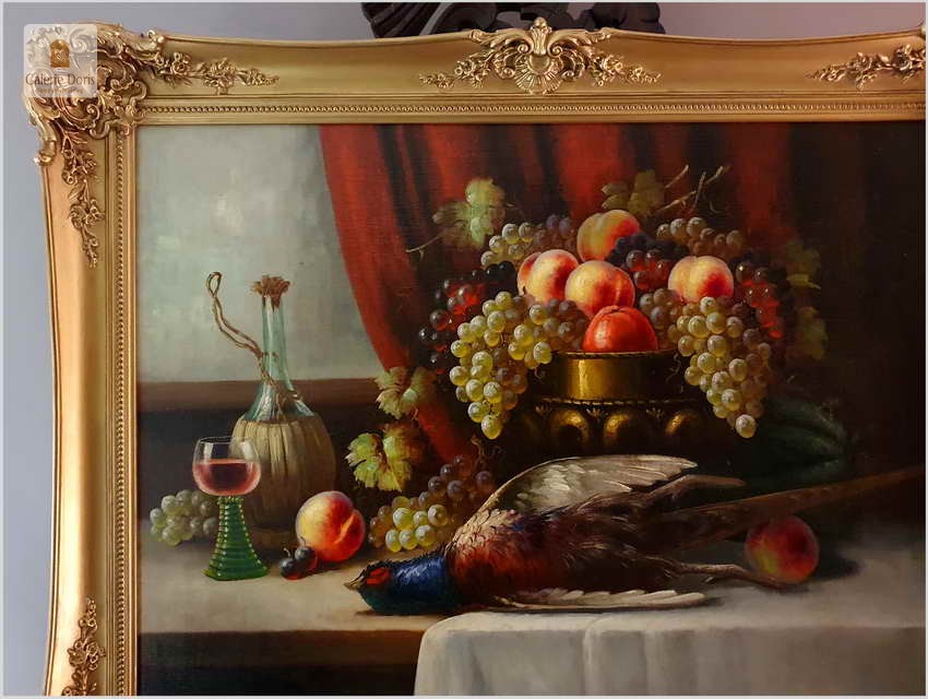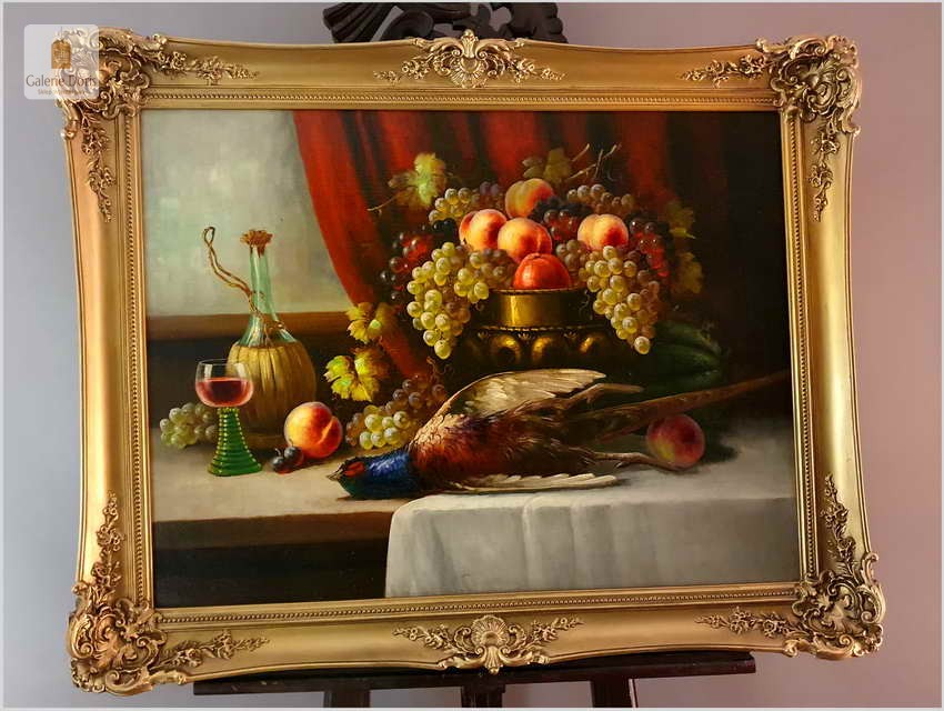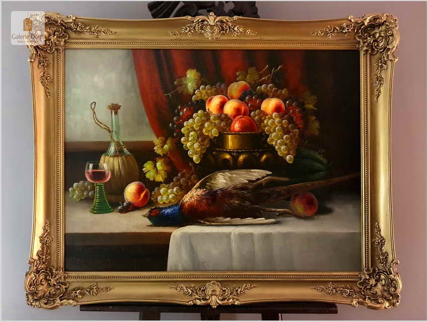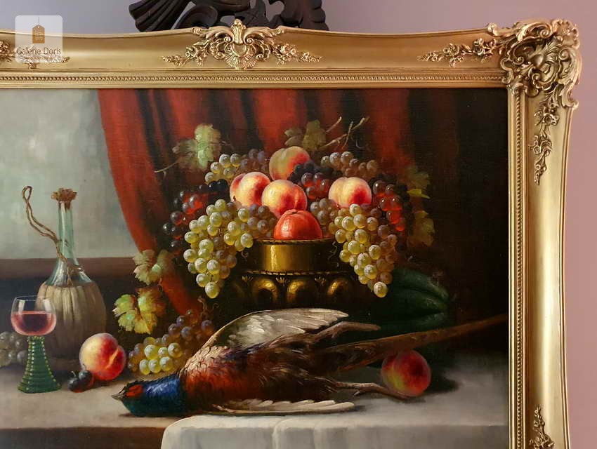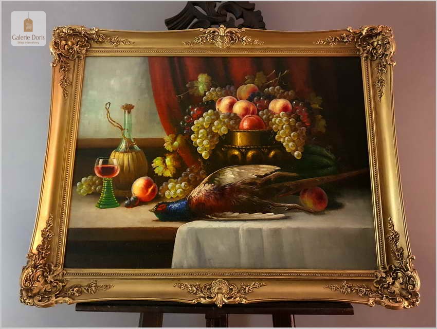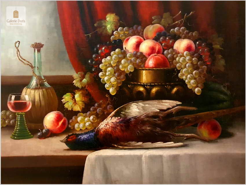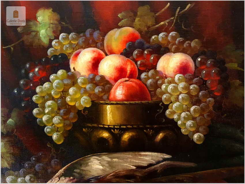 Polecamy wspaniały obraz olejny na płótnie berlińskiego malarza. Gatunkami, które najchętniej podejmował był pejzaże, portrety i przede wszystkim martwe natury. Ta ostatnia cieszyła się największym uznaniem głównie za sprawą drobiazgowego sposobu malowania oraz precyzji w oddawaniu partii kwiatów i owoców. W swych pracach dążył do perfekcyjnego oddania odbić światła w różnych przedmiotach i materiałach przez co przeszedł do historii jako geniusz martwej natury. Obrazy olejne  Richarda Rau mają  często wymiar alegoryczny. Obraz przeszedł renowację i naprawy oraz gruntowne czyszczenie, jest w doskonałym stanie, gotów do powieszenia. Polecamy