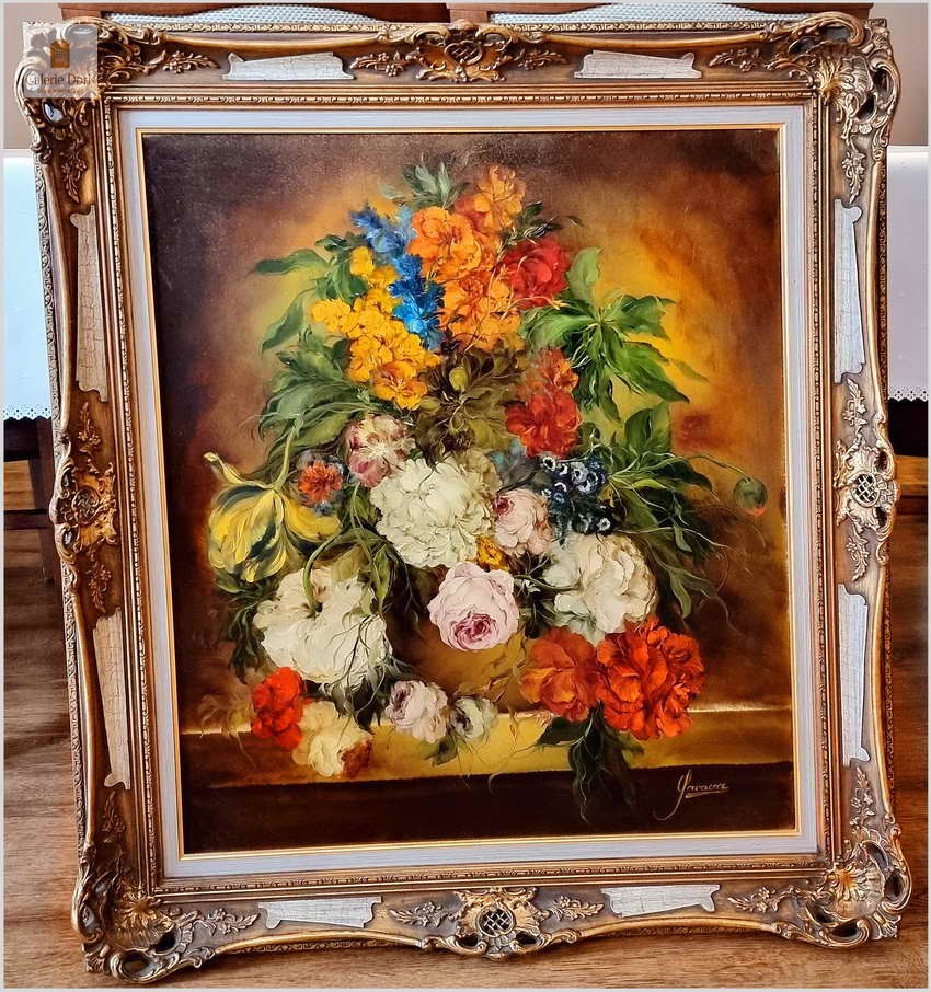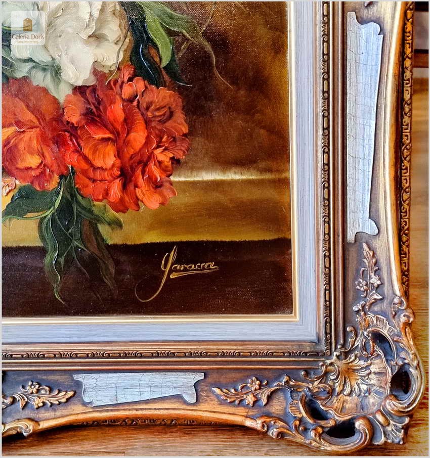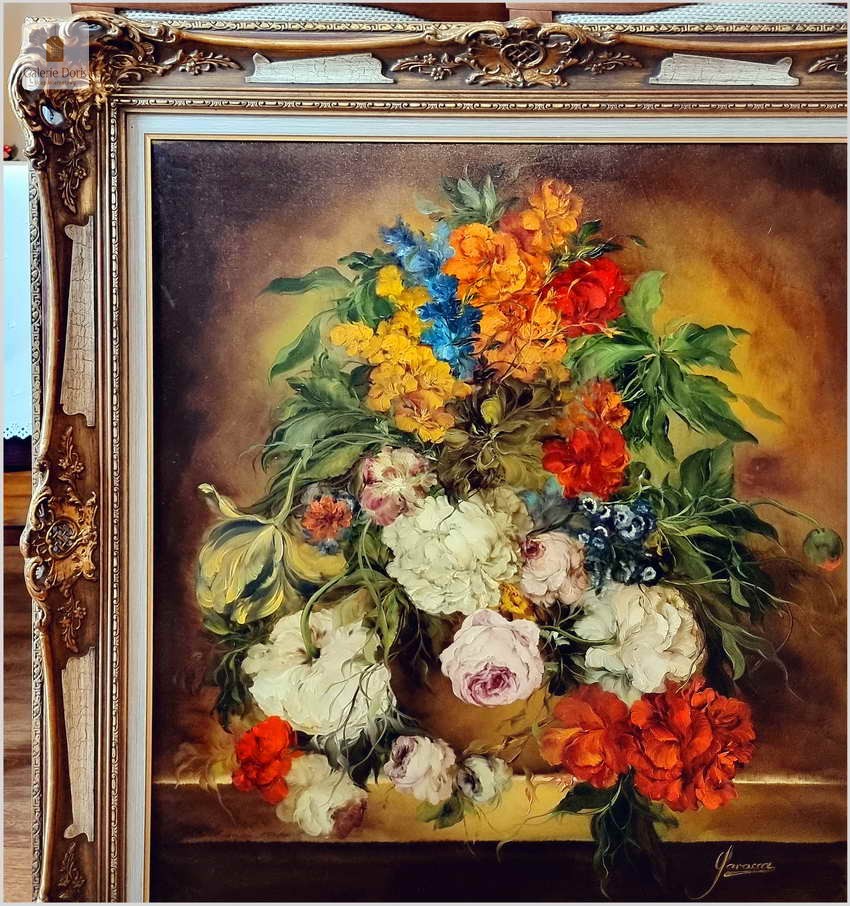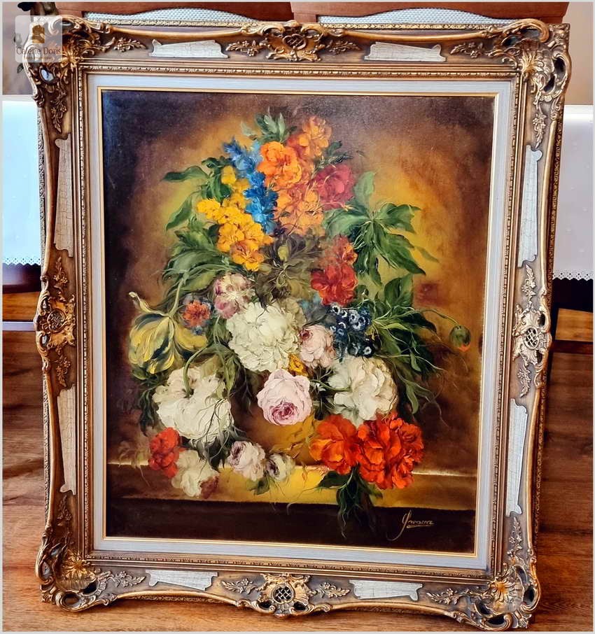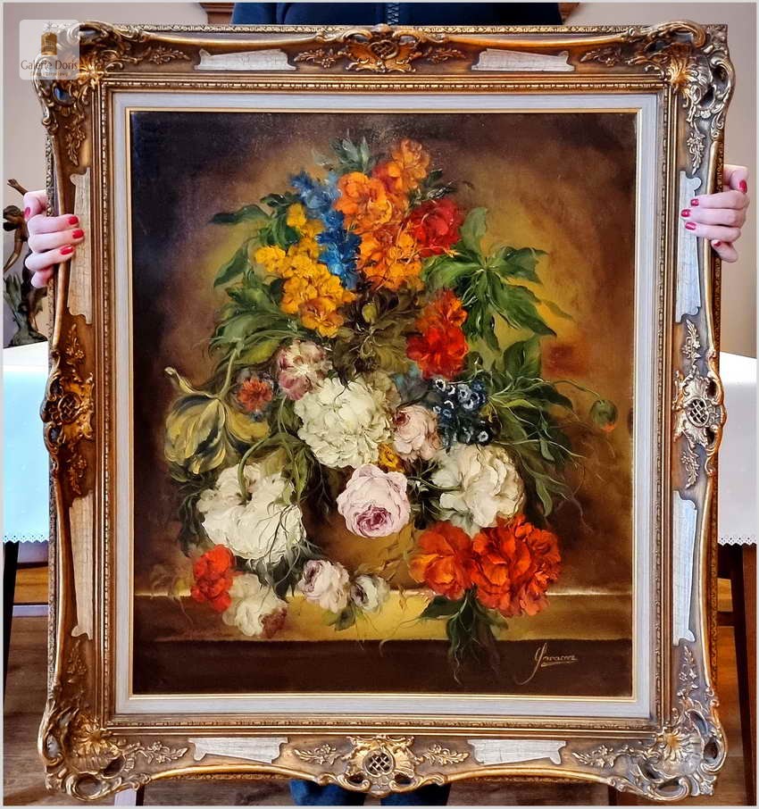 Polecamy wspaniały pałacowy w stylu baroku obraz olejny. Bogata kompozycja kwiatów, bardzo dekoracyjny ręcznie malowany obraz olejny "Bukiety kwiatów na kamiennym cokole", sygnowany "Garossa" w prawym dolnym rogu. Prawdopodobnie wykonany około 1950 roku lub wcześniej w stylu i wzorowany na dawnych mistrzach holenderskiego baroku. Obraz olejny przedstawia bukiet kwiatów umieszczony w ozdobnej ramie. Kwiaty są żywe, o różnych kolorach i odmianach, a tło jest ciemne, co podkreśla ich piękno. Na obrazie widnieje podpis Garossa. Wykonane w piękny, akademicki sposób dawnych mistrzów. Polecamy!