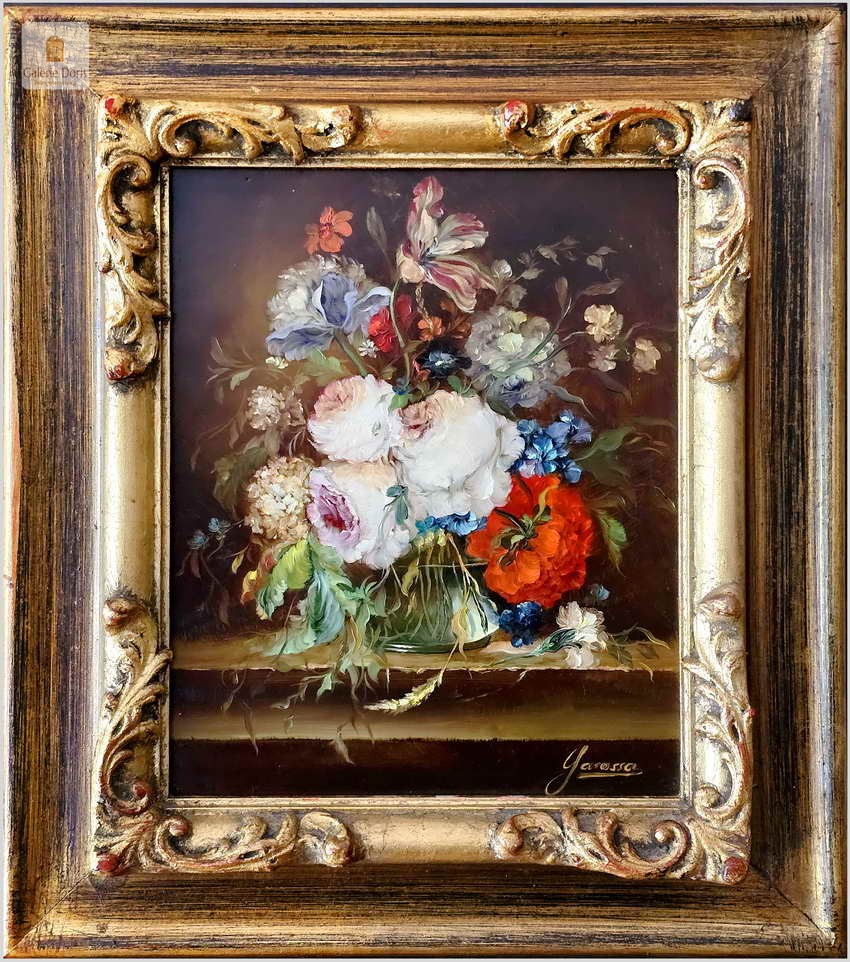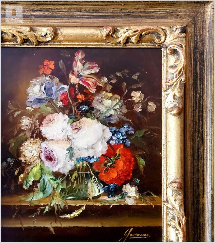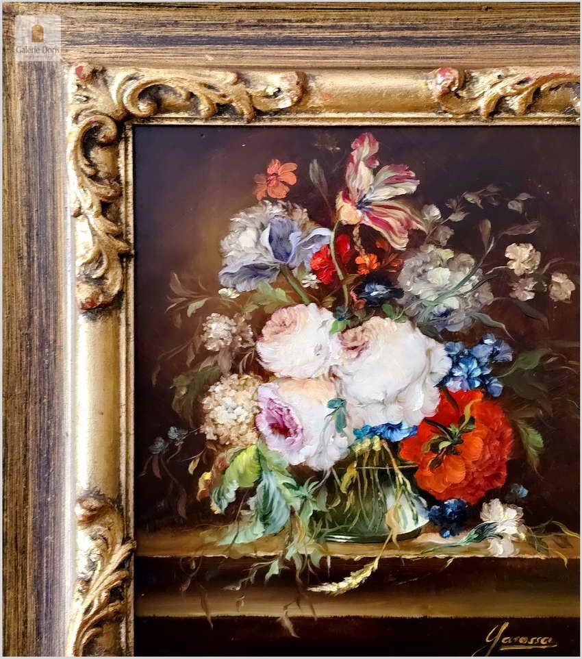 Polecamy wspaniały pałacowy w stylu baroku obraz olejny. Bogata kompozycja kwiatów, bardzo dekoracyjny ręcznie malowany obraz olejny "Bukiety kwiatów na kamiennym cokole", sygnowany "Garossa" w prawym dolnym rogu. Prawdopodobnie wykonany około 1950 roku lub wcześniej w stylu i wzorowany na dawnych mistrzach holenderskiego baroku. Obraz olejny przedstawia bukiet kwiatów umieszczony w ozdobnej ramie. Kwiaty są żywe, o różnych kolorach i odmianach, a tło jest ciemne, co podkreśla ich piękno. Na obrazie widnieje podpis Garossa. Wykonane w piękny, akademicki sposób dawnych mistrzów. Polecamy!