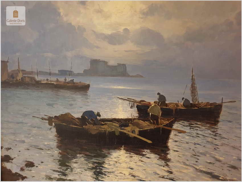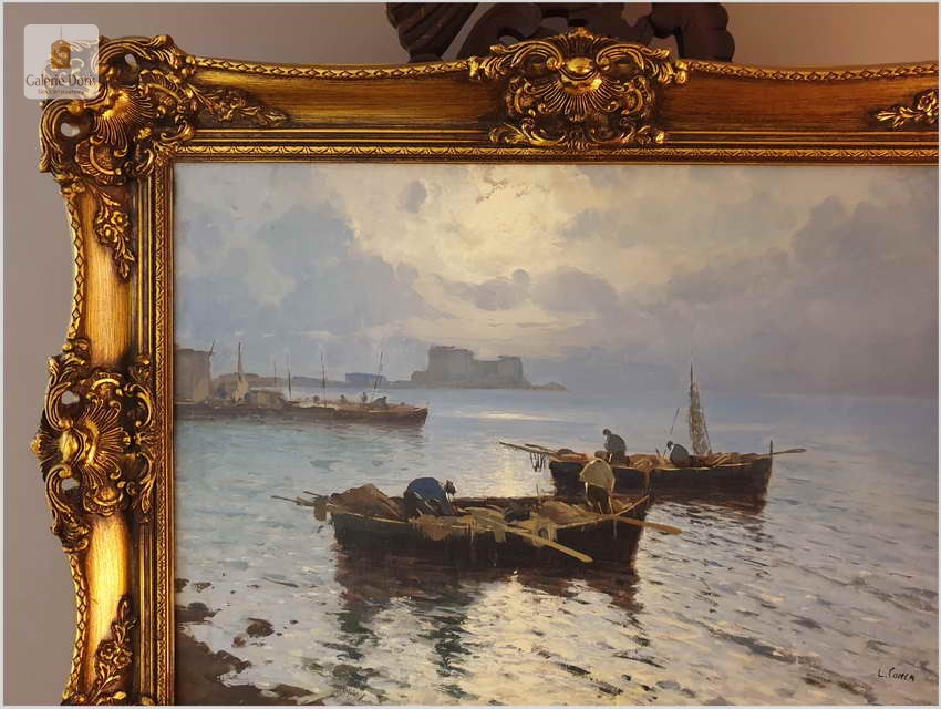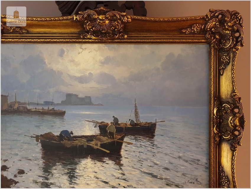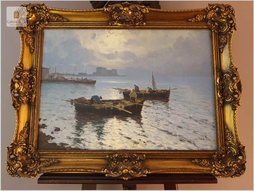 Przepiękny stary obraz olejny na płótnie, przedstawiający rozległy widok na zatokę neapolitańską (Golfo di Napoli). Na pierwszym planie łodzie z rybakami w zatoczce. W tle zarysowują się góry i dalsza część wyspy, zabudowania nadmorskiego miasteczka. Ten urokliwy krajobraz ma nadzwyczajną moc podnoszenia nastroju i przenosi patrzącego w sentymentalną podróż do śródziemnomorskich krajów.
