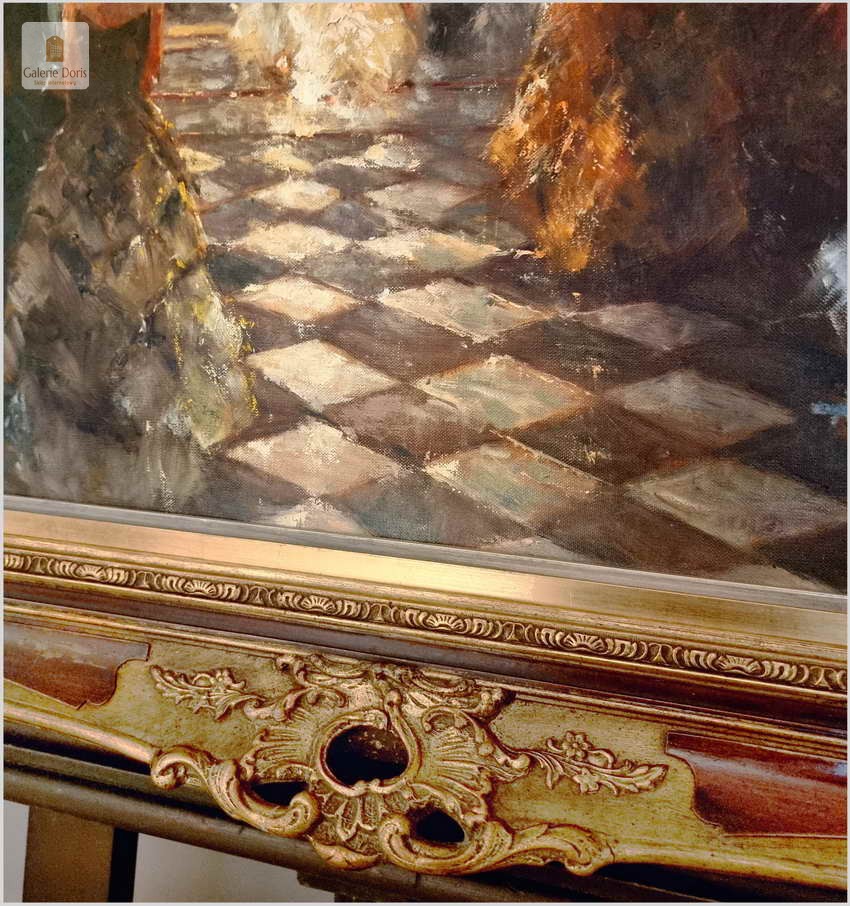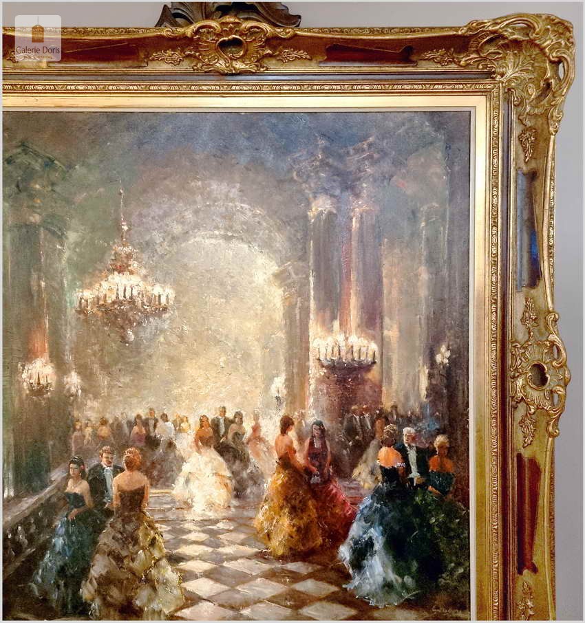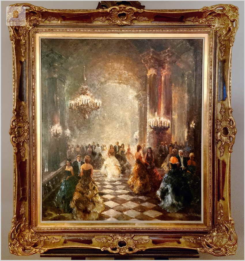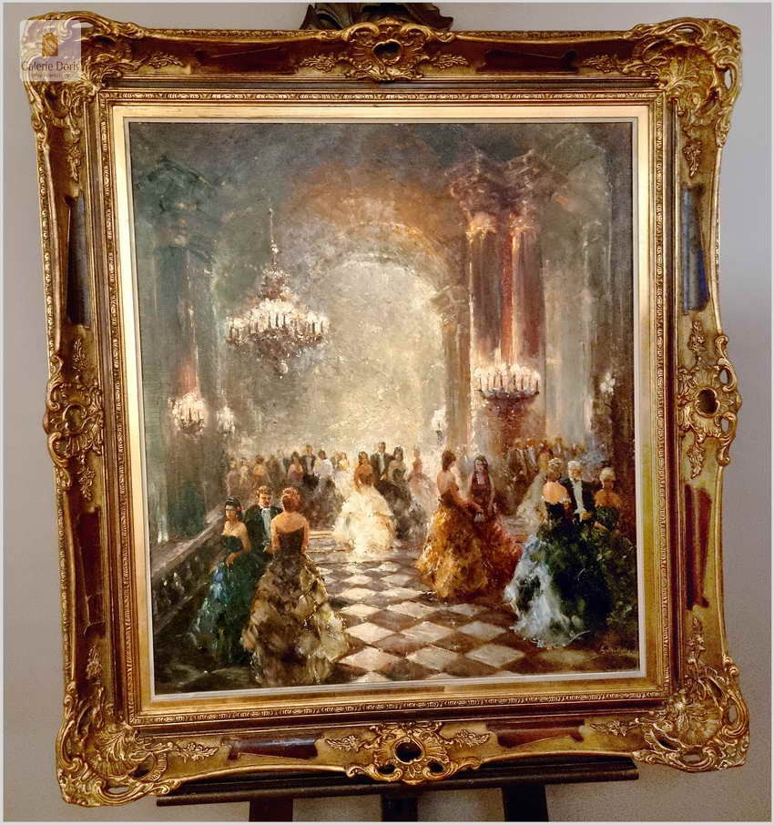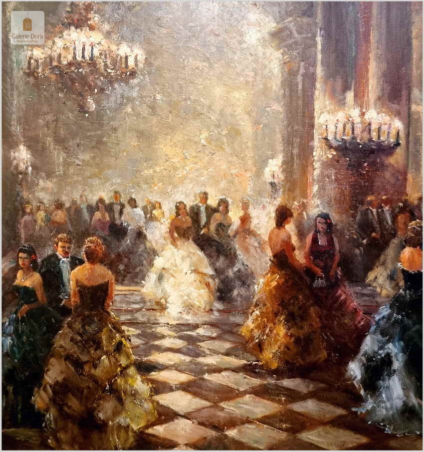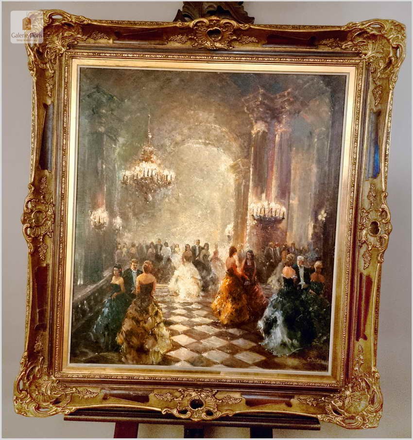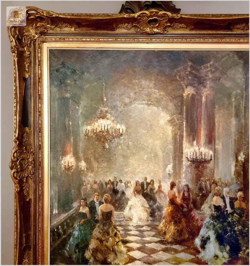 Polecamy kolejne dzieło sztuki w ofercie naszego sklepu. Obraz znanego niemieckiego impresjonisty. Obraz olejny przedstawia scenę balu w eleganckim wnętrzu z postaciami w strojach z epoki, tańczącymi na marmurowej podłodze w szachownicę. Obraz jest namalowany olejami na płótnie i umieszczony w ozdobnej, złotej ramie z misternymi zdobieniami. W tle widać wysokie kolumny i draperie, co nadaje wnętrzu królewski wygląd. Na suficie wiszą okazałe żyrandole. Artysta uchwycił ruch i energię tańca, co widać w dynamicznych pociągnięciach pędzla. Oświetlenie w obrazie jest stonowane, podkreślając postacie tańczących i tworząc cienie, które dodają głębi scenie.