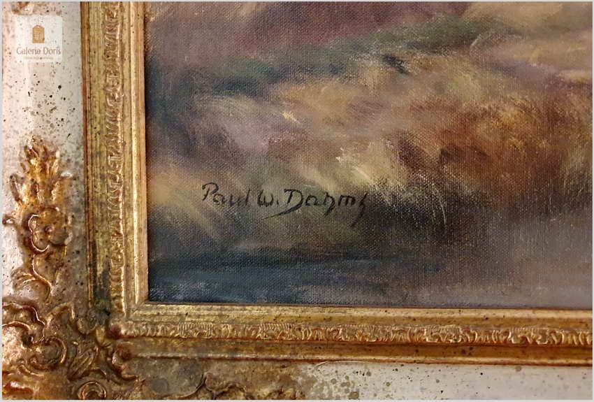 Obraz malowany w technice pędzla, struktura nałożonej farby wyczuwalna mocno pod palcami. Sygnowany Paul Wilhelm Dahms. Obraz oprawiony jest w przestrzenną, bogatą ramę. Obrazy artysty cieszą się dużym powodzeniem na aukcjach sztuki. Portal notowań aukcyjnych Artprice odnotowuje 141 sprzedane obrazy tego artysty.