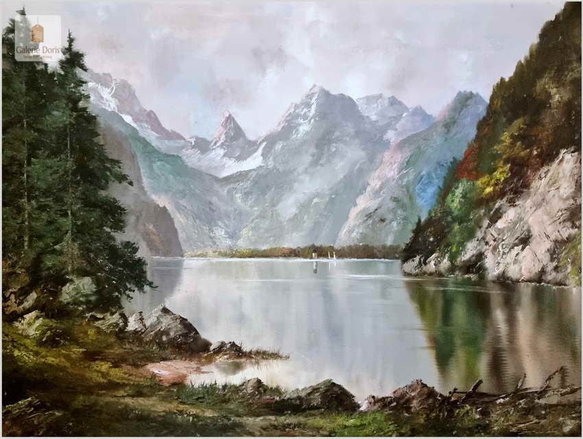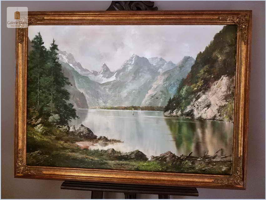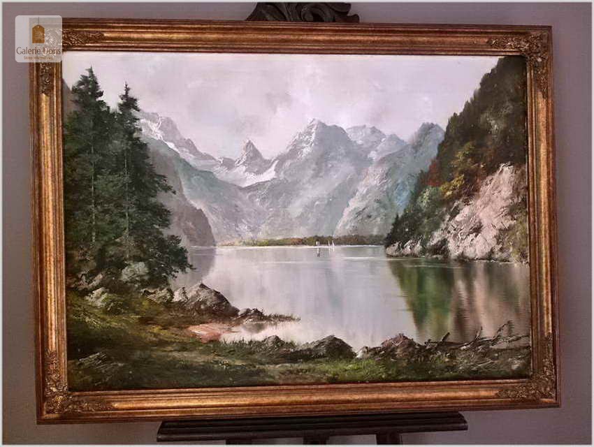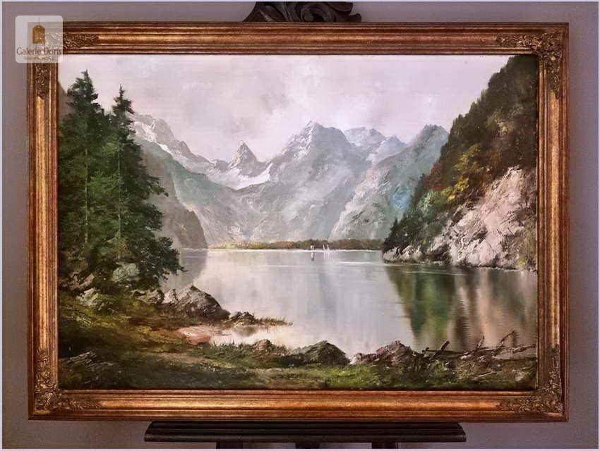 Obraz olejny na płótnie, osadzony w  stylowej ramie. Erich Griese malował przede wszystkim krajobrazy; z Moraw, Dolnej i Górnej Austrii, z Tyrolu, Alp i Bawarii. W jego pracach opartych o solidne studia z natury, romantycznych w charakterze i nastroju, czytelne są inspiracje i wpływy pejzażowego malarstwa Maxa Haushofera. Chętnie wprowadzał efekty luministyczne, budowane grą światła i cienia. Obraz olejny przedstawia Königssee (pol. Jezioro królewskie) to jezioro w Bawarii. Leży na południowy wschód od Monachium. Niezwykle dekoracyjny nastrojowy obraz idealna dekoracja salonu.