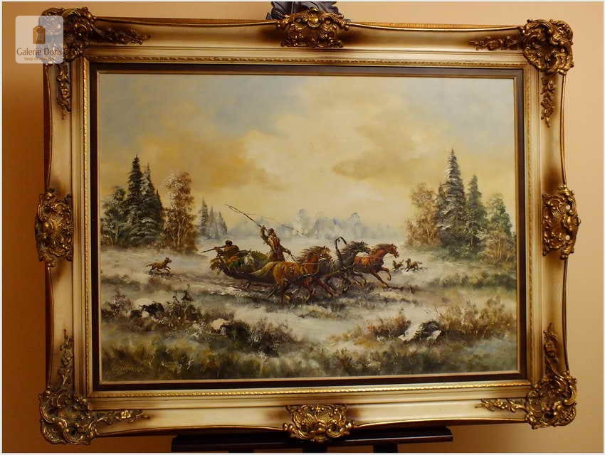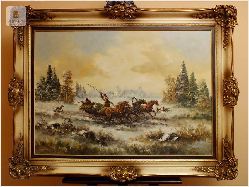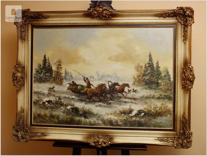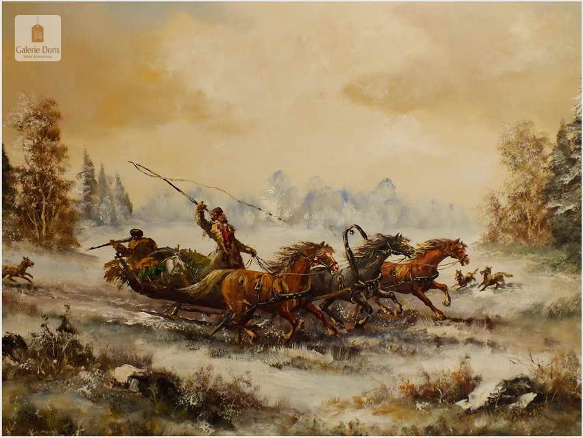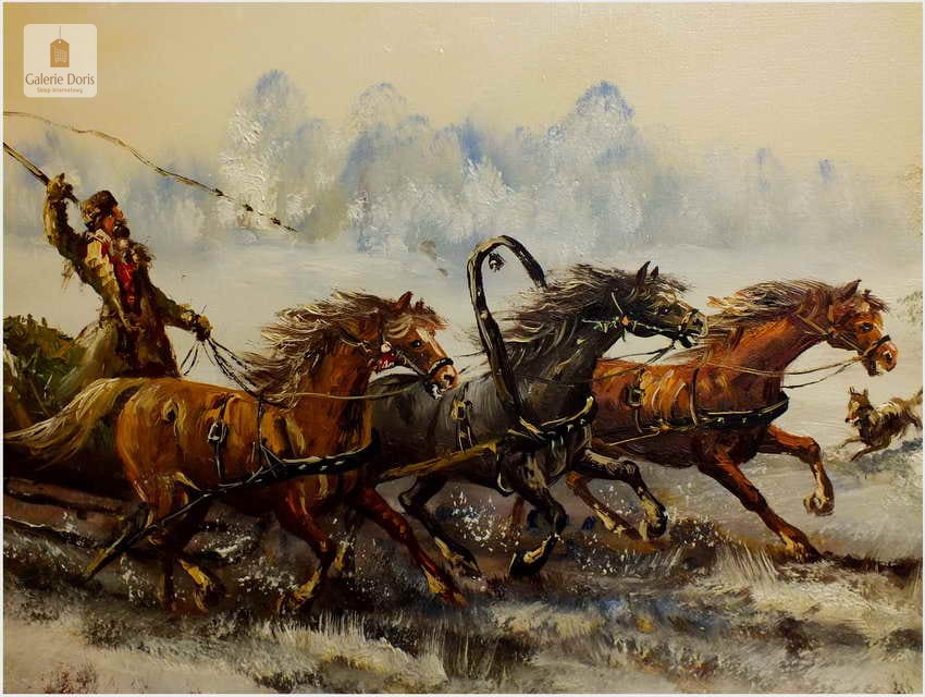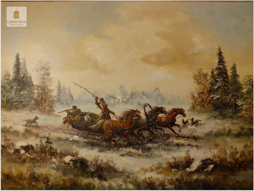 Wspaniały, ogromny stary obraz olejny na płótnie. Przedstawia niezwykle dynamiczną scenę ataku przez wilki na ruską Trojkę w zimowej scenerii. Znakomite ukazanie koni w pędzie, biegnących za nimi wilków nadaje kompozycji niebywałej ekspresji. Wysmakowana paleta zniuansowanych barw oraz subtelne efekty światłocieniowe przepięknie oddają plastyczność zimowego pejzażu stepowego. Obraz cechuje świetna technika malarska, struktura farby wyraźnie wyczuwalna pod palcami. Oprawę obrazu stanowi śliczna przestrzenna rama wykonana z drewna. Obraz jest duży i ciężki. Malowidło sygnowane w lewym dolnym rogu. Będzie z pewnością liczącym się obrazem w Państwa kolekcji, domu.