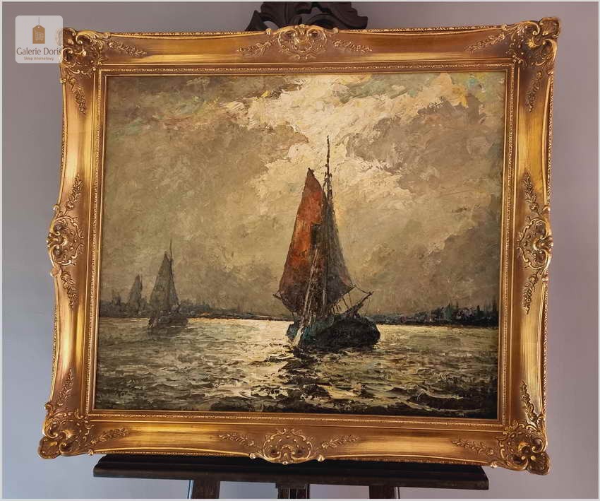 Obraz o tematyce marynistycznej znanego i cenionego malarza niemieckiego Helmut Kaluza, notowany na Artprice. Widoczny obraz to olej na płótnie o imponujących wymiarach, malarstwo fakturalne. Stan bardzo dobry, płótno bez uszkodzeń, Obraz sygnowany w rogu nazwiskiem malarza: Kaluza - Polecamy, świetna inwestycja, cudowna ozdoba! Całość prezentuje się wspaniale. Mistrzowskie posunięcia pędzla oraz doborowa kolorystyka odbicia na wodzie blasku księżyca, czyni obraz wielce dekoracyjnym. Należy tu wspomnieć, że obrazy z rodzaju nokturnu - Nokturn (z łac. nocturnus – nocny, od nox, noctis – noc) – obraz przedstawiający scenę nocną (...), zazwyczaj malowane są w ubogiej tonacji kolorystycznej, dlatego po tę tematykę sięgają tylko bardziej utalentowani malarze. Oferowany obraz będzie z pewnością pięknym eksponatem w Państwa kolekcji, domu.