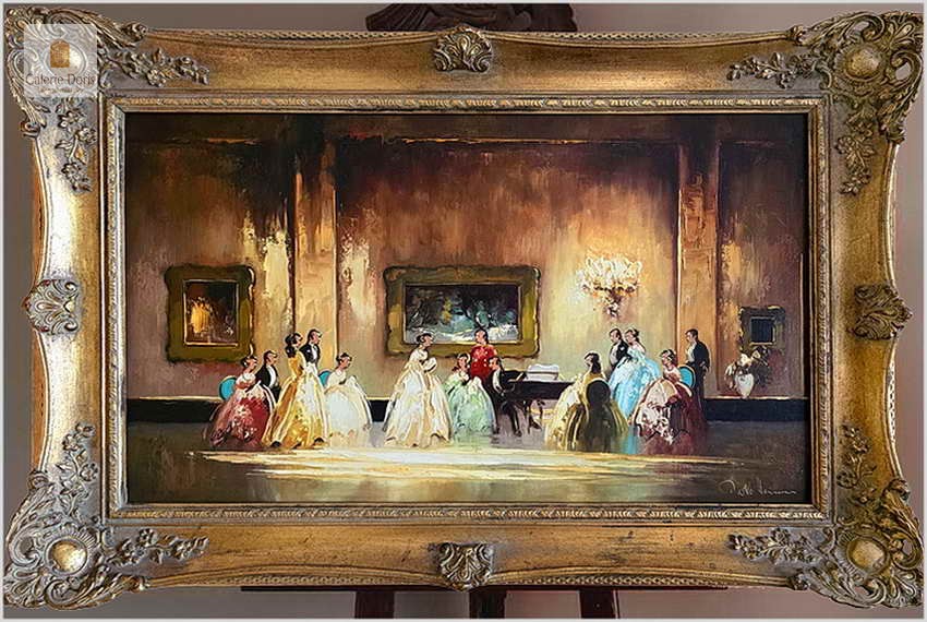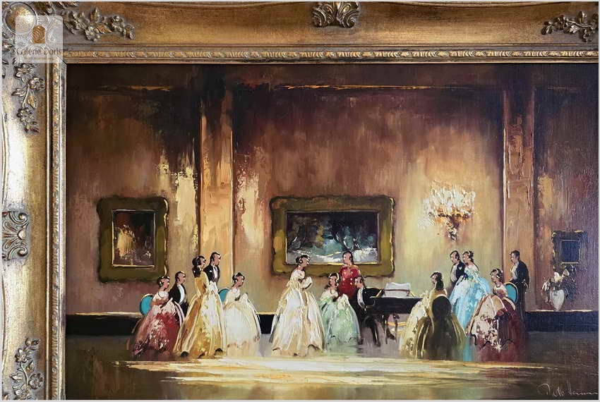 Obraz przedstawia elegancką scenę wnętrza, prawdopodobnie z historycznego okresu. Na obrazie widoczne są liczne postacie, w większości kobiety w bogato zdobionych sukniach z szerokimi spódnicami, które są na koncercie na klawesyn w bali balowej. Centralną postacią jest kobieta w białej sukni, która wydaje się być punktem centralnym obok instrumentu muzycznego. Sceneria zawiera architektoniczne detale takie jak kolumny i ozdobny kominek, wskazujące na wystawne pomieszczenie. Nad sceną przedstawioną na obrazie znajduje się ozdobne obrazy w ramach z dekoracyjnymi elementami. Stan idealny - Polecamy!