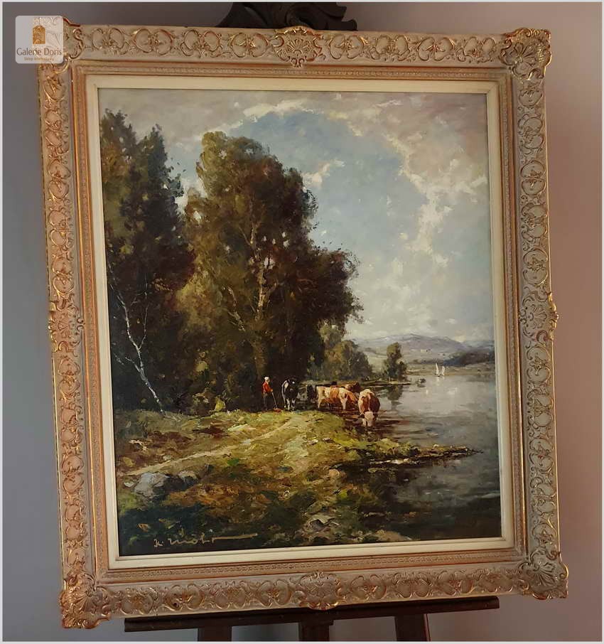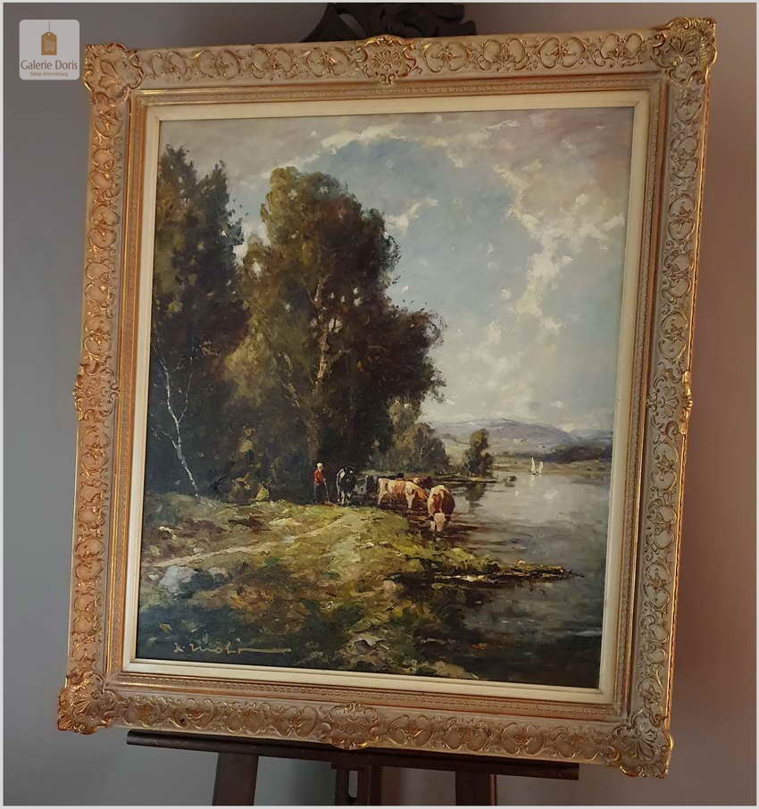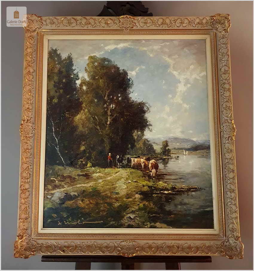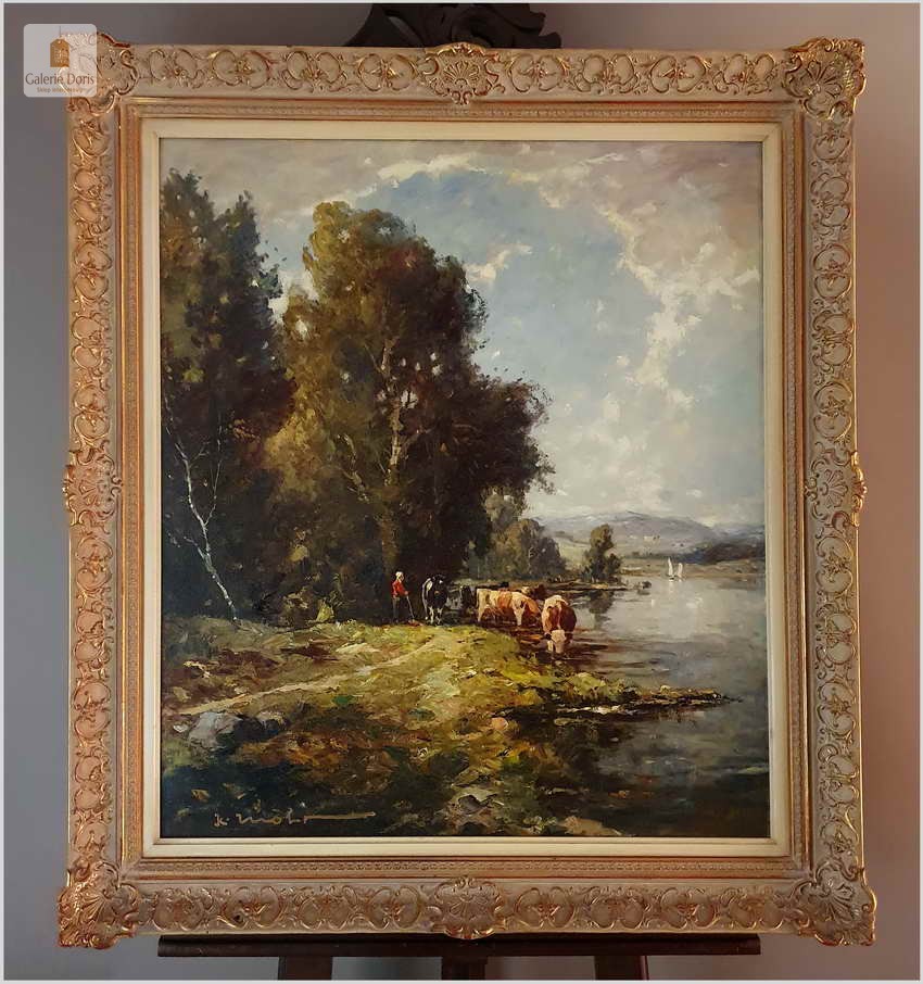Niezwykle dekoracyjny, oryginalny  obraz malowany farbami olejnymi na płótnie. Obraz przedstawia scenę z życia wsi, pasące u wodopoju krowy. Sygnowany lewy dół: K. Mohr. Całość oprawiona w oryginalną, starą, okazałą przestrzenną ramę. Obrazy artysty cieszą się niezwykle dużym powodzeniem na aukcjach dzieł sztuki.