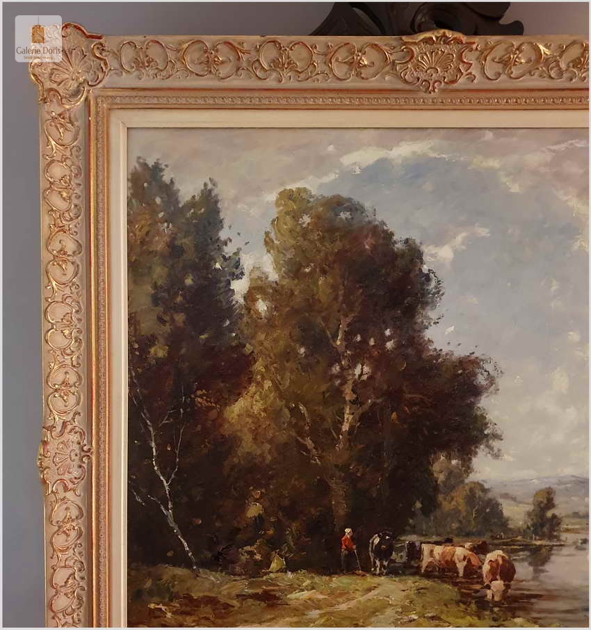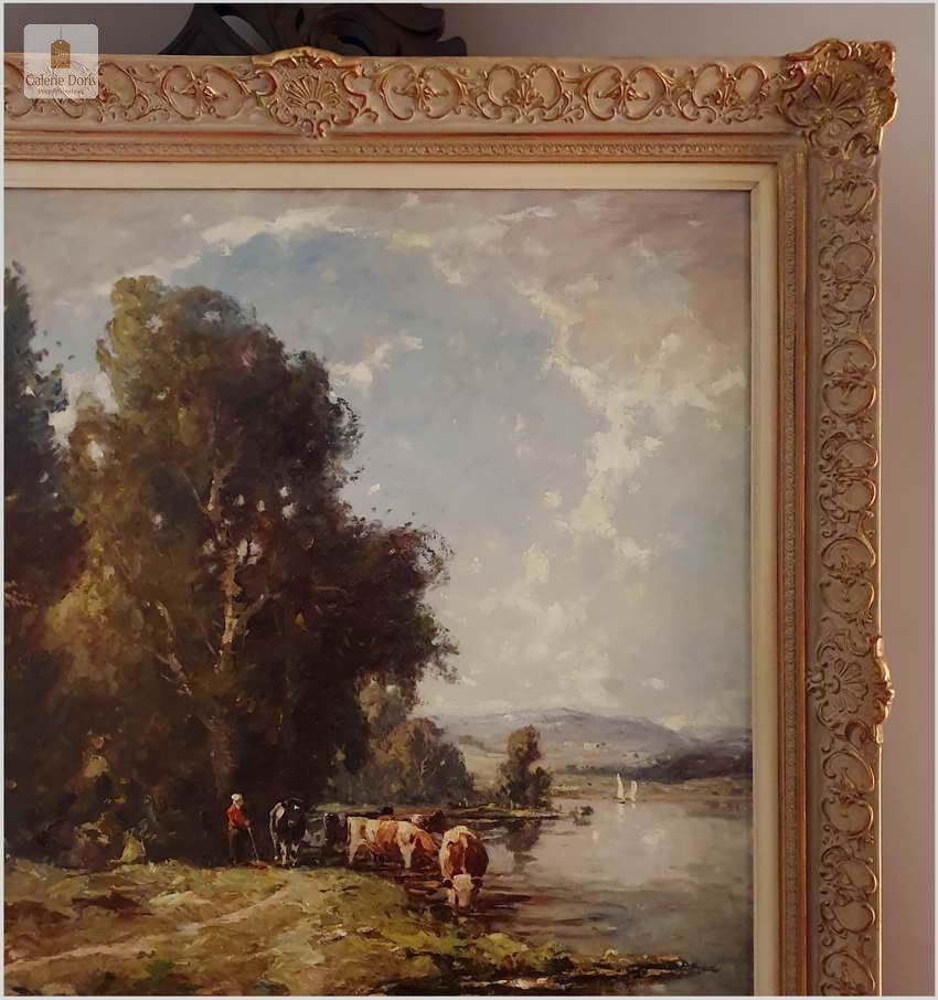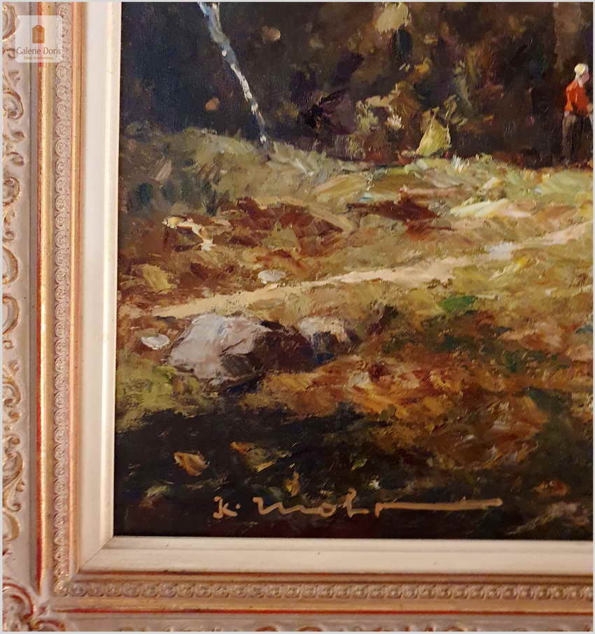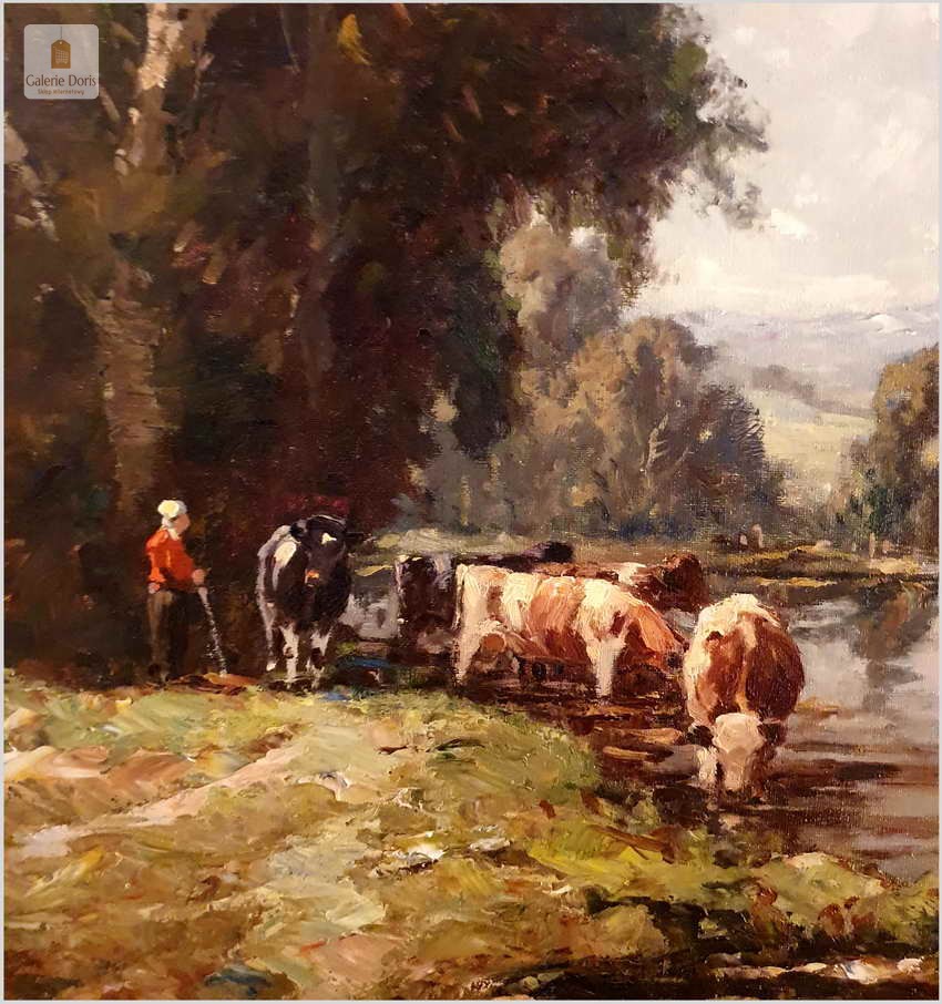 Niezwykle dekoracyjny, oryginalny  obraz malowany farbami olejnymi na płótnie. Obraz przedstawia scenę z życia wsi, pasące u wodopoju krowy. Sygnowany lewy dół: K. Mohr. Całość oprawiona w oryginalną, starą, okazałą przestrzenną ramę. Obrazy artysty cieszą się niezwykle dużym powodzeniem na aukcjach dzieł sztuki.