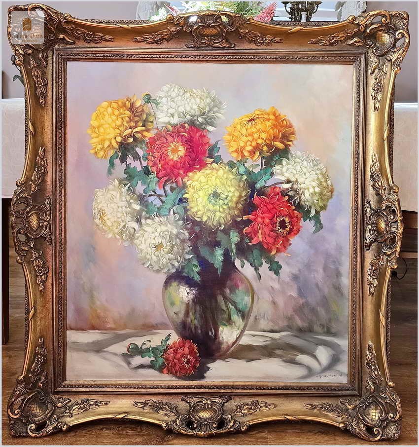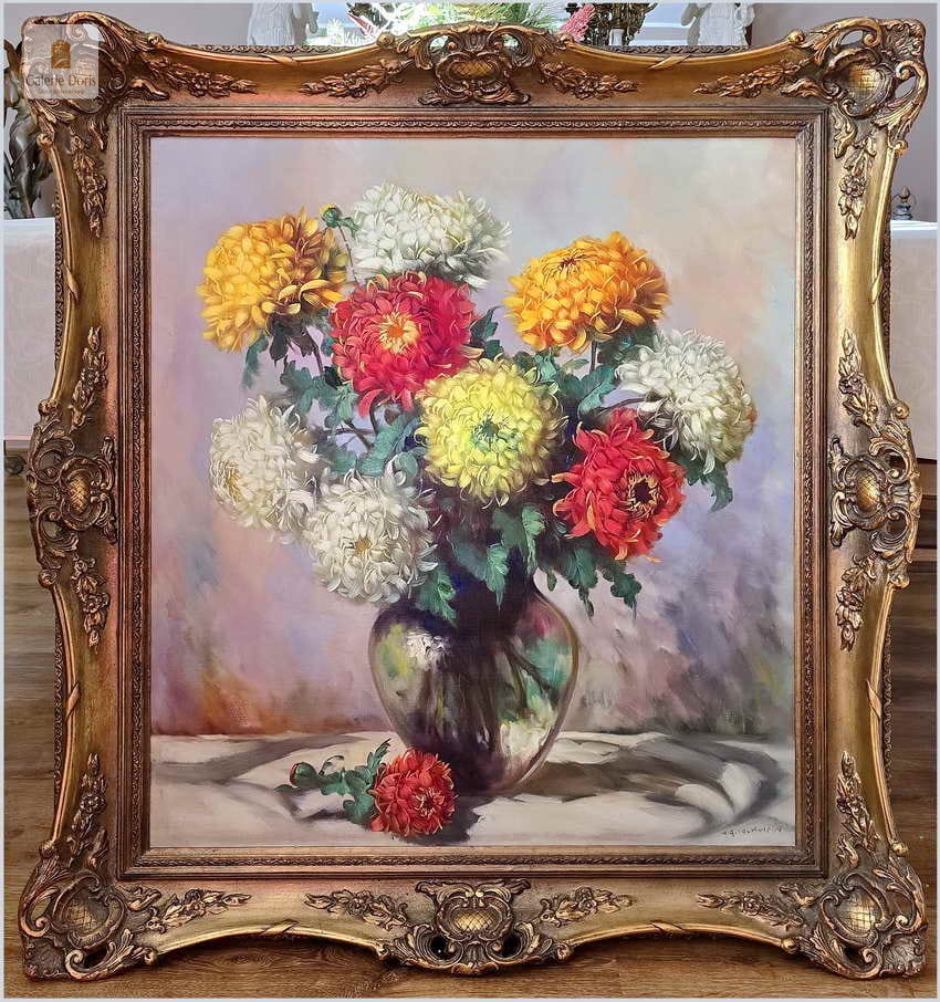 Polecamy niezwykle piękny stary obraz olejny przedstawiający Bukiet kwiatów w wazonie, namalowany olejem na płótnie. Struktura farby wyraźnie wyczuwalna pod palcami. Obraz oprawiony jest w przestrzenną, grubą ramę wykonaną z drewna. Całość jest sygnowana w dolnym rogu ramy. Obraz malowany na grubym płótnie malarskim. Obraz przedstawia typową pracę artysty z kręgu „martwych natur”. Jego malarstwo było zawsze ozdobą i wzbudzało ogromne zainteresowanie szerokiej publiczności.