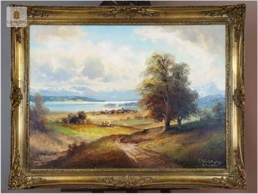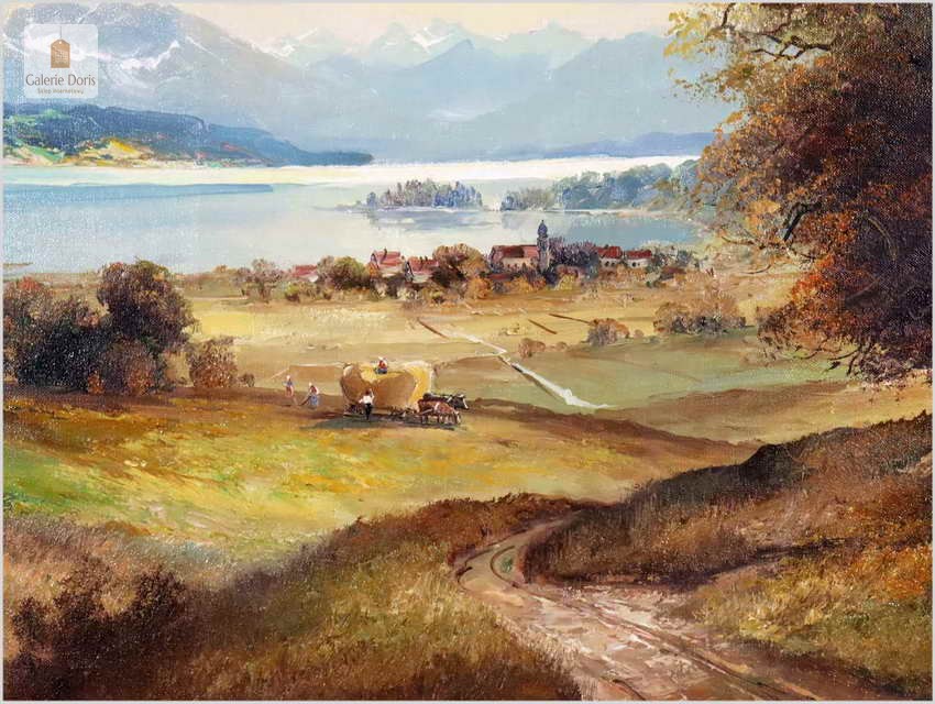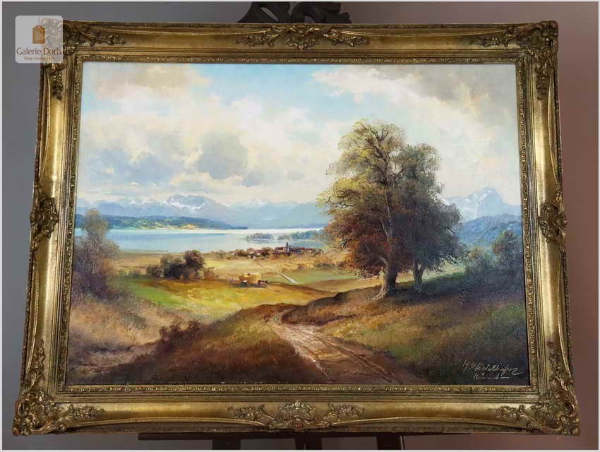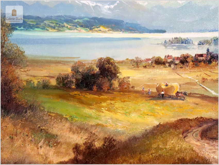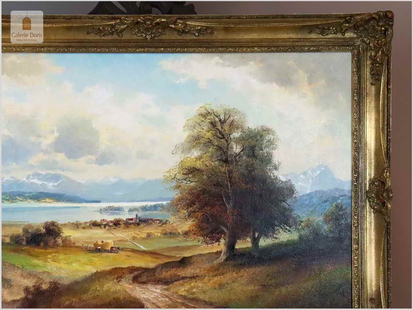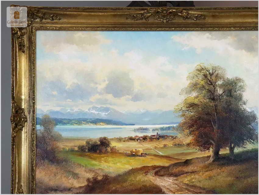 Niezwykle piękny, romantyczny krajobraz, przedstawiający malowniczo położoną dolinę koło Chiemsse z charakterystyczną wyspą, to subtelnie malowany obraz olejny na płótnie. Wspaniale oddano partię nieba oraz rozległy widok na horyzont i otaczające go góry. Soczysta zieleń majestatycznej roślinności kontrastuje z pastelami nieba i górskich szczytów. Obraz przedstawia sianokosy, nastrojowa kompozycja. Ten relaksujący duży pejzaż odznacza się delikatnie prowadzonymi liniami pędzla i wysmakowaną grą barw. Cechuje go świetna technika malarska. Obraz oprawiony jest w przestrzenną, grubą ramę wykonaną z drewna. Złoconą ramę ozdabiają misterne sztukaterie. Stan obrazu oraz ramy b.dobry - do obrazu dołączamy certyfikat - Polecamy!.