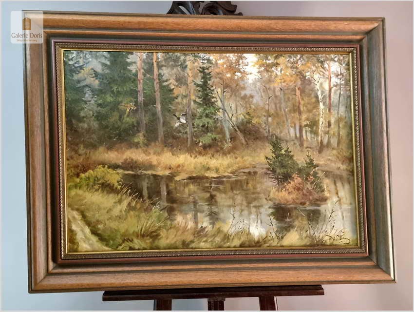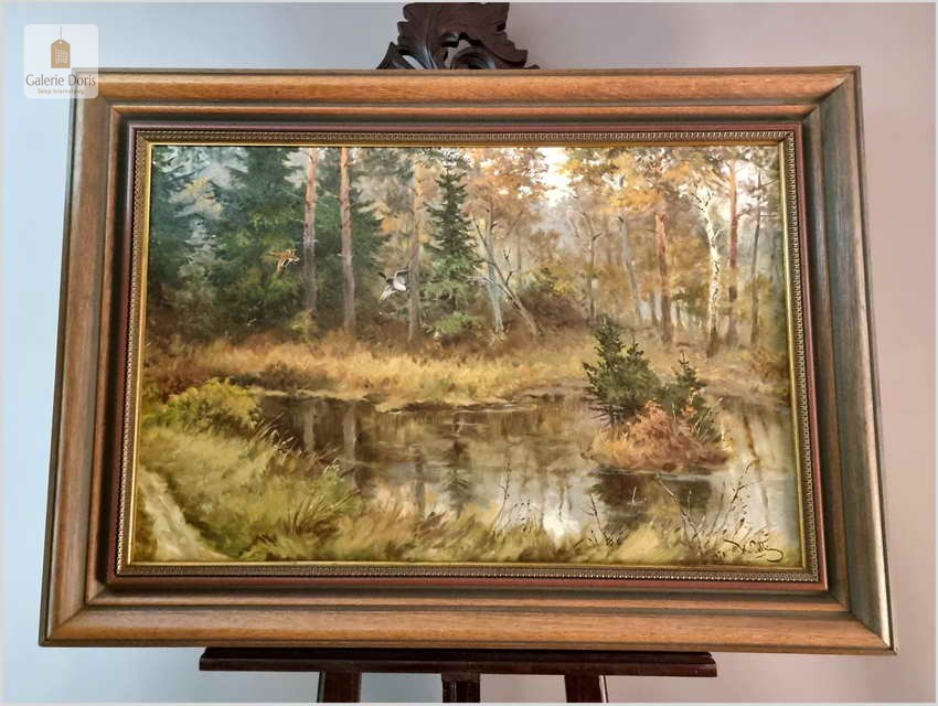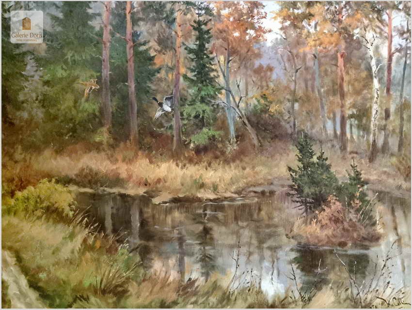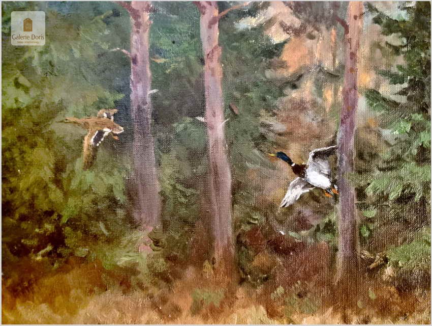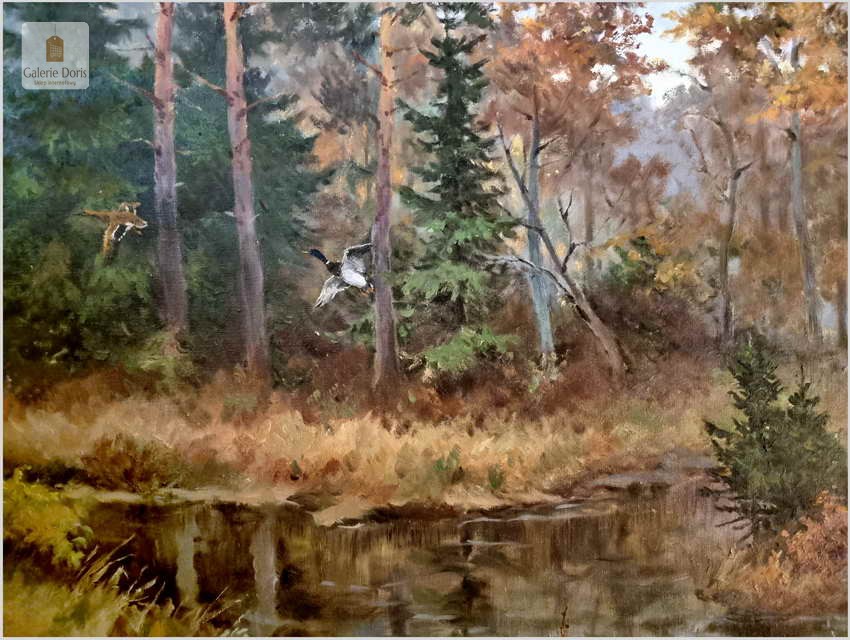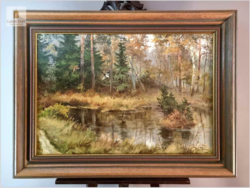 Wczesno jesienny pejzaż z jeziorem, łąką i lasem w tle. Na głównym planie widzimy kaczki krzyżówki wznoszące się wśród porannych mgieł. Całość namalowana w przyjaznych dla oka, ciepłych pastelowych kolorach. Obraz został namalowany przez niemieckiego malarza urodzonego w Rydze na Łotwie. Sygnowany odręcznie przez artystę w dolnym narożniku. Obraz został oprawiony w oryginalną bardzo solidną, dekoracyjną dębową ramę w kolorze brązu z okresu powstania malowidła. Obraz niezwykle dekoracyjny, będzie znakomitą ozdobą Państwa salonu
