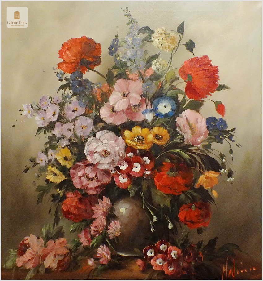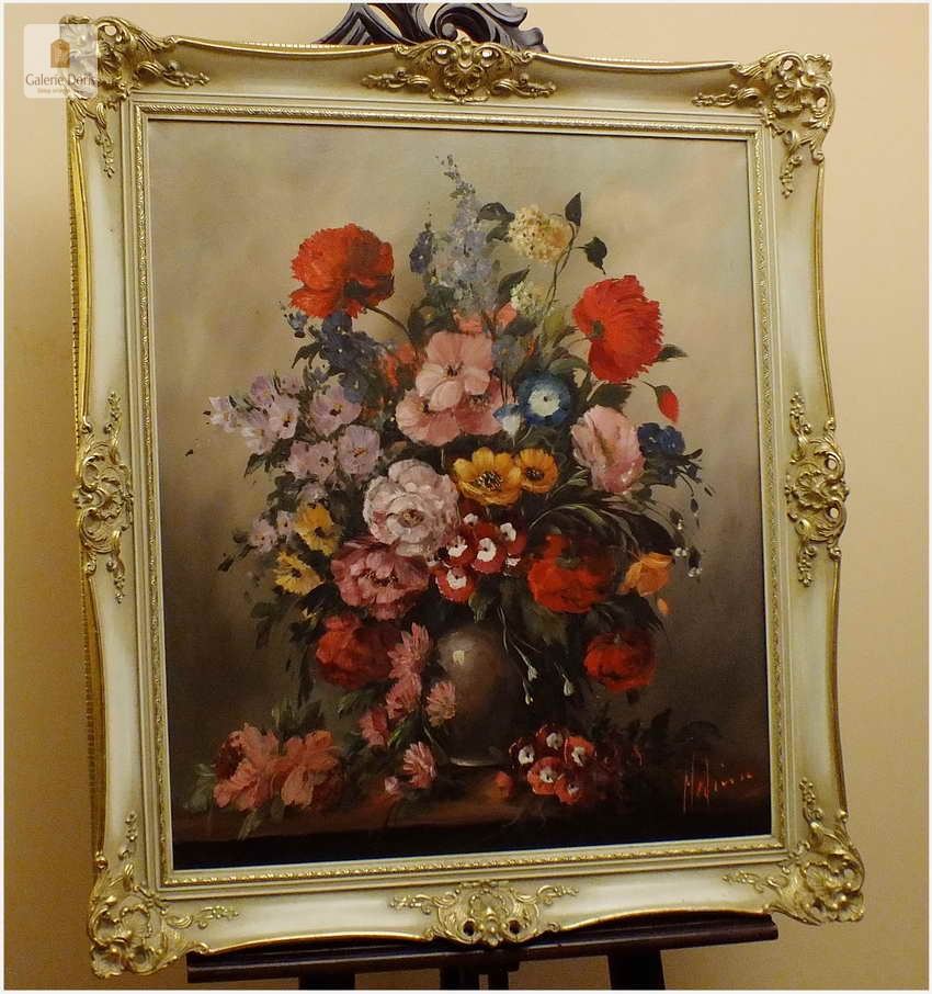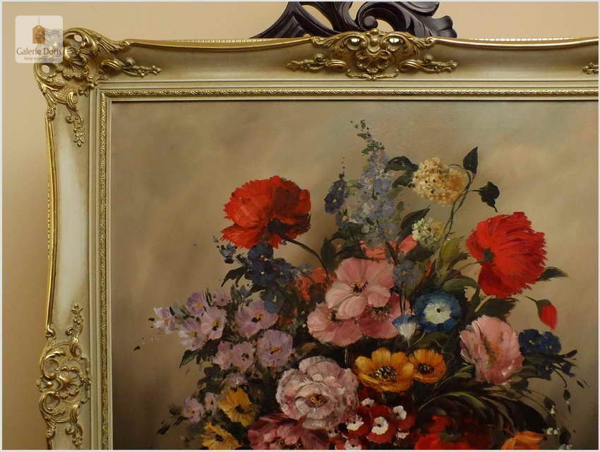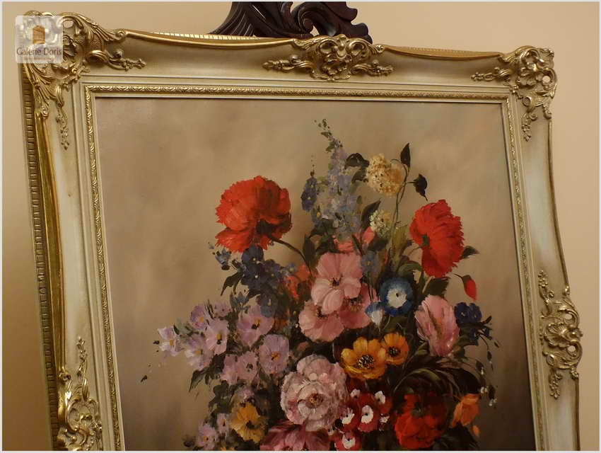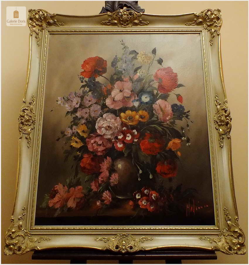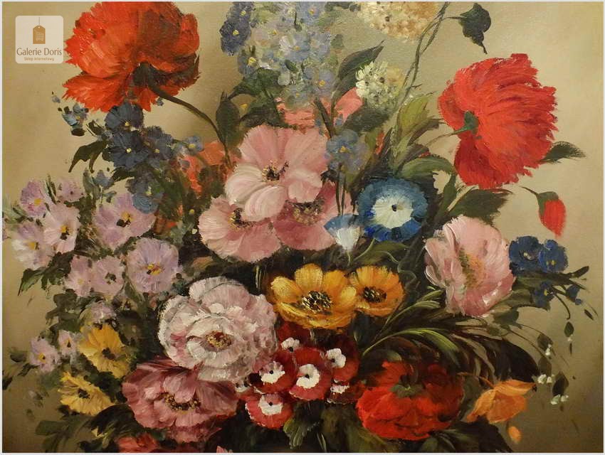 Polecamy niezwykle piękny stary obraz olejny przedstawiający Bukiet kwiatów w wazonie, namalowany olejem na płótnie. Struktura farby wyraźnie wyczuwalna pod palcami. Obraz oprawiony jest w przestrzenną, grubą ramę wykonaną z drewna. Całość jest sygnowana w prawym dolnym rogu ramy. Obraz malowany na grubym płótnie malarskim. Obraz przedstawia typową pracę artysty z  kręgu „martwych natur”. Autor ukazał nam bukiet kwiatów namalowanych w stylu malarstwa XVIII-wiecznego tzw flamandzkiego. Jej malarstwo było zawsze ozdobą i wzbudzało ogromne zainteresowanie szerokiej publiczności.