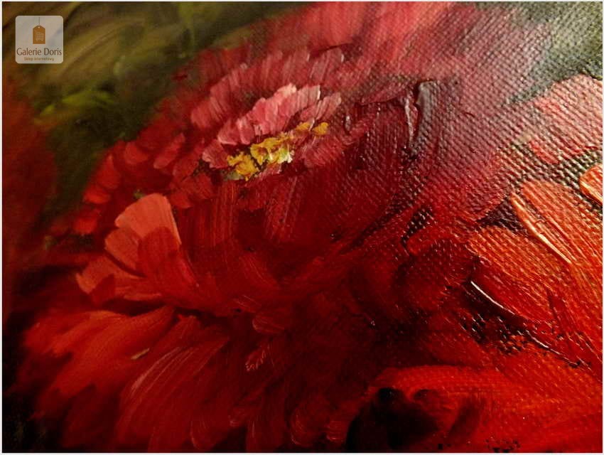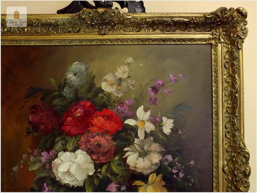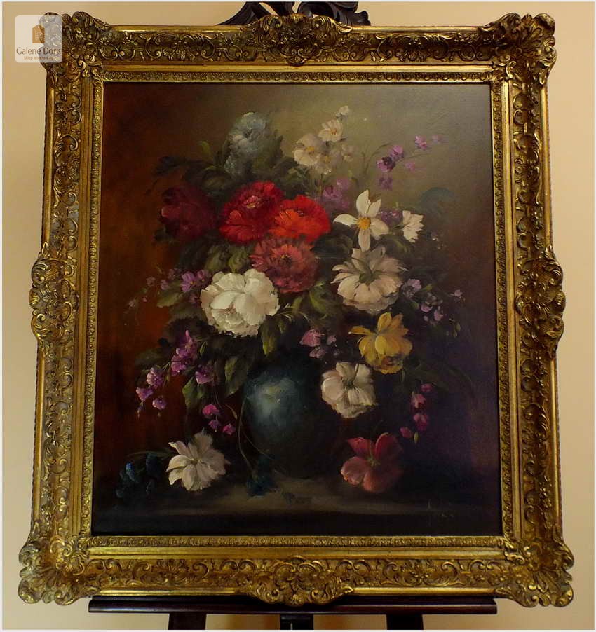 Polecamy niezwykle piękny stary obraz olejny przedstawiający Bukiet kwiatów w wazonie, namalowany olejem na płótnie. Struktura farby wyraźnie wyczuwalna pod palcami. Obraz oprawiony jest w przestrzenną, grubą ramę wykonaną z drewna. Całość jest sygnowana w prawym dolnym rogu ramy. Obraz malowany na grubym płótnie malarskim. Obraz przedstawia typową pracę artysty z  kręgu „martwych natur”. Autor ukazał nam bukiet kwiatów namalowanych w stylu malarstwa XVIII-wiecznego tzw flamandzkiego. Jej malarstwo było zawsze ozdobą i wzbudzało ogromne zainteresowanie szerokiej publiczności.