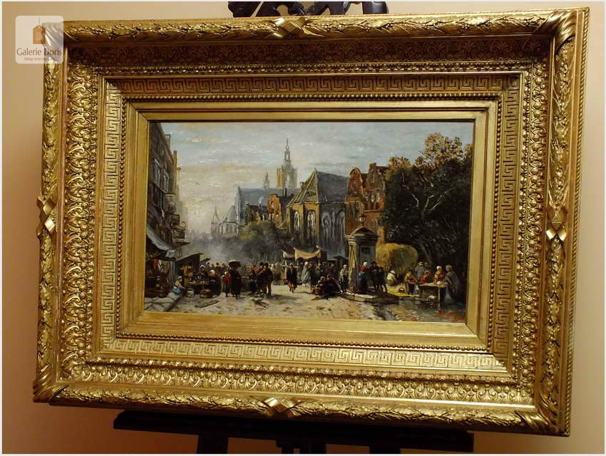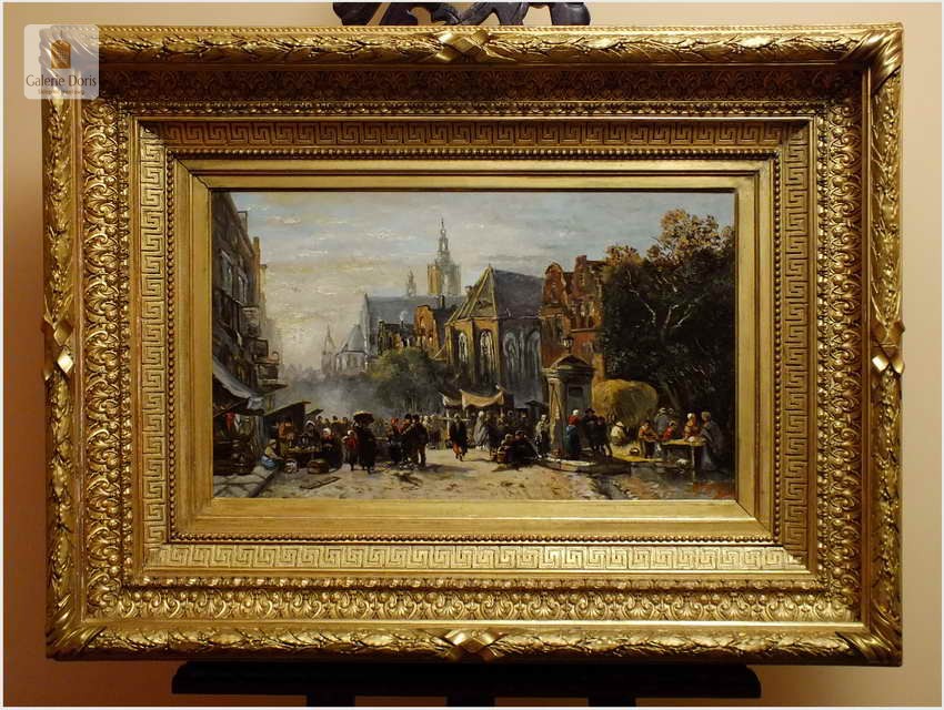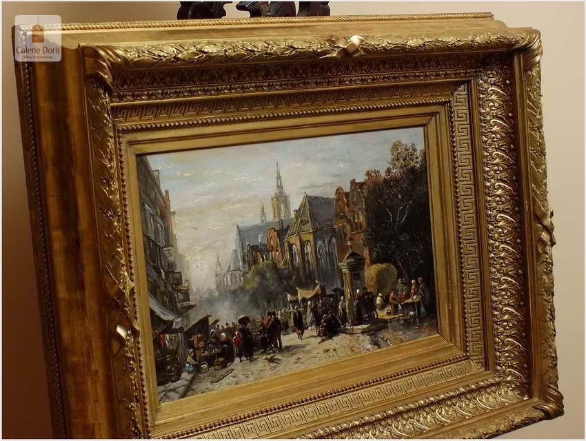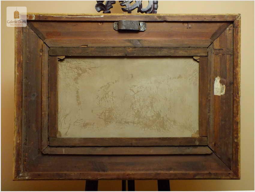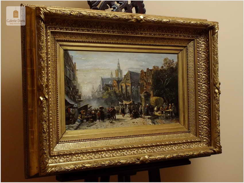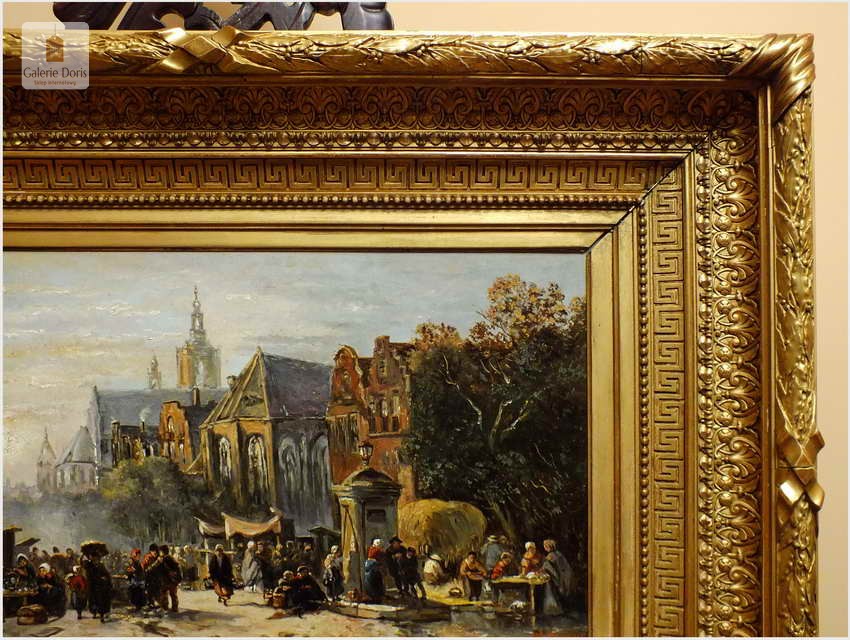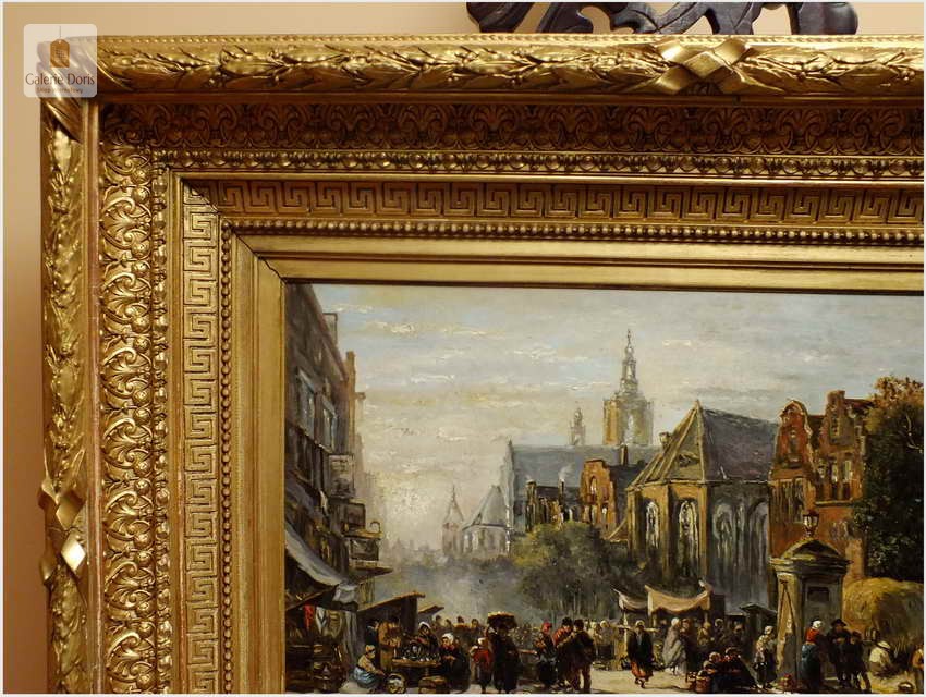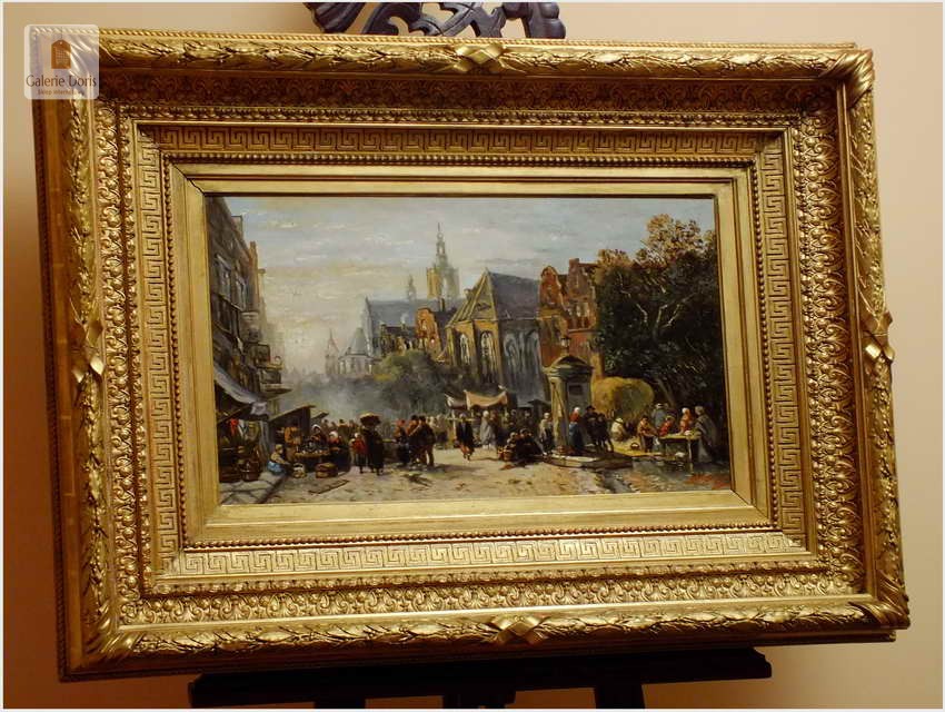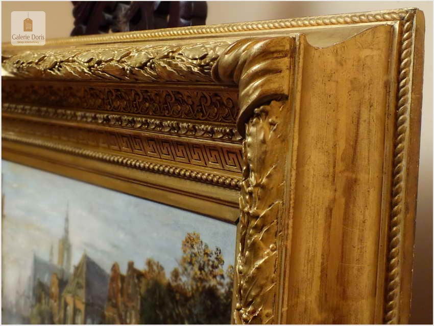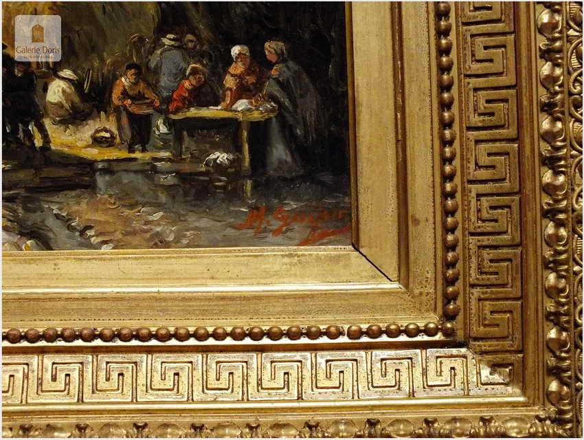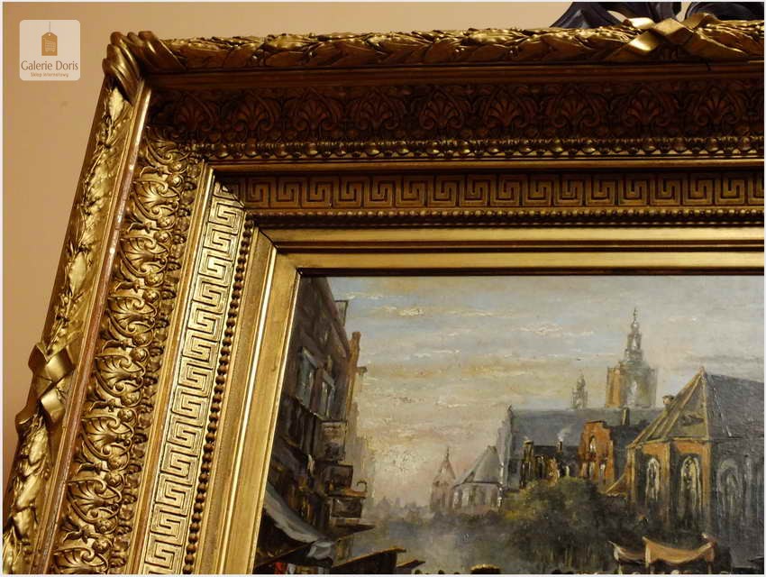 Polecamy wytworne pałacowe malarstwo, obraz olejny na płótnie sygnowany w prawym dolnym rogu M.Gaisser. Malarz przedstawił nam scenę rodzajową rozgrywającą się w klimacie XVII wiecznej Flandrii nad kanałem w Andwerpii (Belgia). Barokowa rama po małych naprawach, rozszczelnienie na narożnikach. Całość prezentuje się wspaniale, biografia na podstawie sygnatury. Obraz należy zaliczyć do dobrego nurtu malarstwa pałacowego.