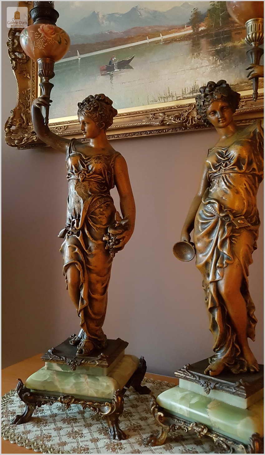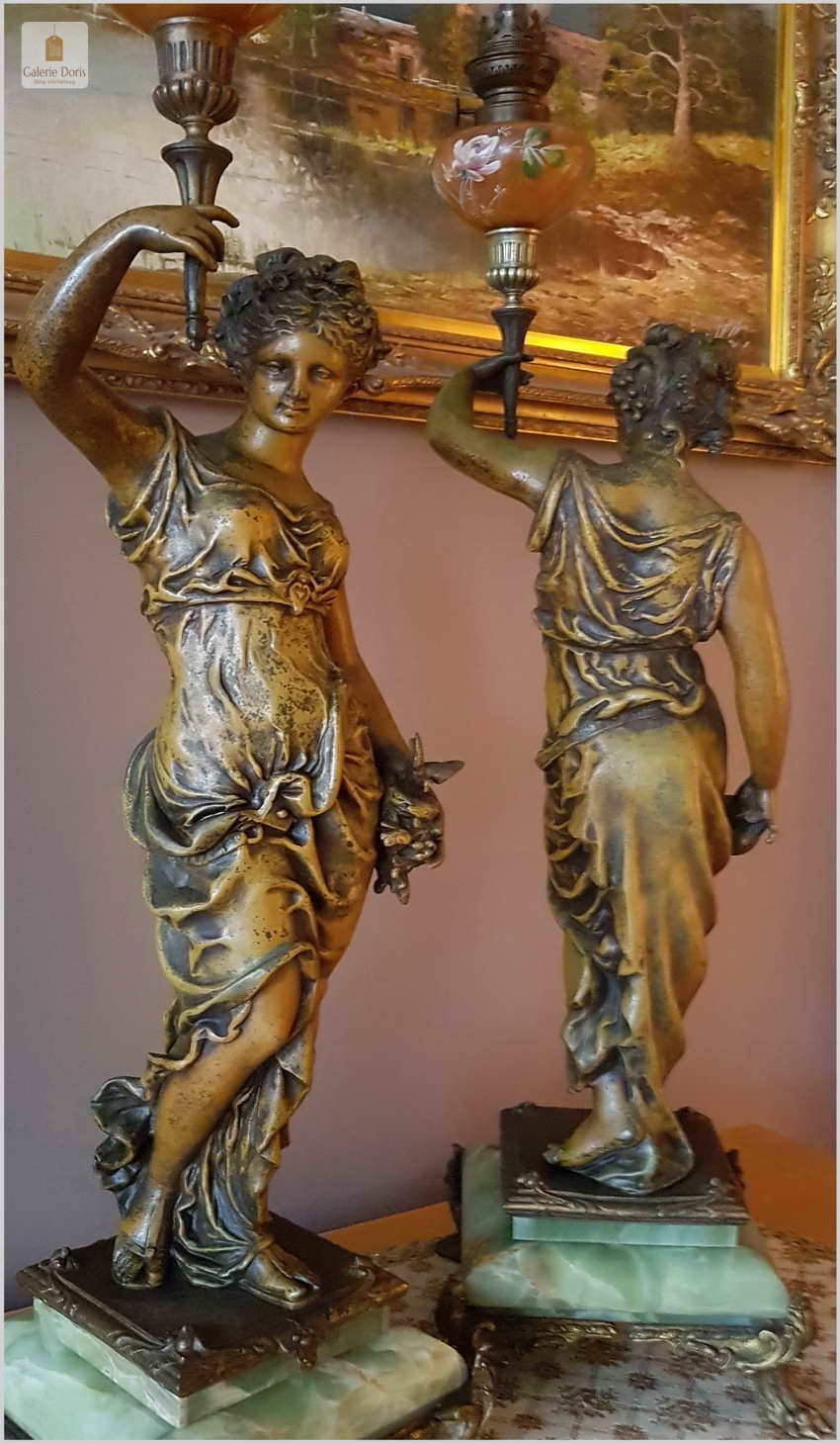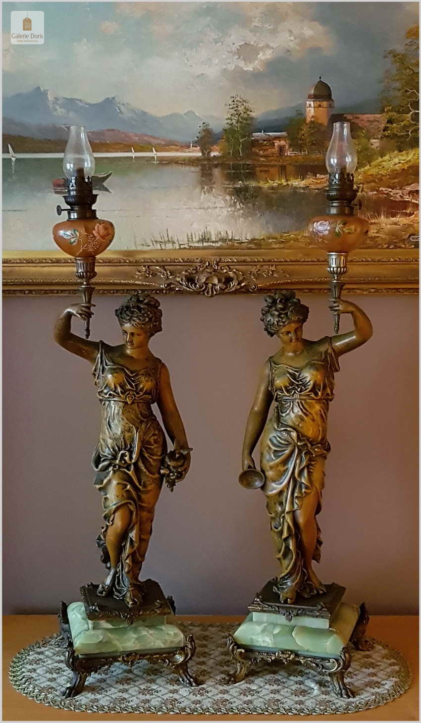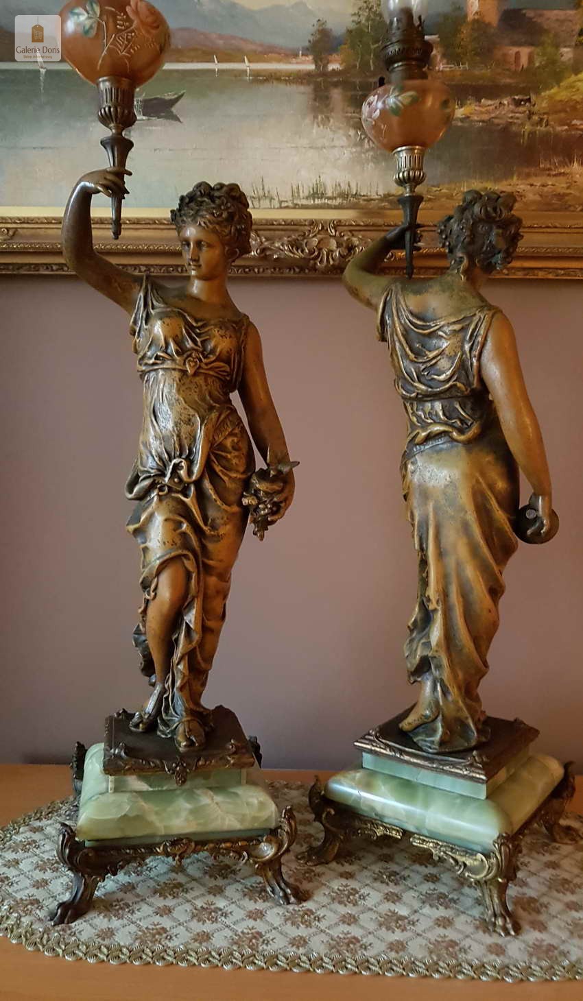 Polecamy piękny stary komplet Lamp Figuralnych, naftowych - oryginał!. Lampy wykonane w typowych stylach i ornamentach z epoki. Podstawa z onyx, oryginalna z epoki -Polecamy!