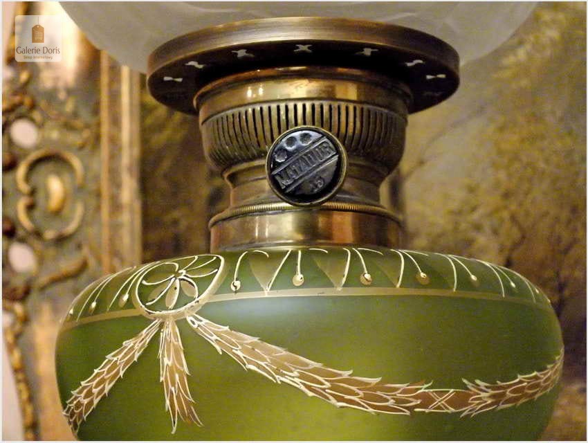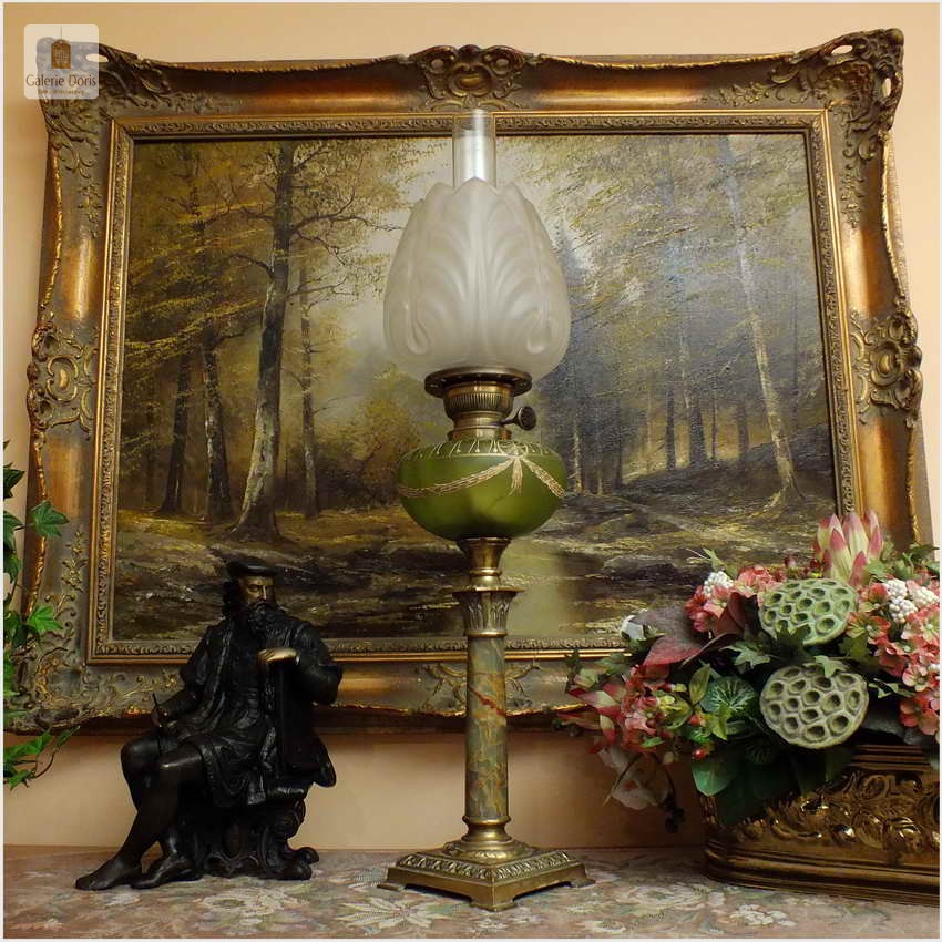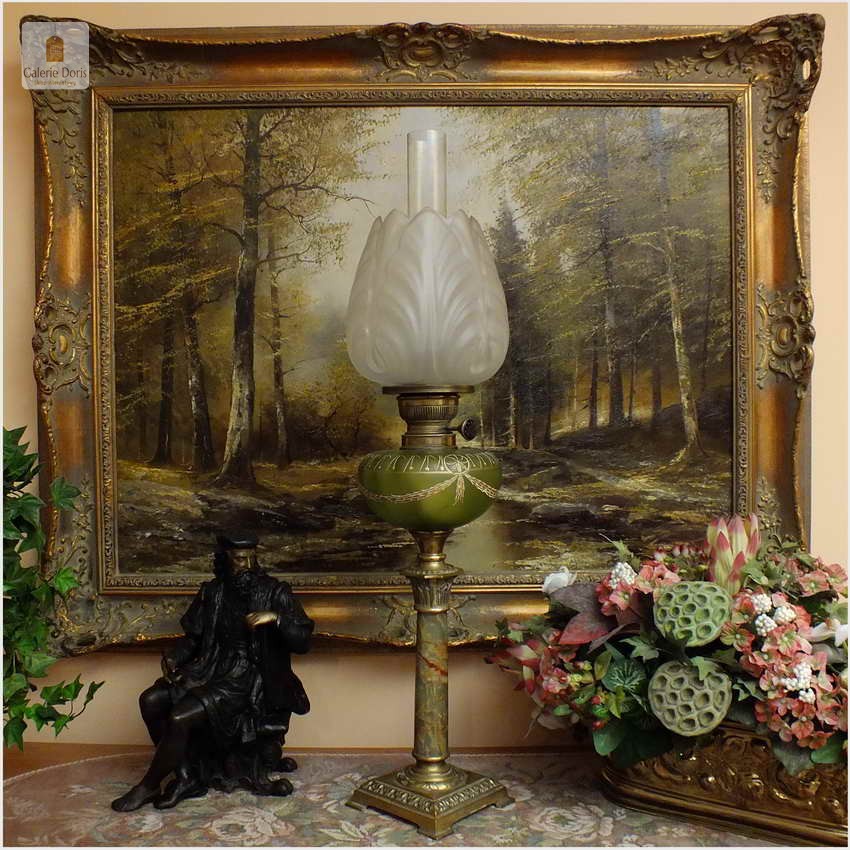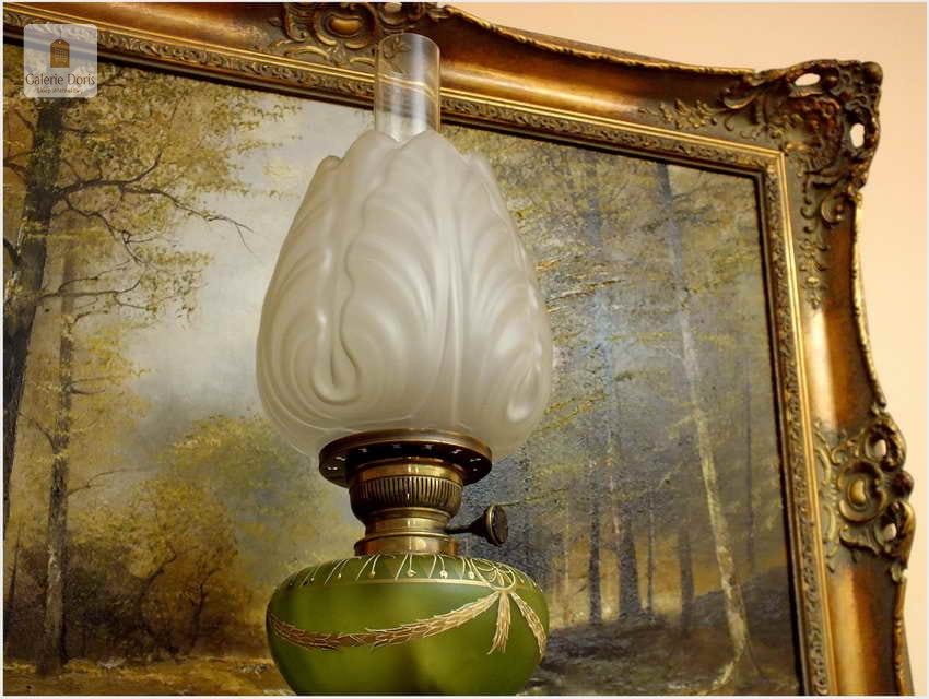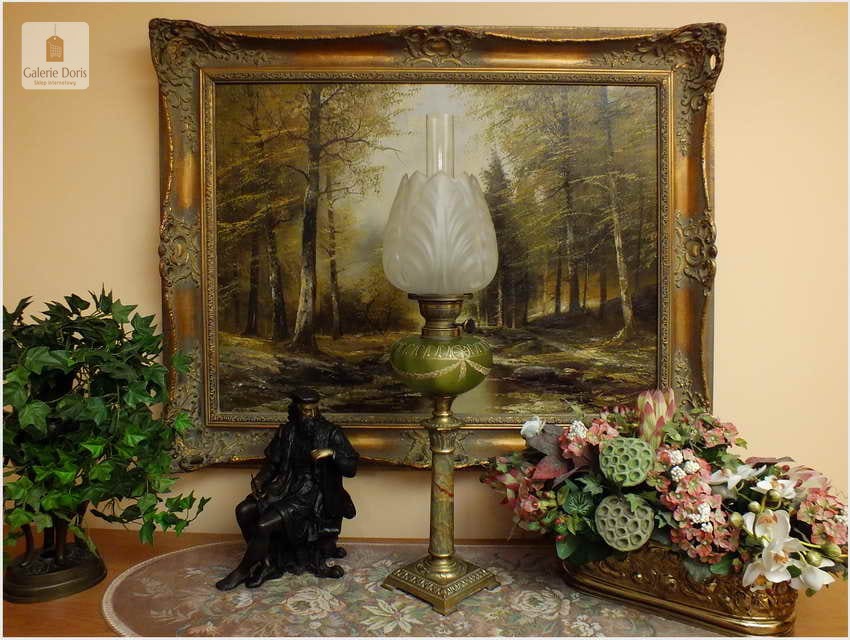 Polecam przepiękną starą secesyjną lampę naftowa przywiezioną z Francji, lampa sygnowana oraz w pełni sprawna i gotowa do użytkowania. Dopełnieniem jest finezyjnie ręcznie malowany zbiornik na naftę. Palnik zachowany w dobrym technicznie stanie. Wszystkie mechanizmy działają lekko. Podstawa oryginalna z epoki, połączenie brązu z onyx. Lampa będzie z pewnością pięknym eksponatem w Państwa kolekcji, domu...