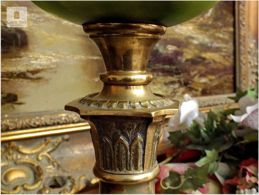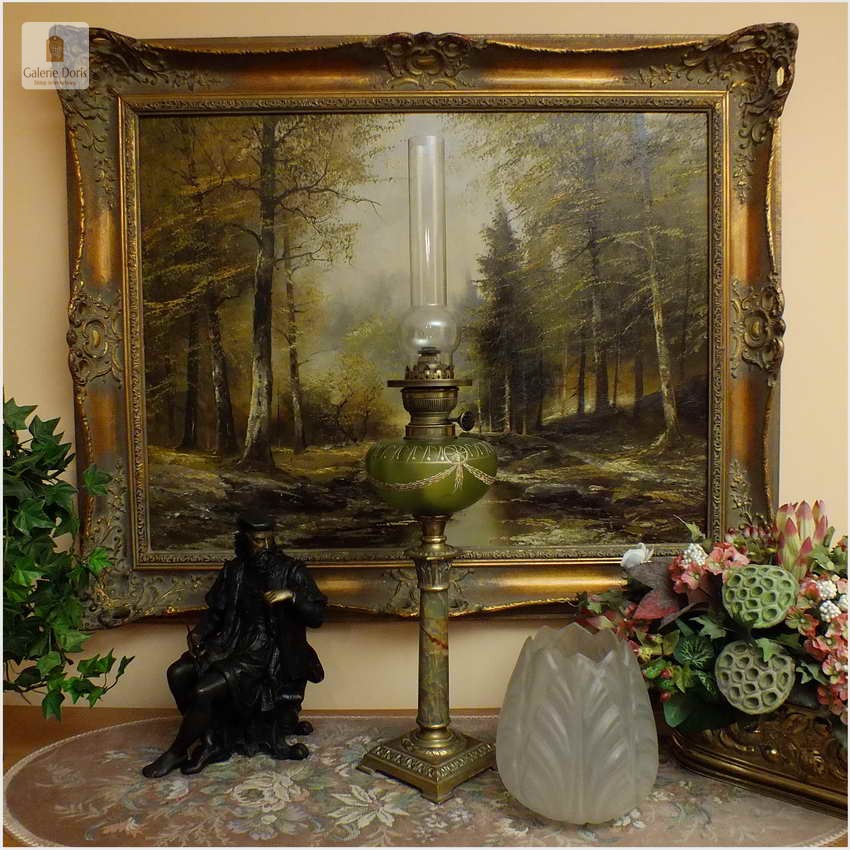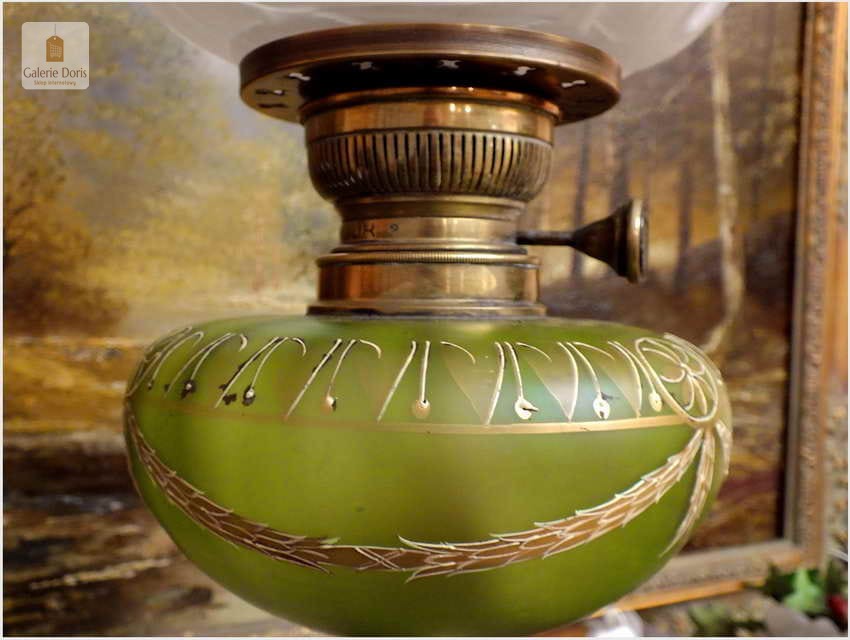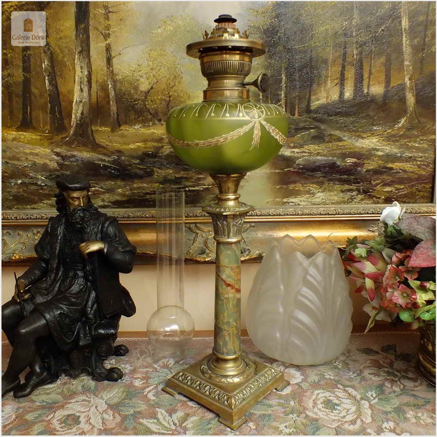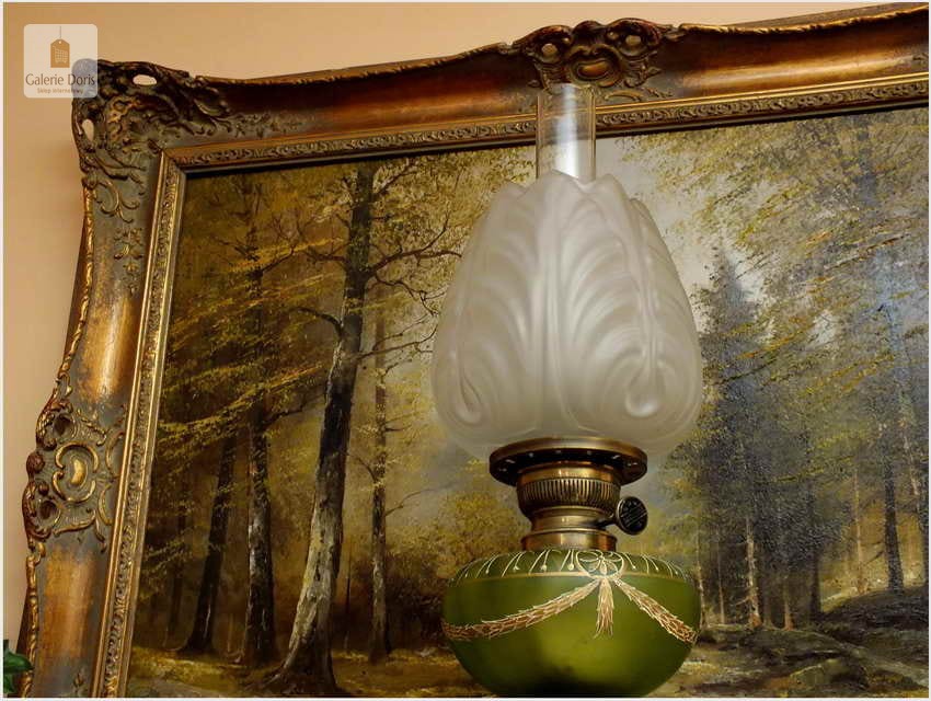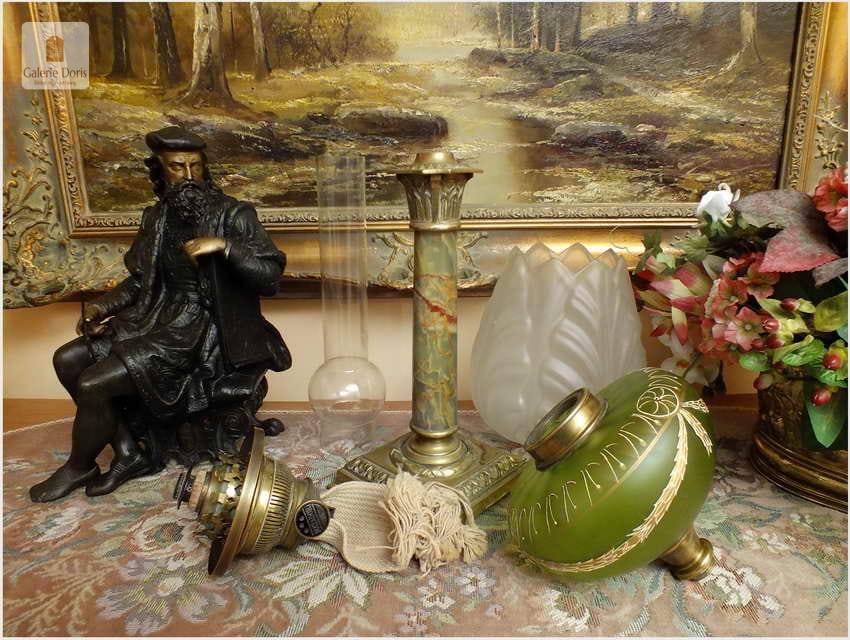Polecam przepiękną starą secesyjną lampę naftowa przywiezioną z Francji, lampa sygnowana oraz w pełni sprawna i gotowa do użytkowania. Dopełnieniem jest finezyjnie ręcznie malowany zbiornik na naftę. Palnik zachowany w dobrym technicznie stanie. Wszystkie mechanizmy działają lekko. Podstawa oryginalna z epoki, połączenie brązu z onyx. Lampa będzie z pewnością pięknym eksponatem w Państwa kolekcji, domu...