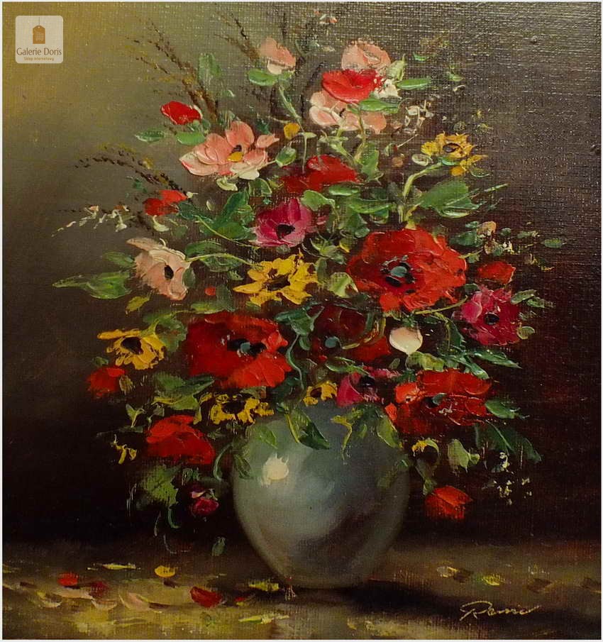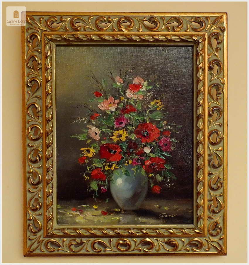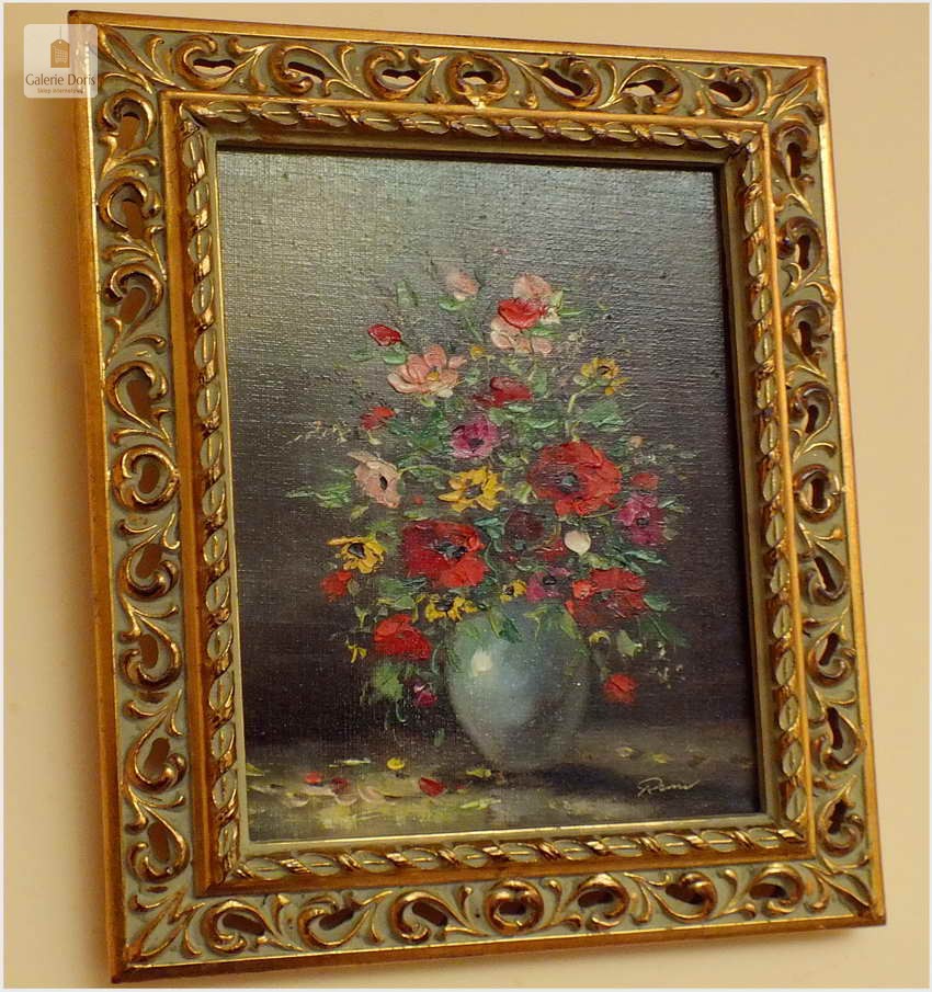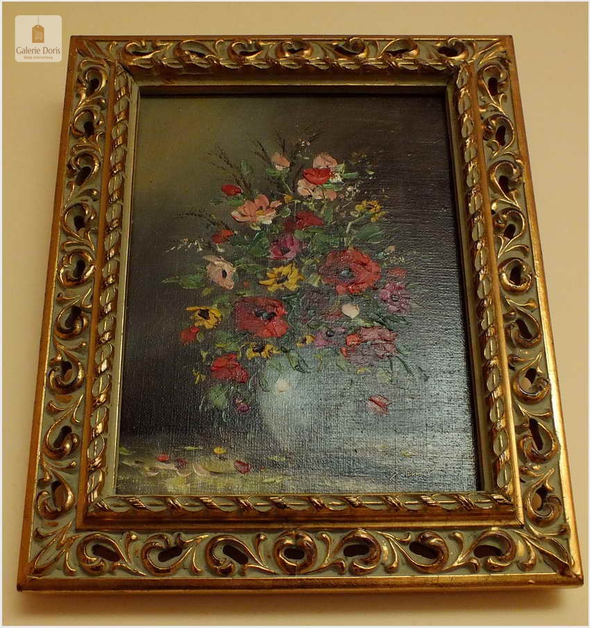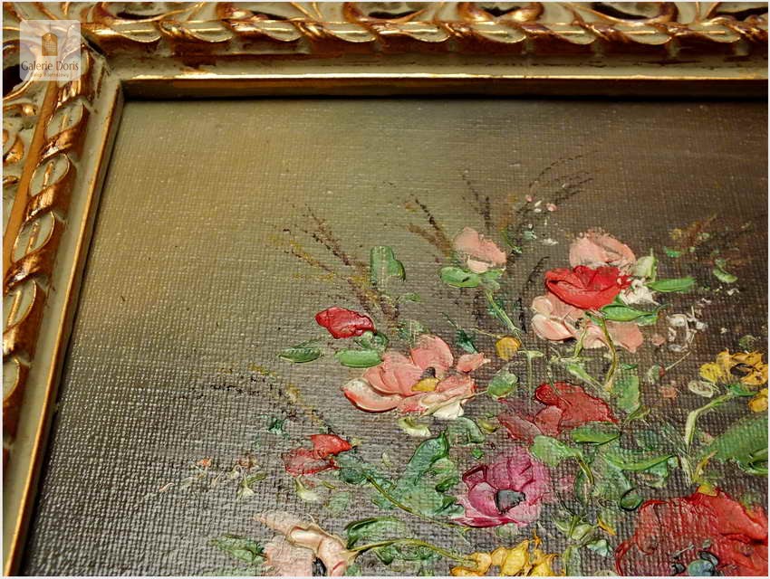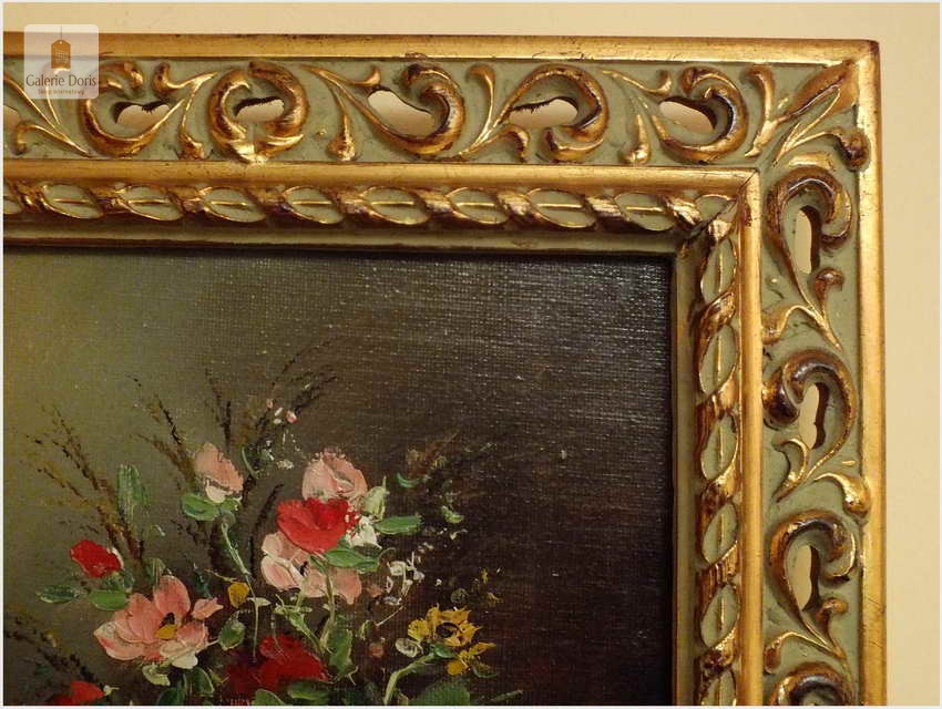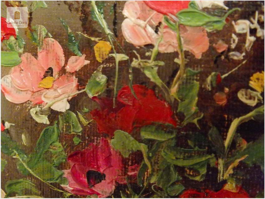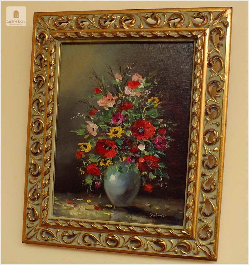 Polecamy uroczy bukiet kwiatów w niebieskim pękatym wazonie. Cudnie i niebywale sugestywnie oddano zachwycającą urodę pełnych witalności kwiatów. Wspaniała plastyczność roślin oraz wysmakowana gra kontrastowych barw cechują tą martwą naturę. Znakomite efekty światłocieniowe przydają drugiemu planowi głębi. Obraz odznacza się pełnymi ekspresji pociągnięciami pędzla oraz brawurową fakturą malarską. Struktura grubo kładzionej farby bardzo wyraźnie widoczna i wyczuwalna pod palcami. Powierzchnię malatury pokrywa warstwa werniksu. Cechuje go świetna technika. Cukiereczek w pałacowej ażurowej drewnianej ramie -Polecamy!