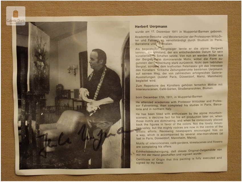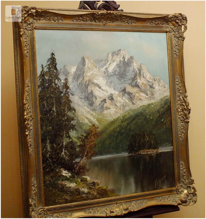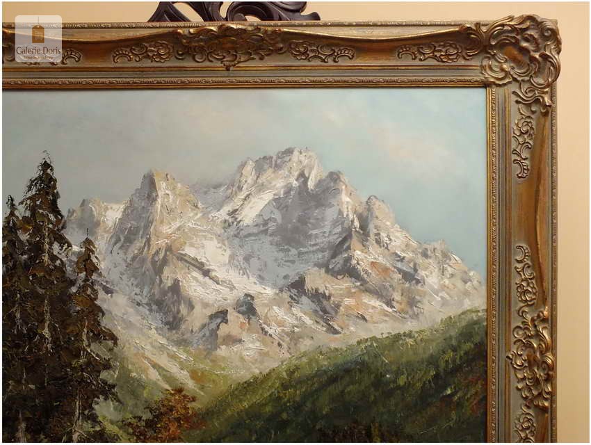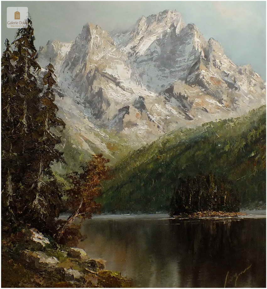 Polecamy obraz malowany techniką szpachlową olejem na płótnie znanego malarza niemieckiego Herberta Uerpmanna, obraz sygnowany w dolnym rogu. Po jakości i ruchach pędzla widać kunszt i profesjonalizm dzieła. Urodził się w Wuppertal-Bremen studiował w szkole artystycznej Barmen Wiethüchter u profesorów: Gustav i Ludwig Fahrenkrog, wiele wyjazdów studyjnych w całej Europie, Wielokrotnie katalogowany i wymieniony w odpowiednich prestiżowych katalogach o malarstwie. Malarz na obrazie ukazuje swoją fascynację do krajobrazów alpejskich. Wyraża to naturalnym kolorem, światłem oraz wirtuozerią szpachli i pędzla. Polecamy!