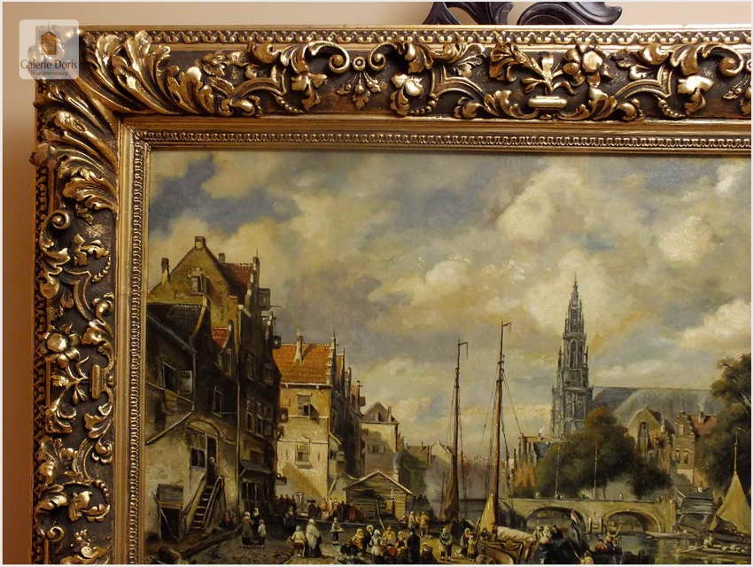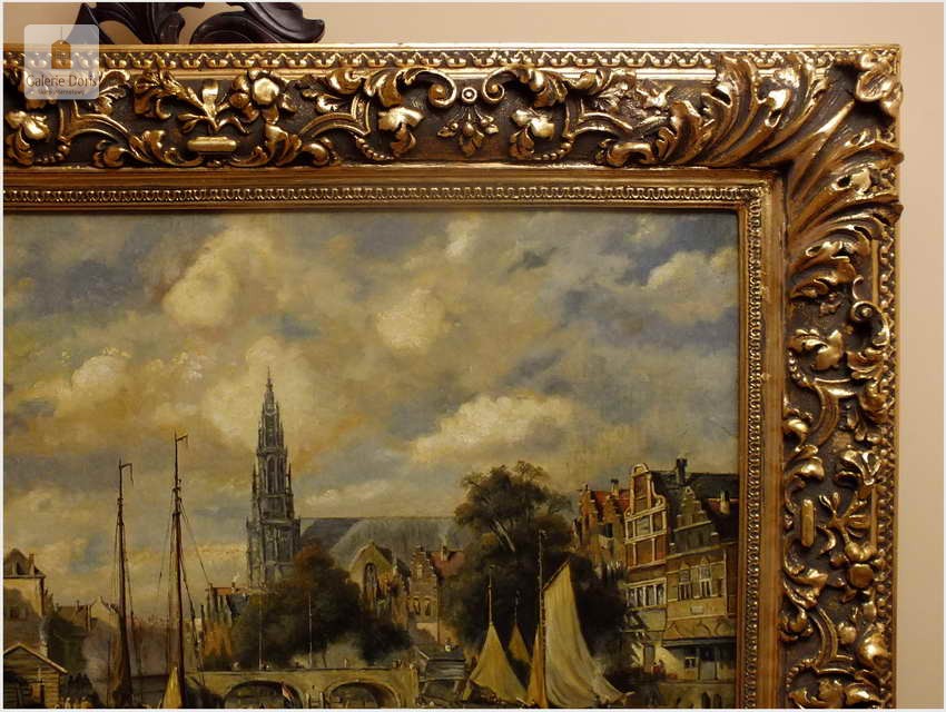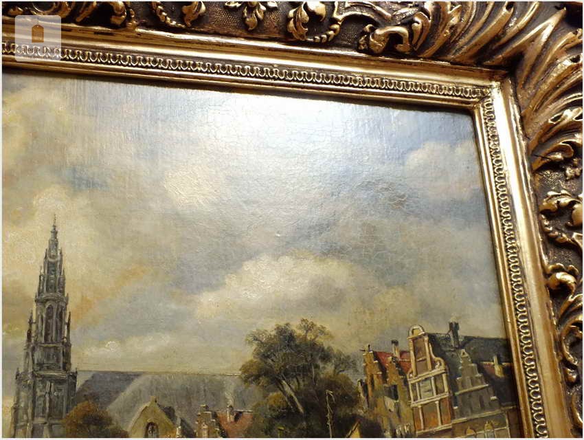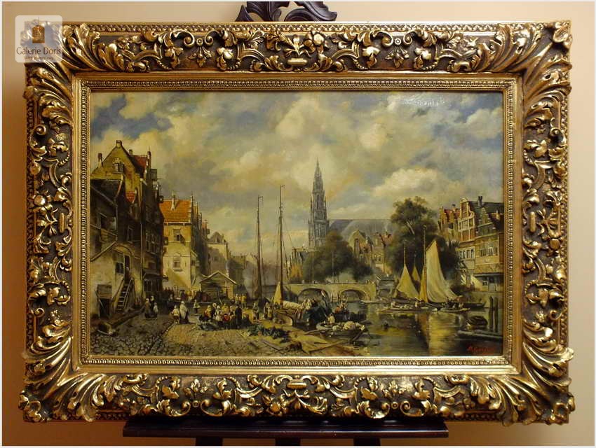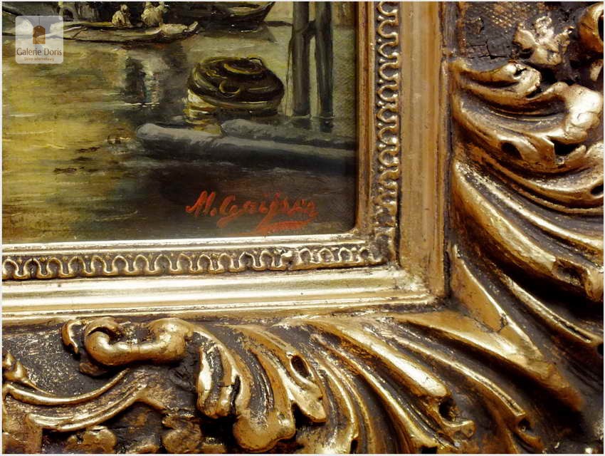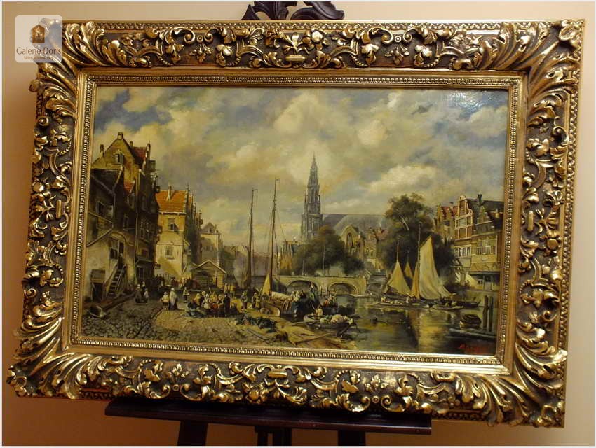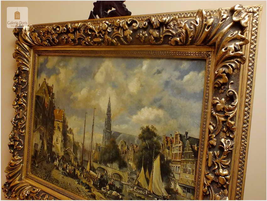 Polecamy wytworne pałacowe malarstwo, obraz olejny na płótnie sygnowany w prawym dolnym rogu M.Gaisser. Malarz przedstawił nam scenę rodzajową rozgrywającą się w klimacie XVII wiecznej Flandrii nad kanałem w Andwerpii (Belgia). W centralnej części widać stojącą do dziś Katedrę NMP (Najświętszej Marii Panny). Jest to najstarszy gotycki obiekt sakralny, najwyższy w europie. Płótno bez uszkodzeń po odczyszczeniu z położeniem werniksu. Barokowa rama po naprawie w pracowni ramiarskiej polegającej na ponownym położeniu ubytków w technice płatkowej złota (pozłotnictwo). Całość prezentuje się wspaniale, biografia przypisana na podstawie sygnatury. Obraz należy zaliczyć do dobrego nurtu malarstwa pałacowego.