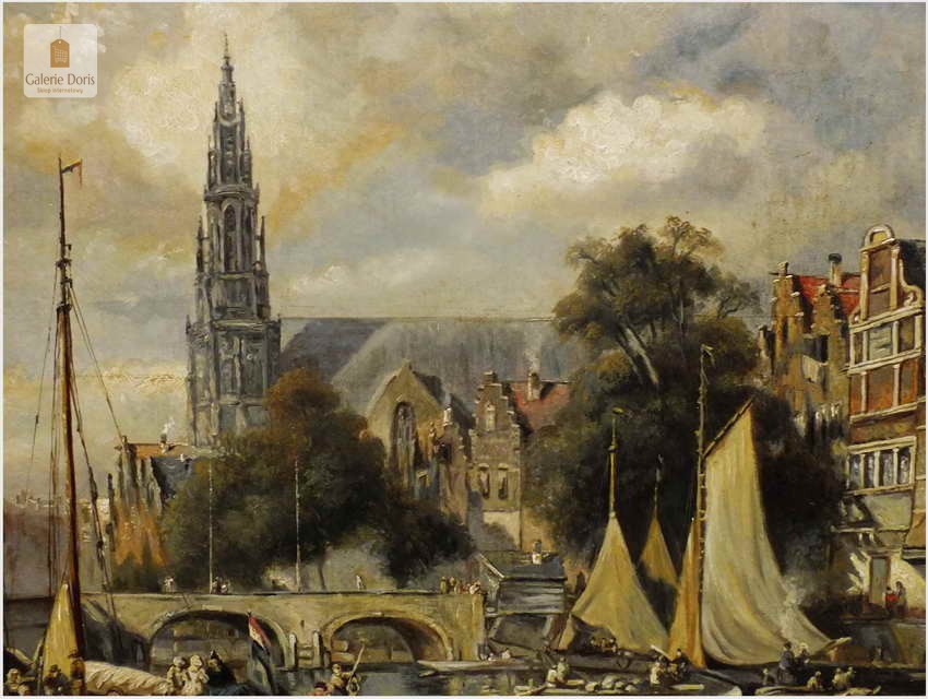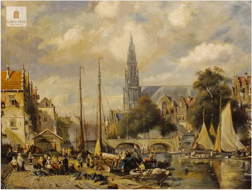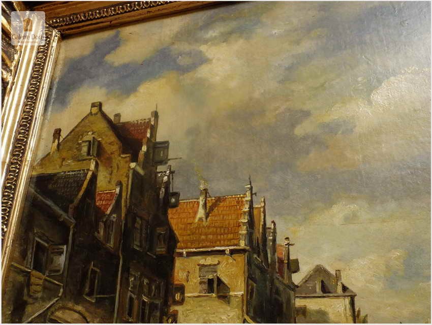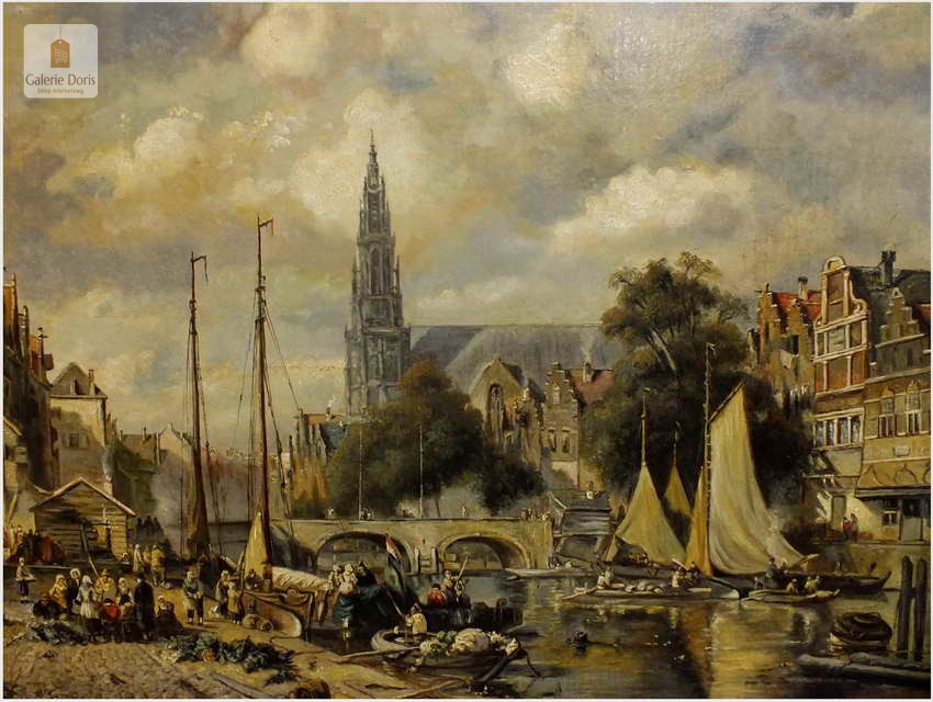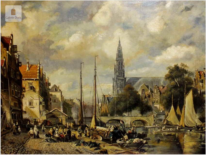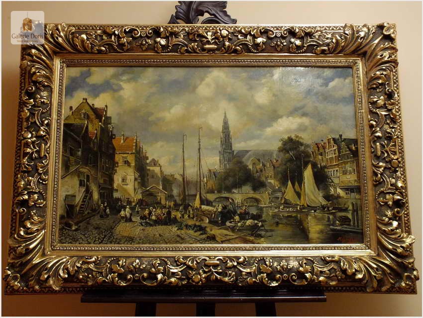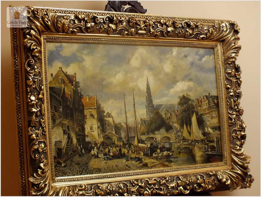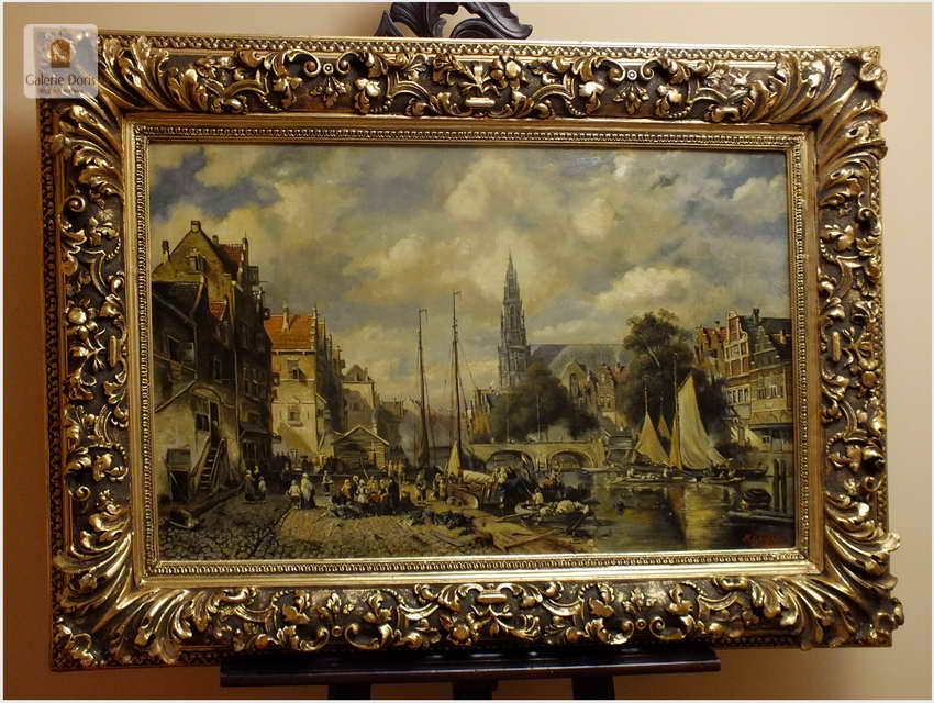 Polecamy wytworne pałacowe malarstwo, obraz olejny na płótnie sygnowany w prawym dolnym rogu M.Gaisser. Malarz przedstawił nam scenę rodzajową rozgrywającą się w klimacie XVII wiecznej Flandrii nad kanałem w Andwerpii (Belgia). W centralnej części widać stojącą do dziś Katedrę NMP (Najświętszej Marii Panny). Jest to najstarszy gotycki obiekt sakralny, najwyższy w europie. Płótno bez uszkodzeń po odczyszczeniu z położeniem werniksu. Barokowa rama po naprawie w pracowni ramiarskiej polegającej na ponownym położeniu ubytków w technice płatkowej złota (pozłotnictwo). Całość prezentuje się wspaniale, biografia przypisana na podstawie sygnatury. Obraz należy zaliczyć do dobrego nurtu malarstwa pałacowego.