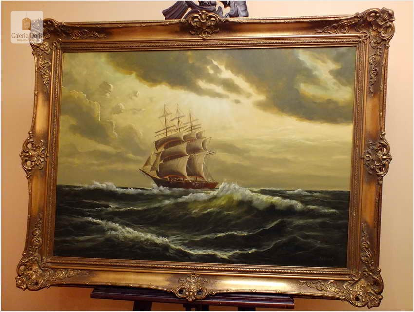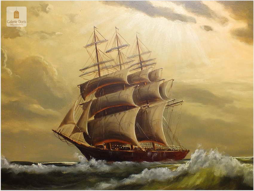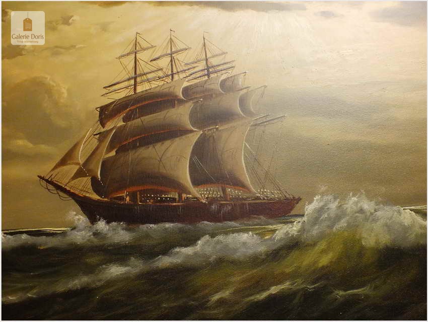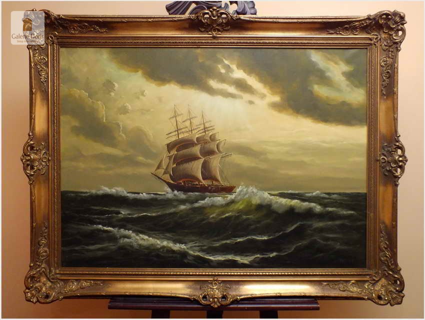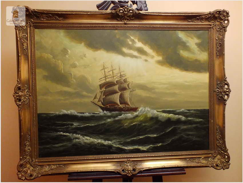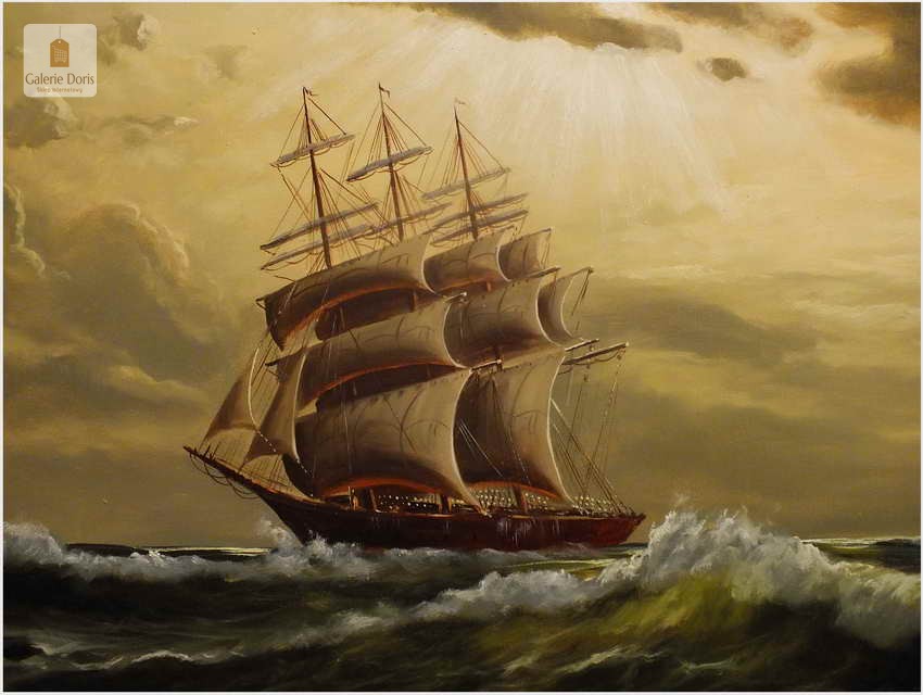Polecamy dużych rozmiarów, poprawnie namalowany obraz marynistyczny z żaglowcem  na pełnych żaglach. Piękny, żywy! Grubo malowany. Sygnowany w prawym dole podpisem artysty, Horster. Polecamy!