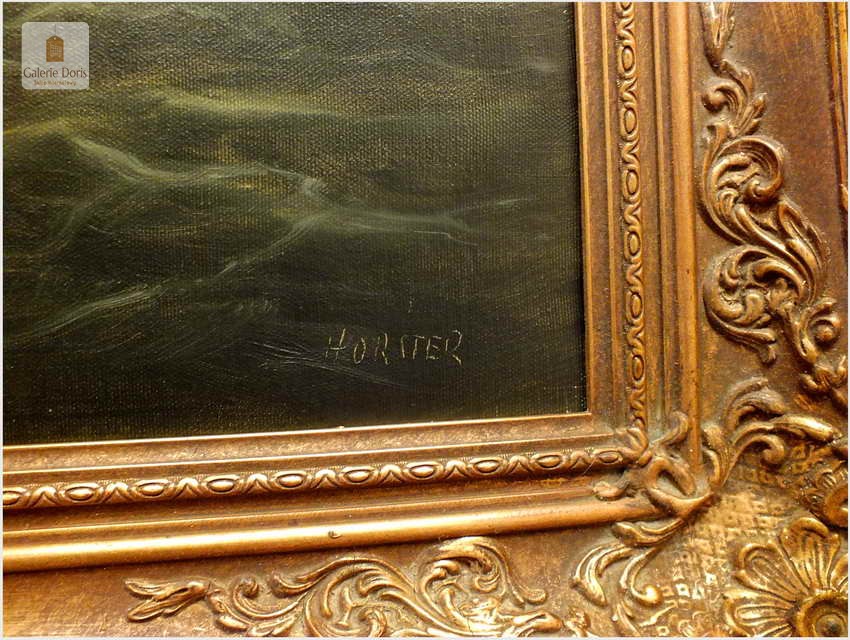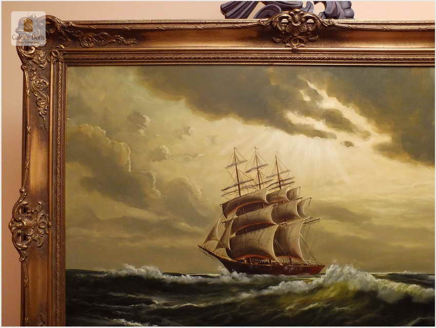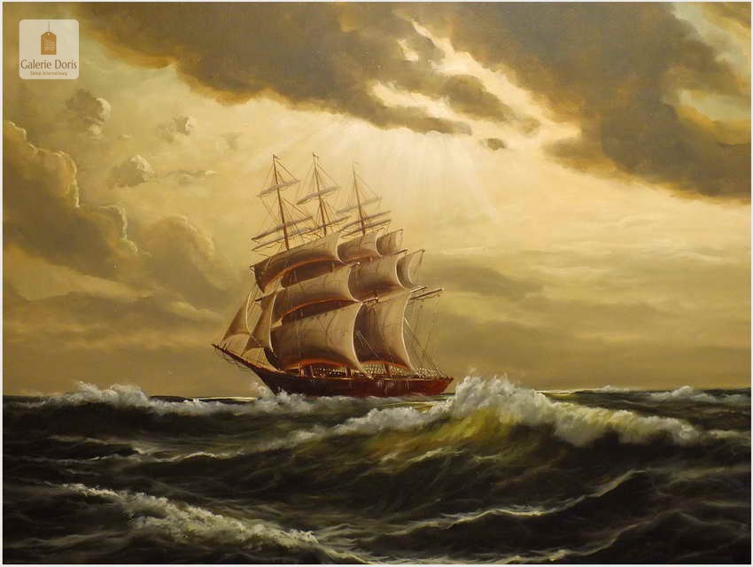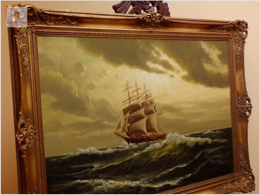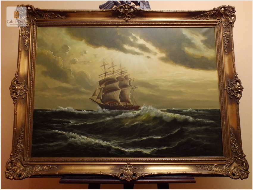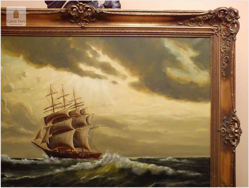 Polecamy dużych rozmiarów, poprawnie namalowany obraz marynistyczny z żaglowcem  na pełnych żaglach. Piękny, żywy! Grubo malowany. Sygnowany w prawym dole podpisem artysty, Horster. Polecamy!