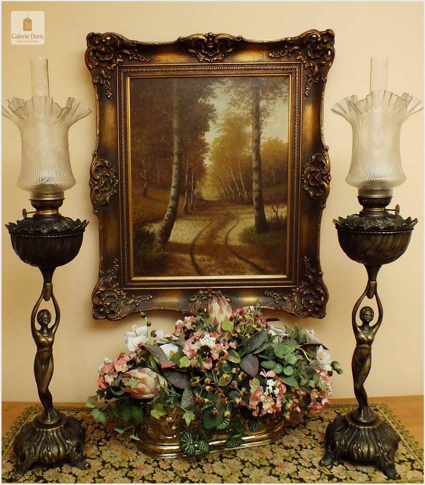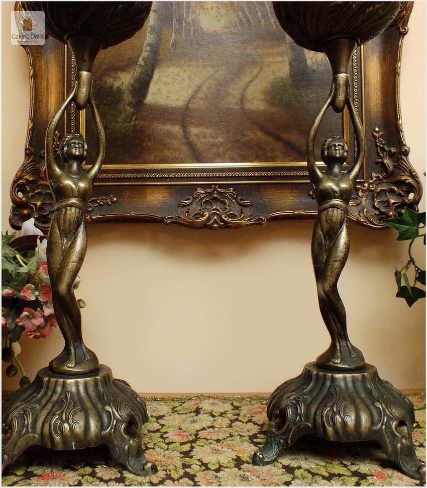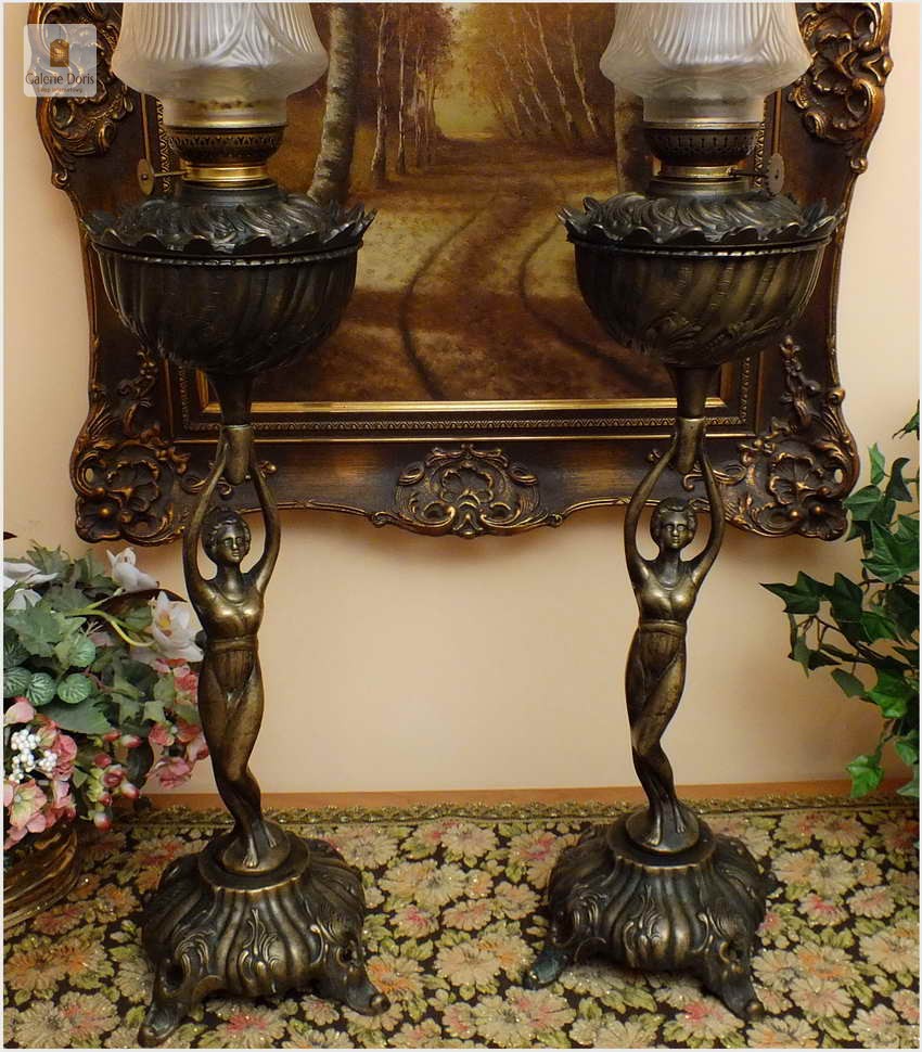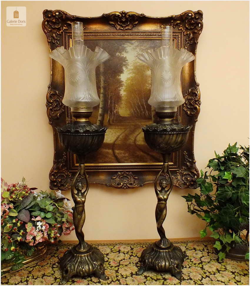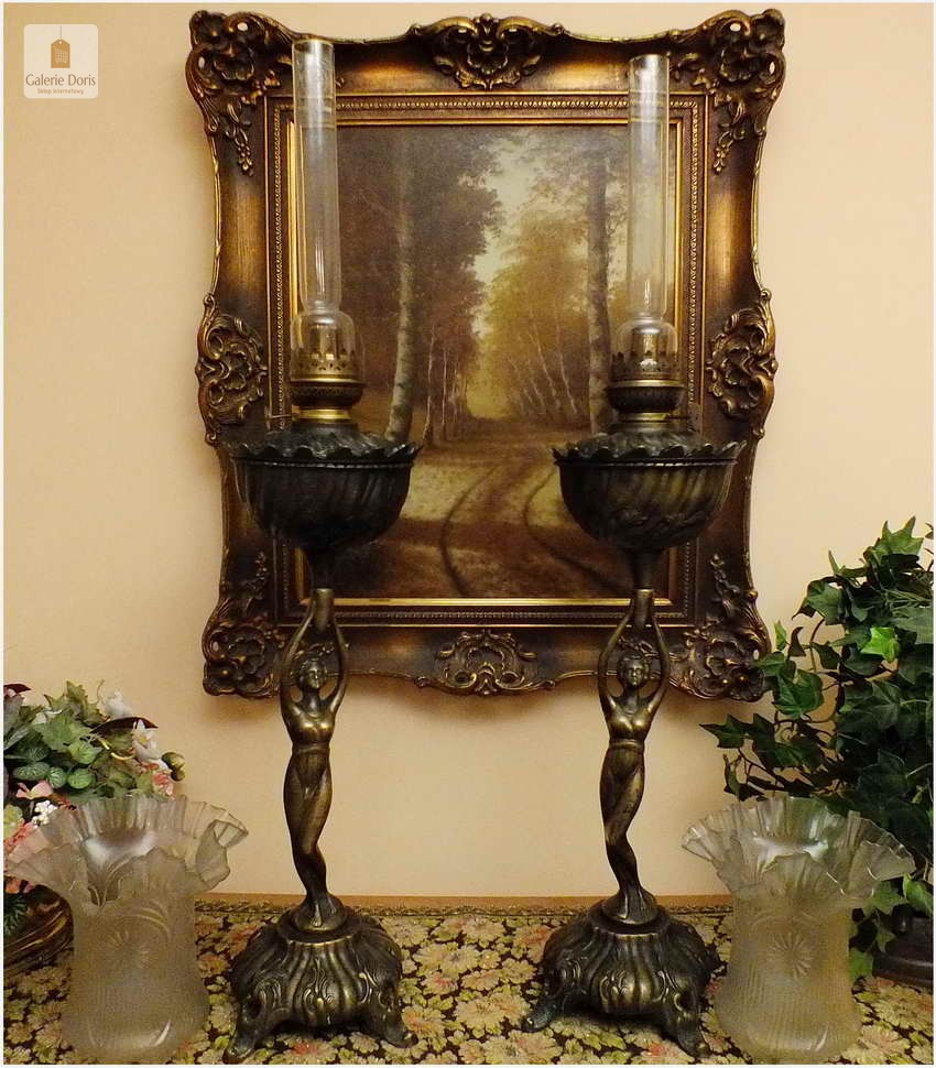 Polecamy komplet lamp figuralnych na naftę (w całości wykonane z brązu). Piękny dekor w pełni użytkowy. Lampy idealne jako uzupełnienie boczne kominków, komody… Posiadają sprawne brennery oraz secesyjne sygnowane szkła. Polecamy!