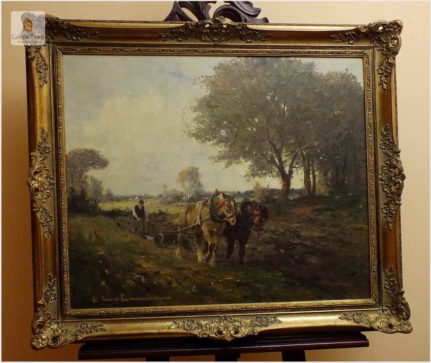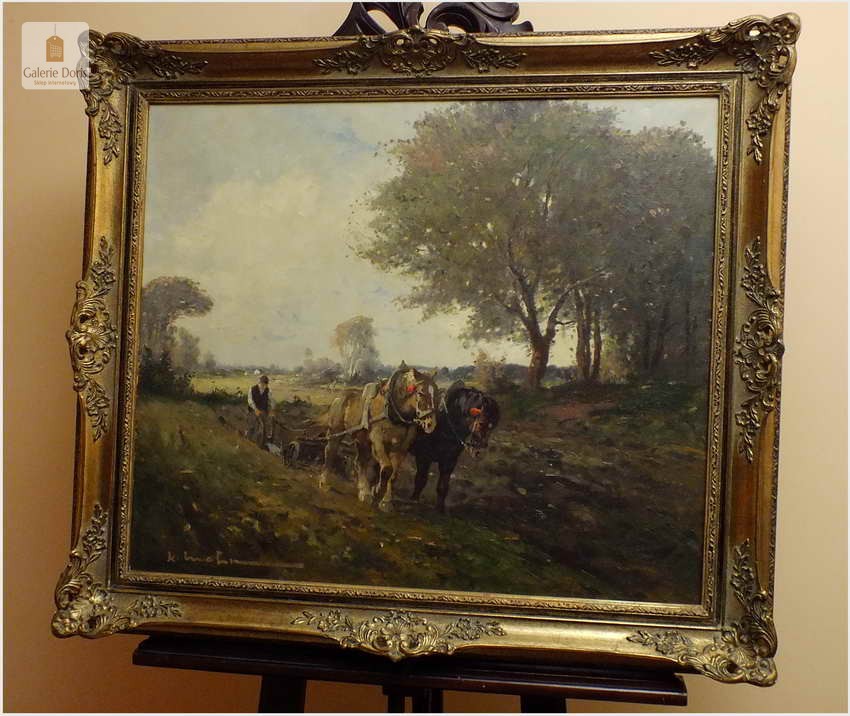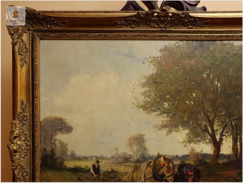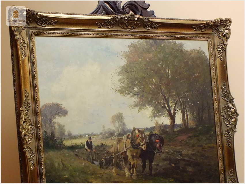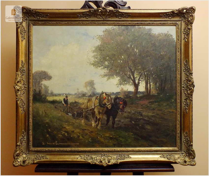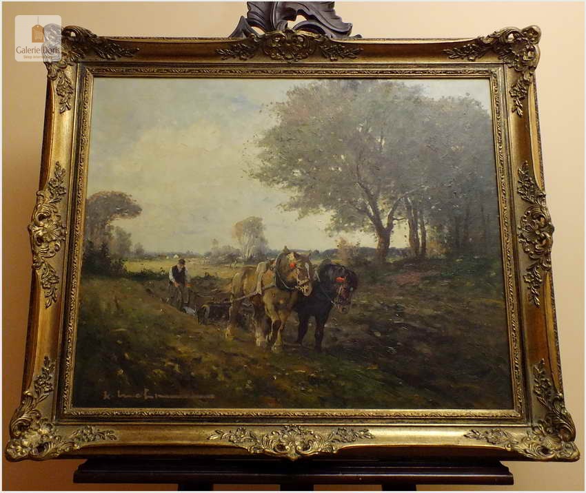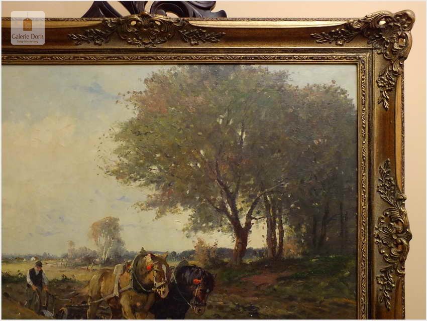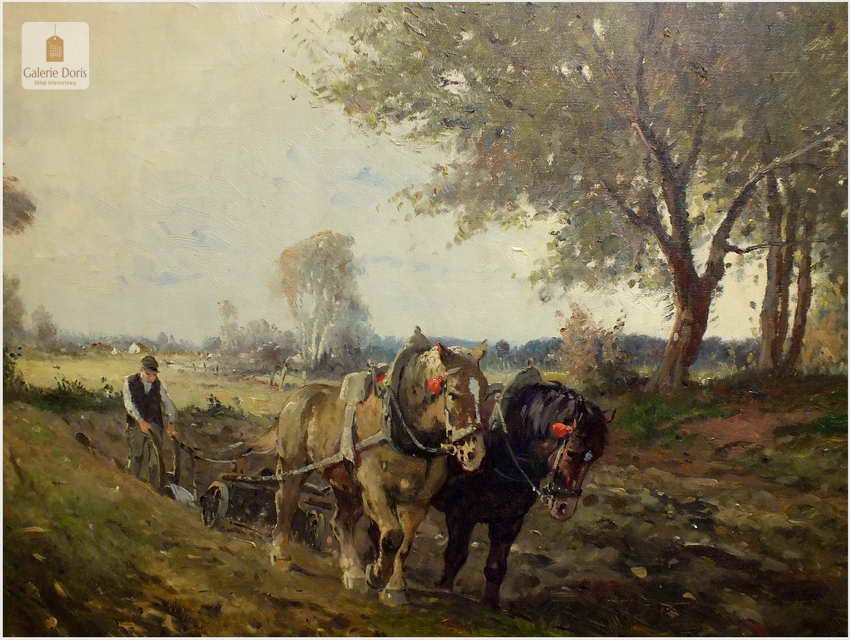 Tematykę orania pola przez woły czy konie ciągnące pług w malarstwie europejskim podejmowało wielu malarzy. Warto tutaj wspomnieć choćby o obrazach, którym wprost artyści nadawali tytuł Orka, jak Leon Wyczółkowski czy Stanisław Witkiewicz, a także parodię tematu przedstawioną przez Witolda Wojtkiewicza. Oferowany obraz o tematyce wiejskiej podejmowało welu zagranicznych malarzy z tymi największymi włącznie. Przedstawiamy jeden z nich - obraz z wieśniakiem, który o świtaniu orze pługiem, konie dwa ciągną żelazo i czarne odwalające w skiby humusową ziemię. Jest w tym obrazie rzecz, która przyciąga uwagę - zgrzyt żelaza w pługu, stąpanie ciężkich końskich łap, cień i chłód poranny ale świeży, który słońce rozwieje. Obraz w stanie kolekcjonerskim bez uszkodzeń z certyfikatem!.