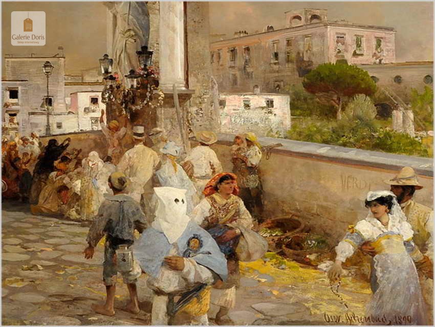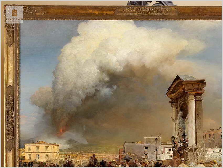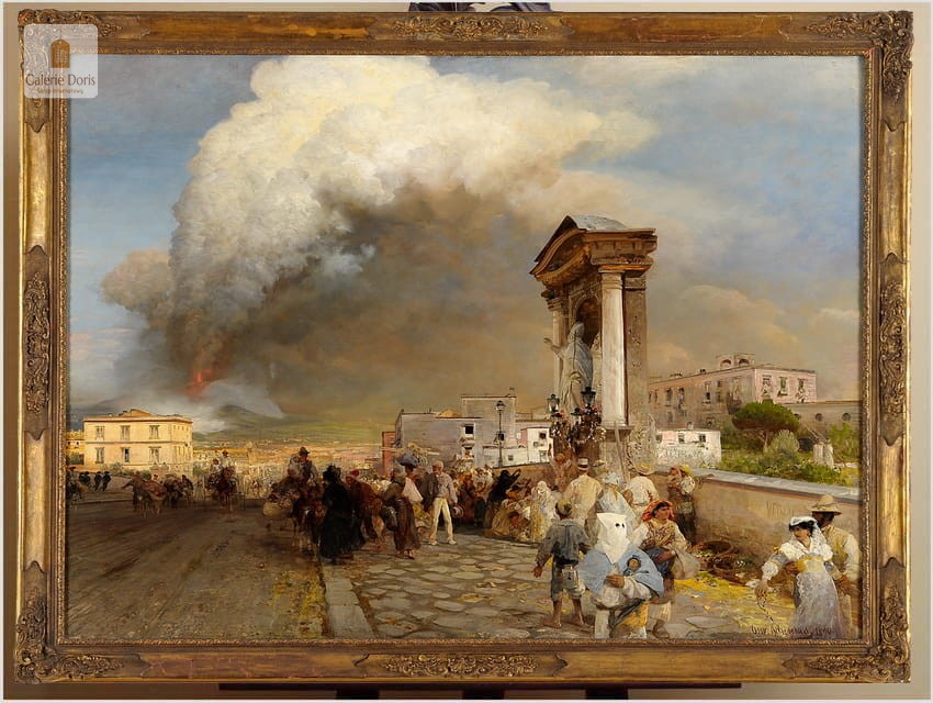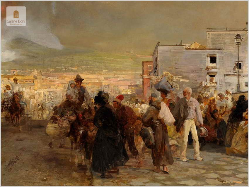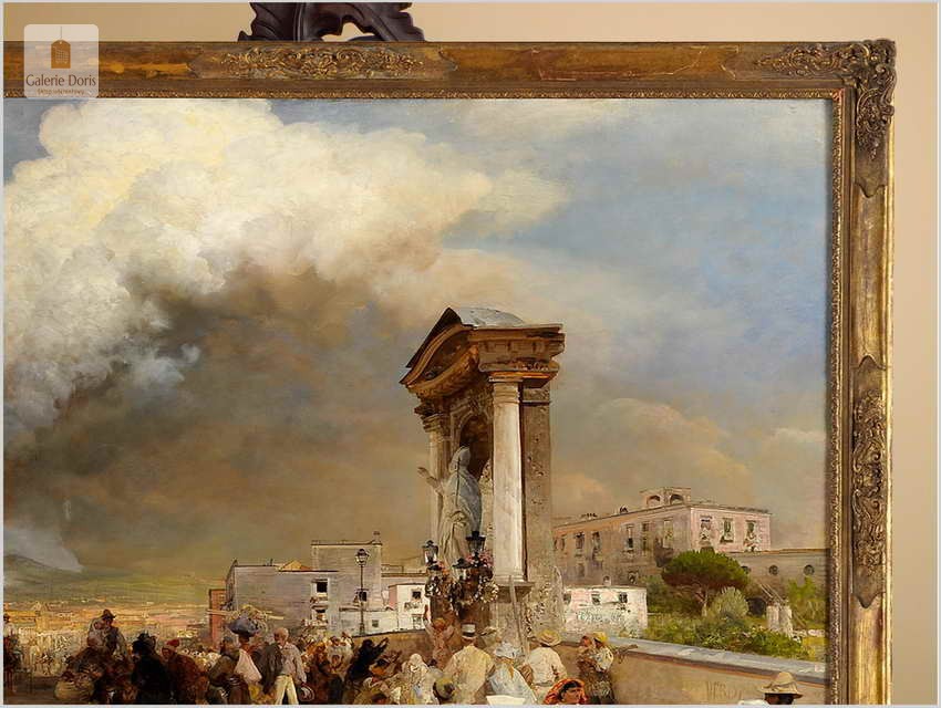 Przedstawiamy duży stary obraz olejny, scenę rodzajową - Wybuch Wezuwiusza. Sygnowany w prawym dolnym rogu Osw Achenbach, oraz datowany 1890. Jego prace prezentowane były na paryskich Salonach, zaś sam twórca wielokrotnie był nagradzany odznaczeniami, otrzymał m.in. Legię Honorową. Polecamy ten obraz znawcą tematu!